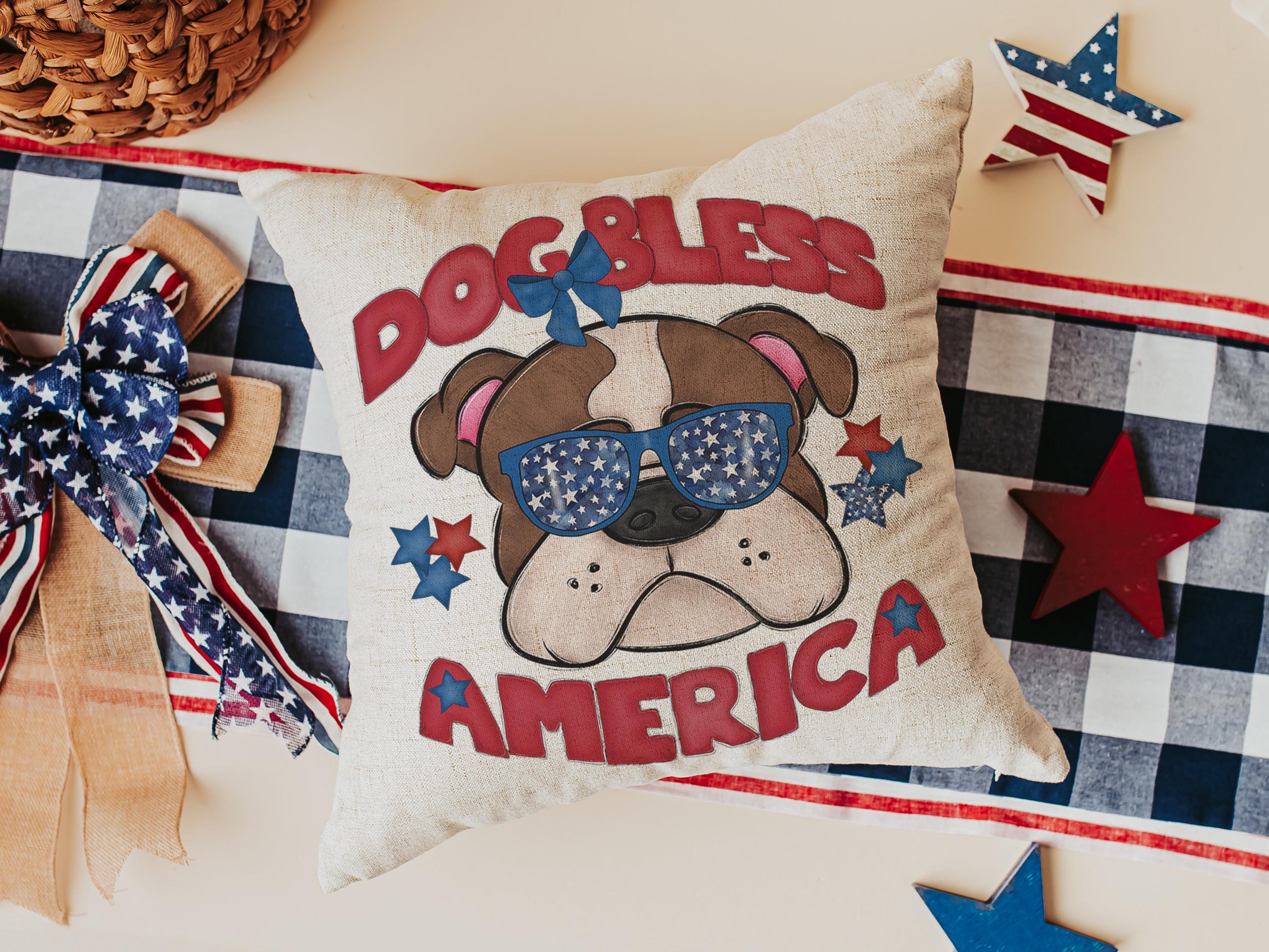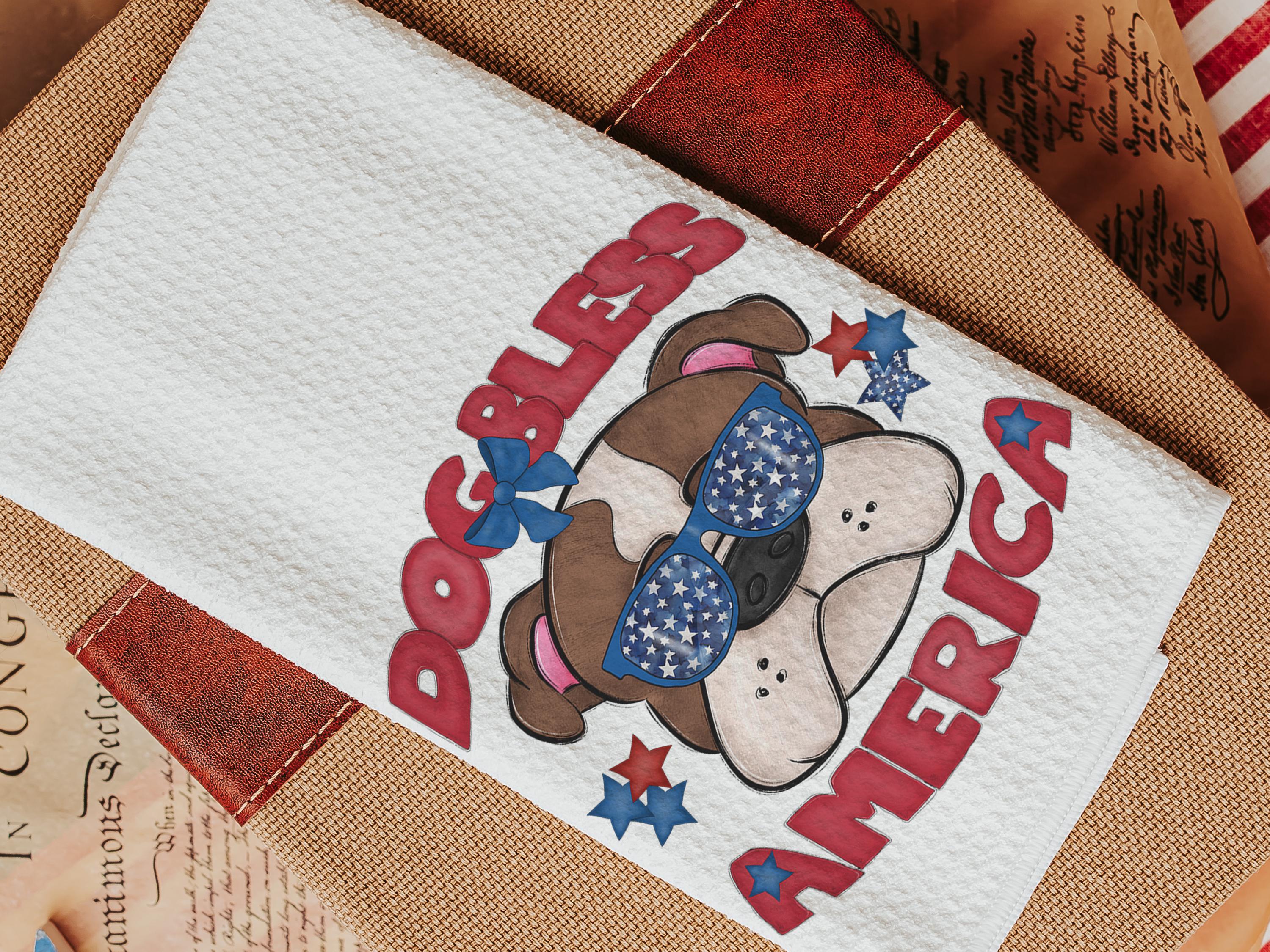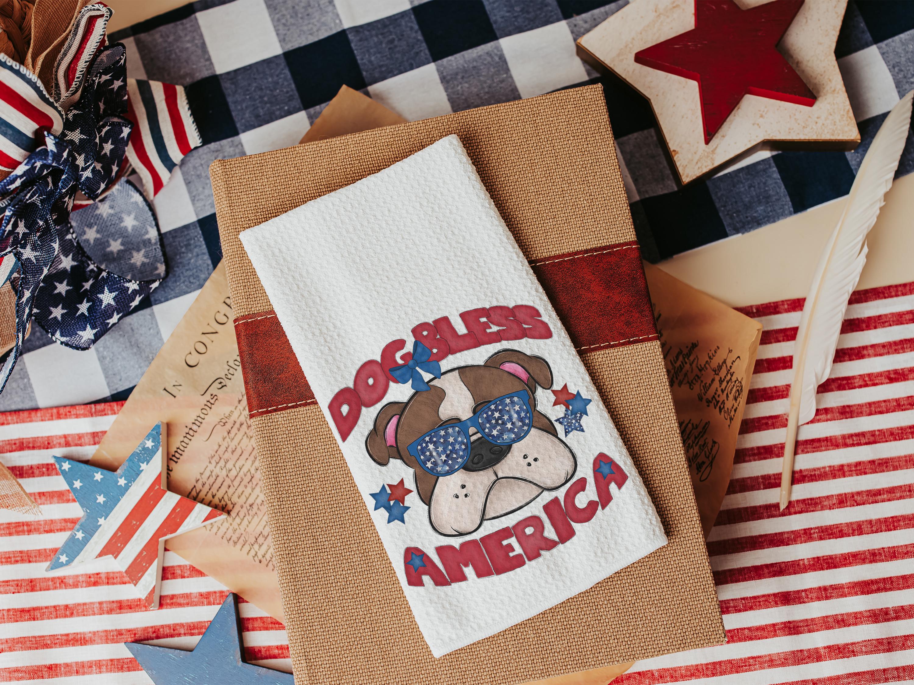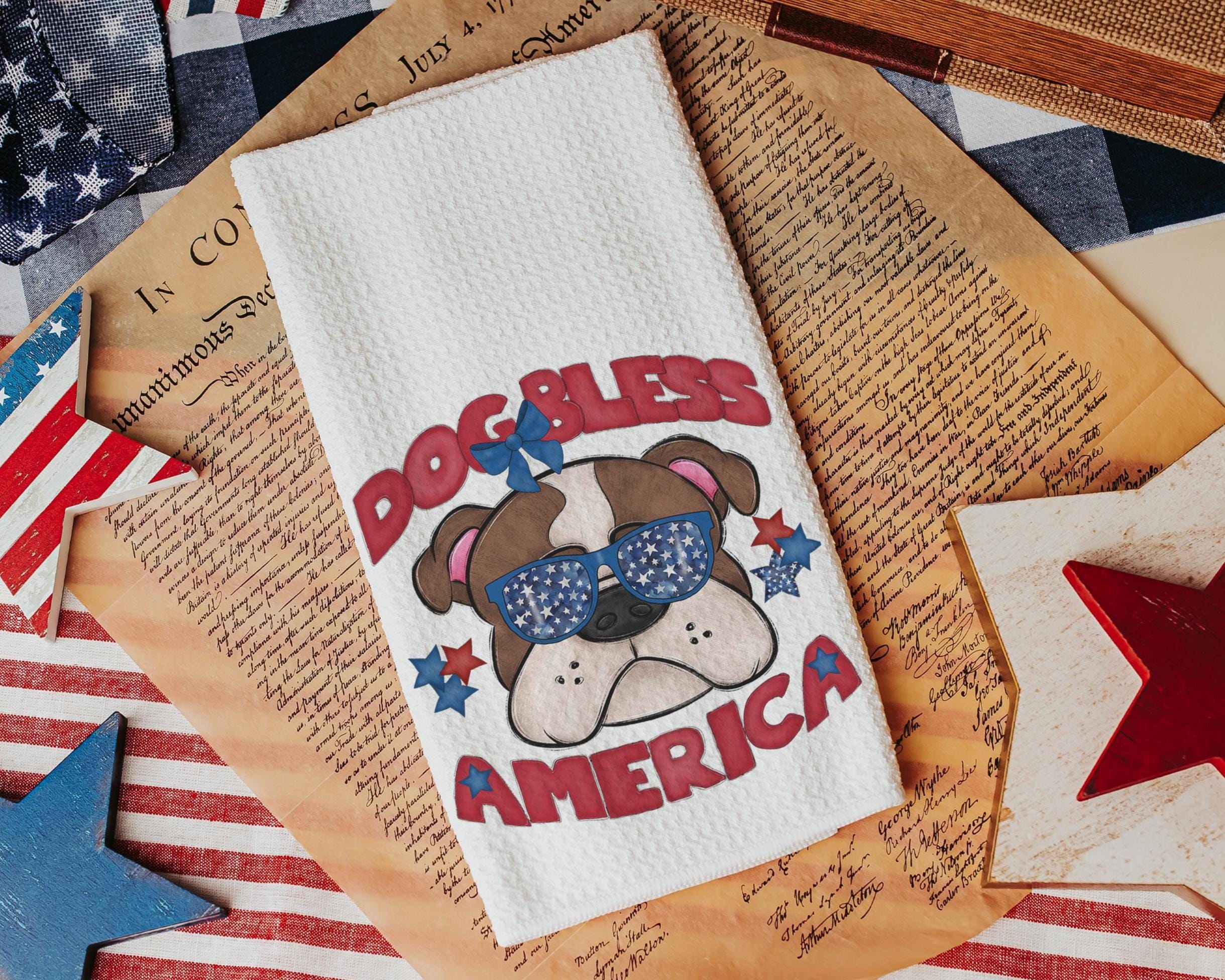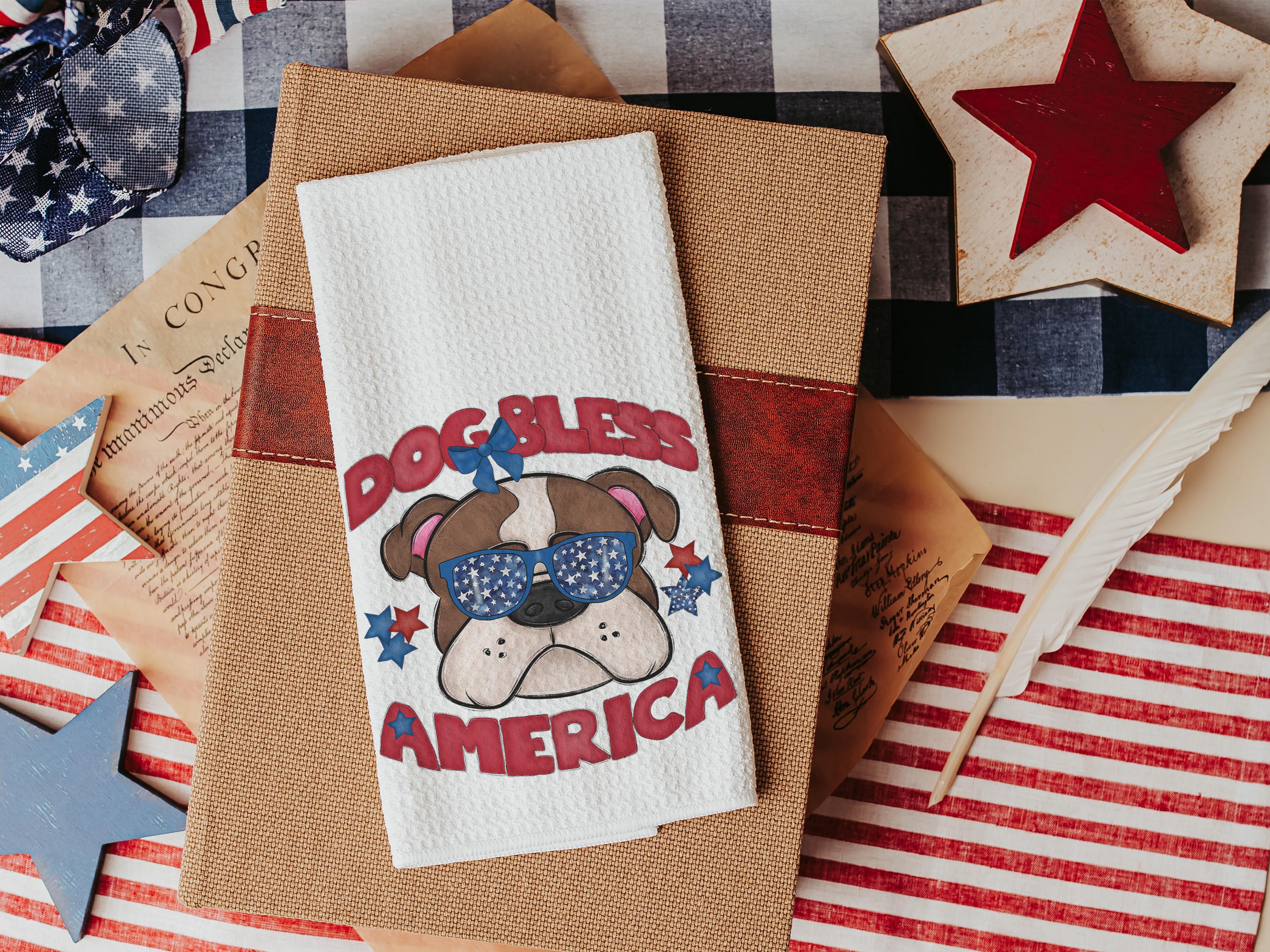 A Dog Bless America Bulldog design in red, white, and blue. Available as a kitchen towel, a matching throw pillow, or together as a set—great for 4th of July BBQs, patriotic kitchen decor, and dog-lover gifts.