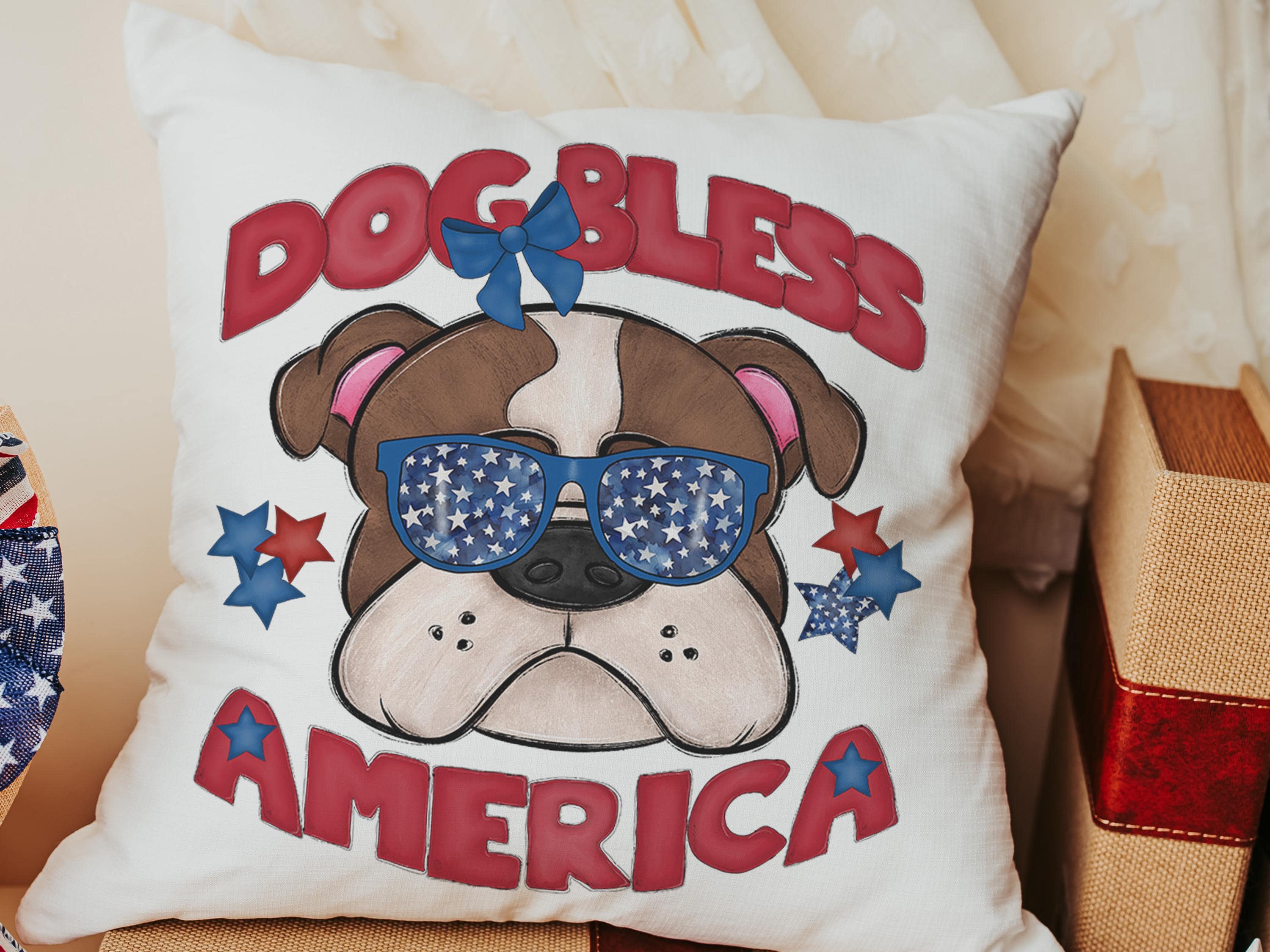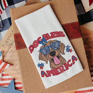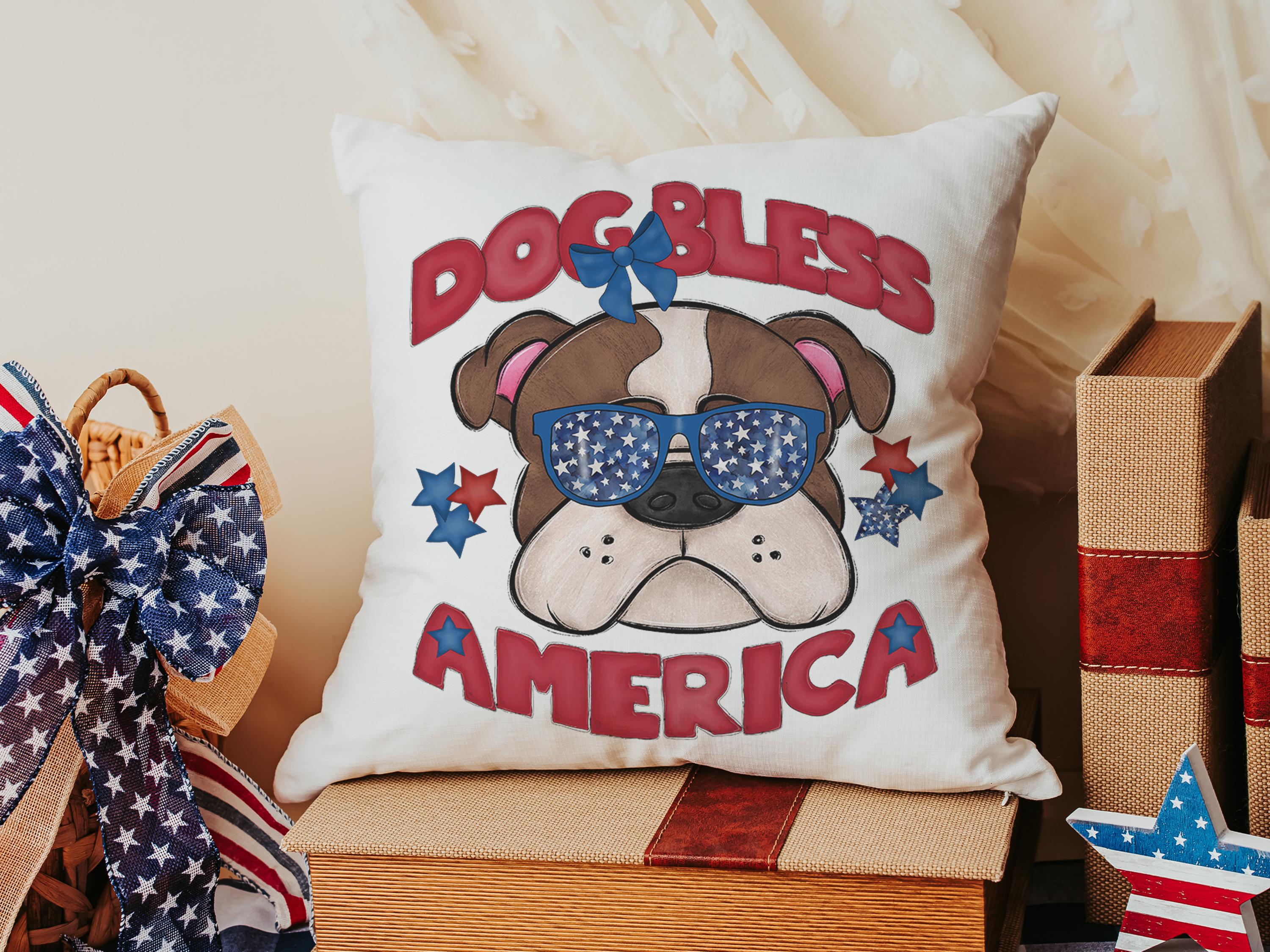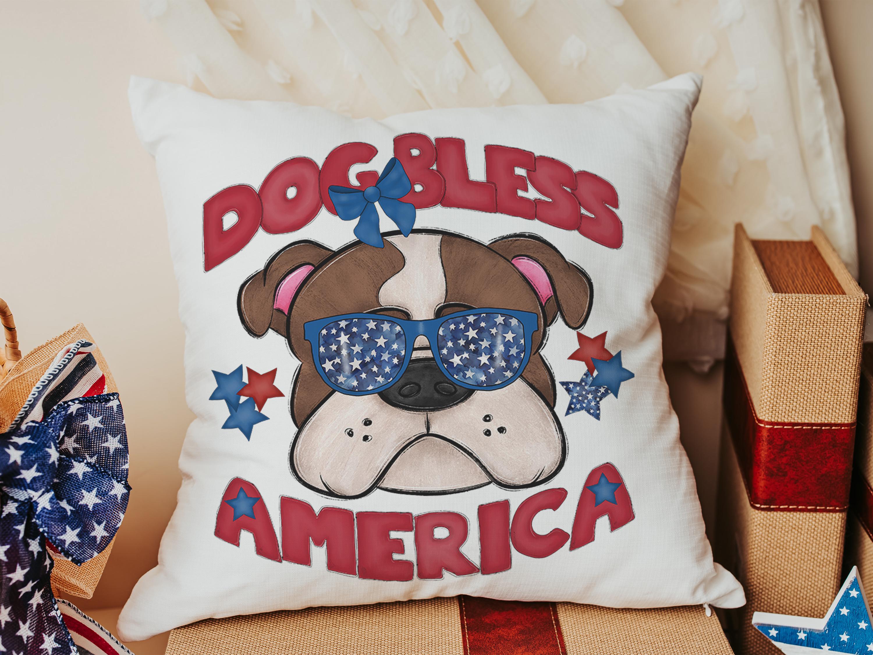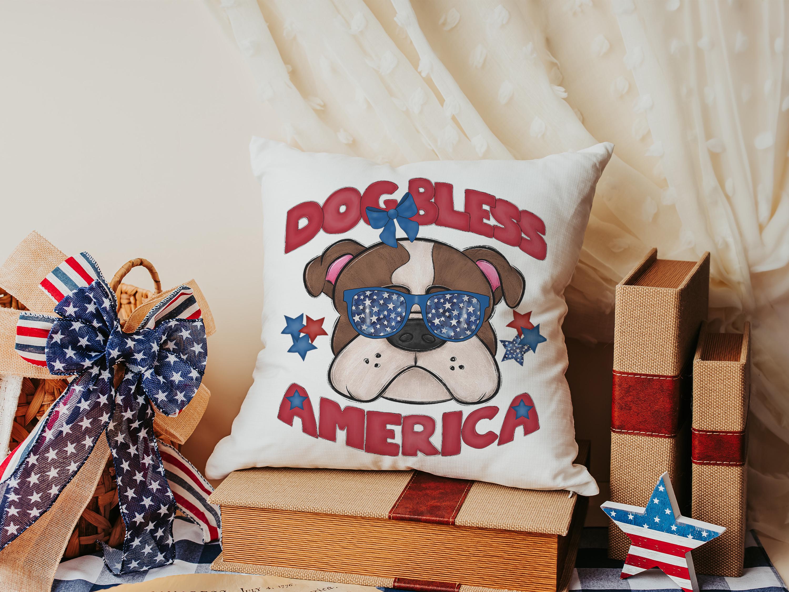 A Dog Bless America Bulldog design in red, white, and blue. Available as a kitchen towel, a matching throw pillow, or together as a set—great for 4th of July BBQs, patriotic kitchen decor, and dog-lover gifts.