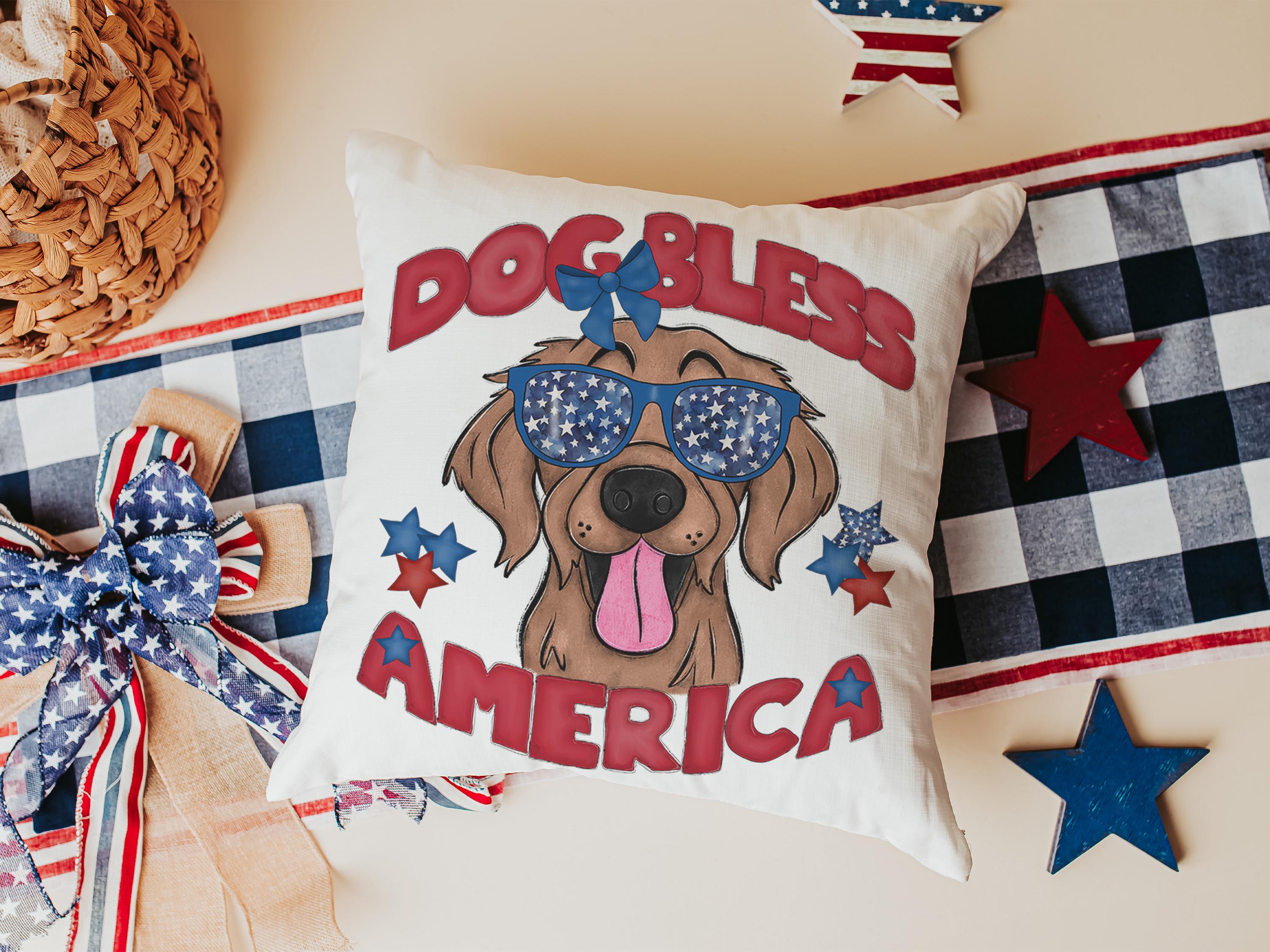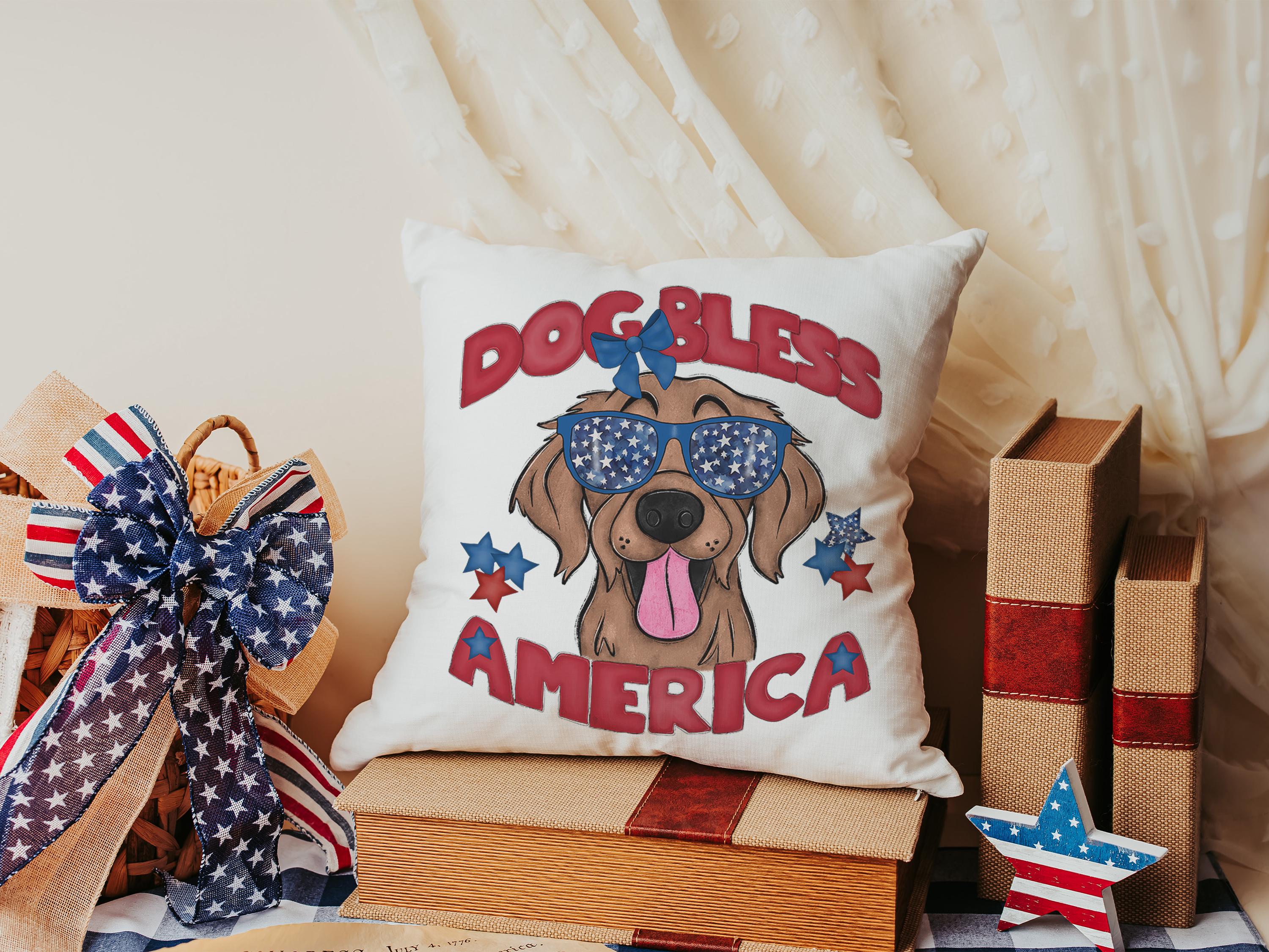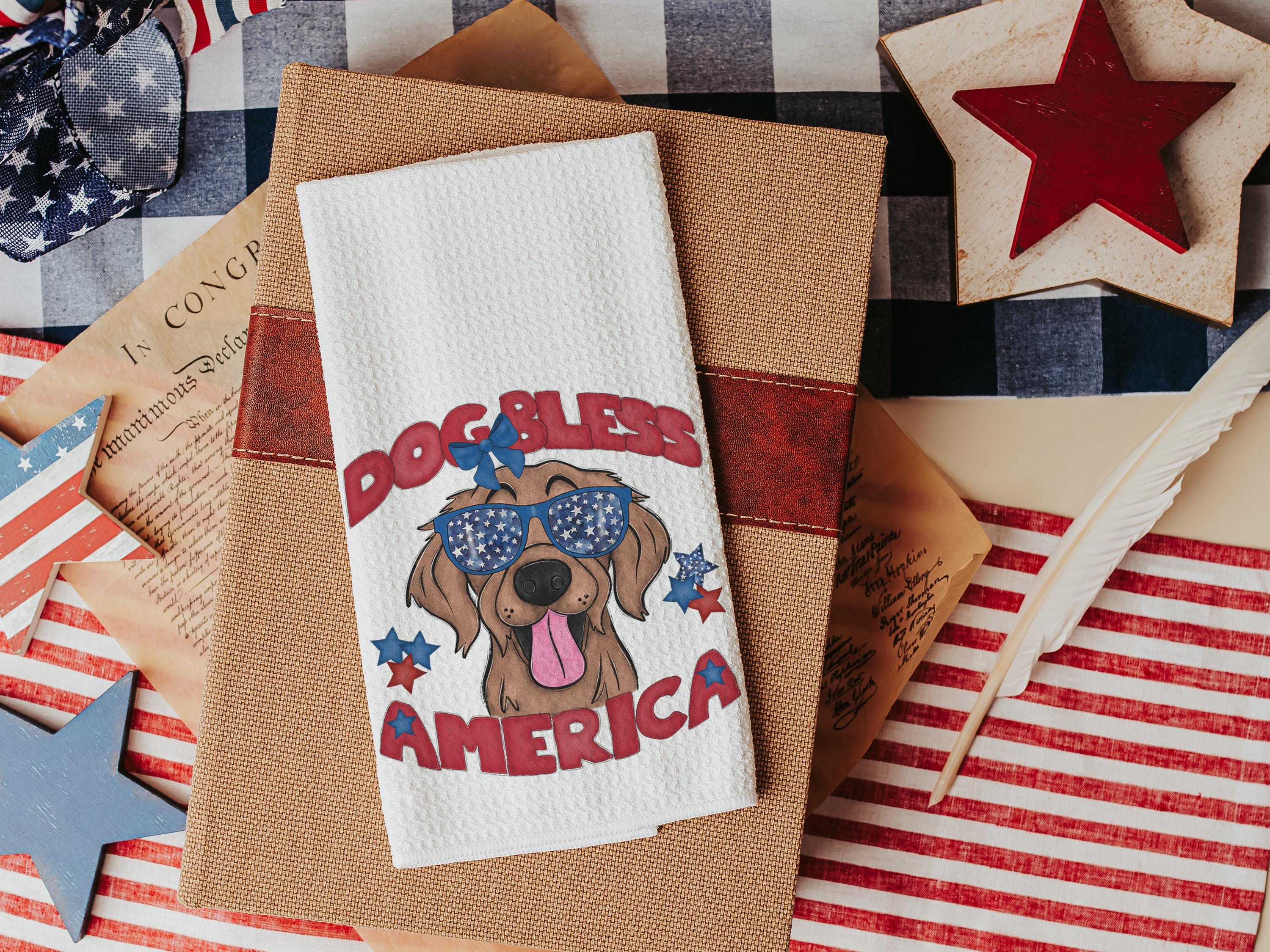 A Dog Bless America Golden Retriever design in red, white, and blue. Available as a kitchen towel, a matching throw pillow, or together as a set—great for 4th of July BBQs, patriotic kitchen decor, and dog-lover gifts.