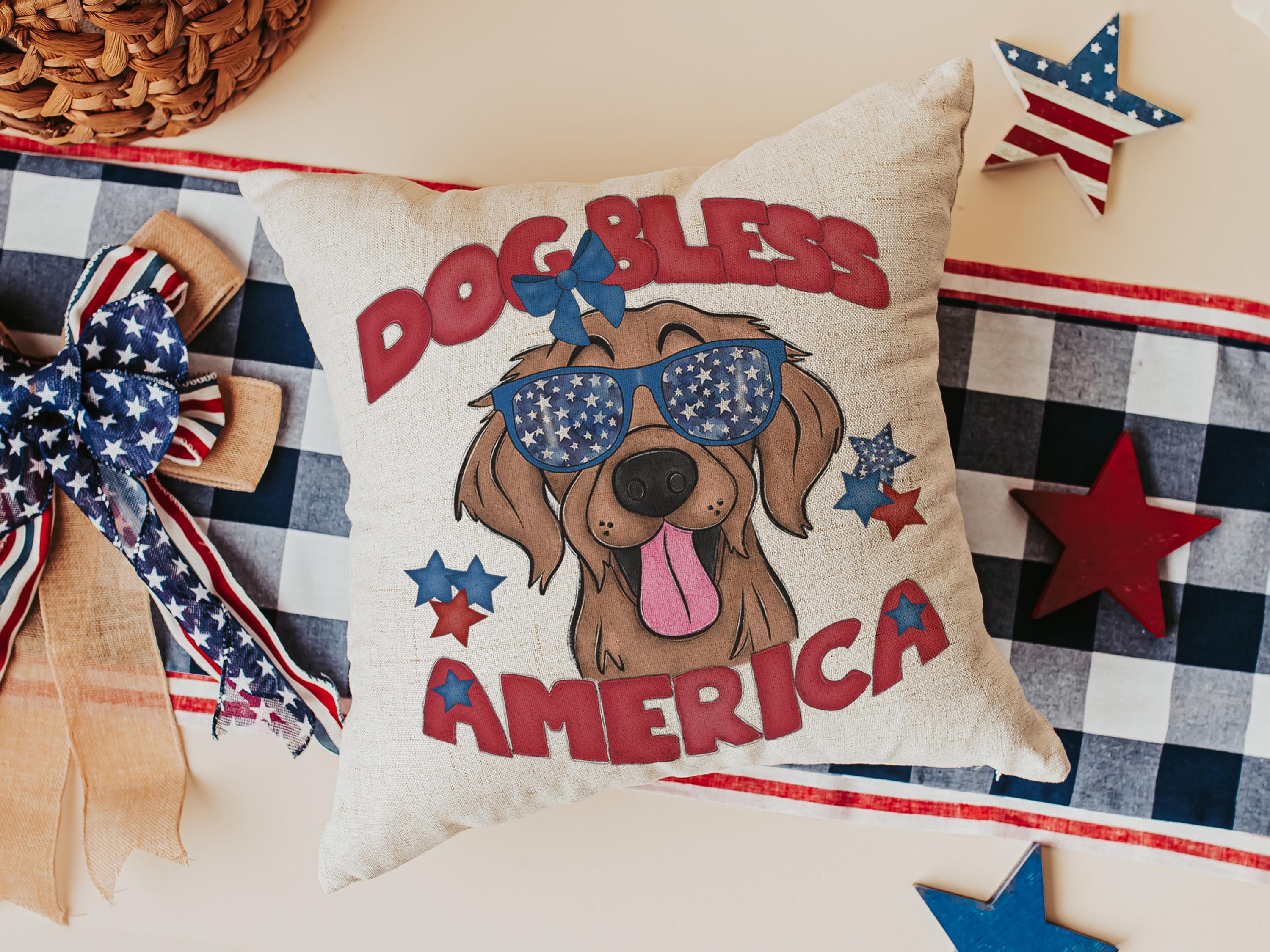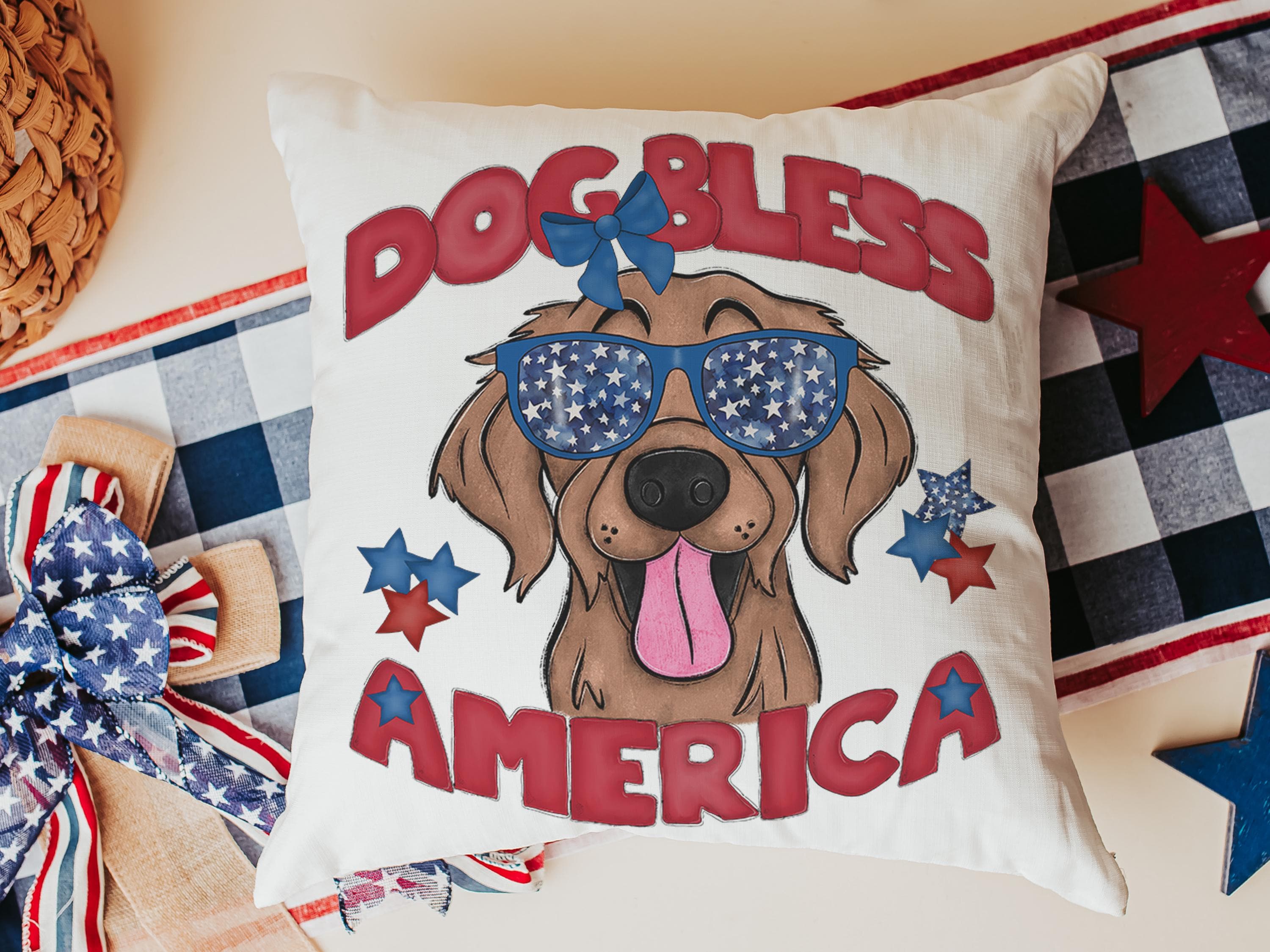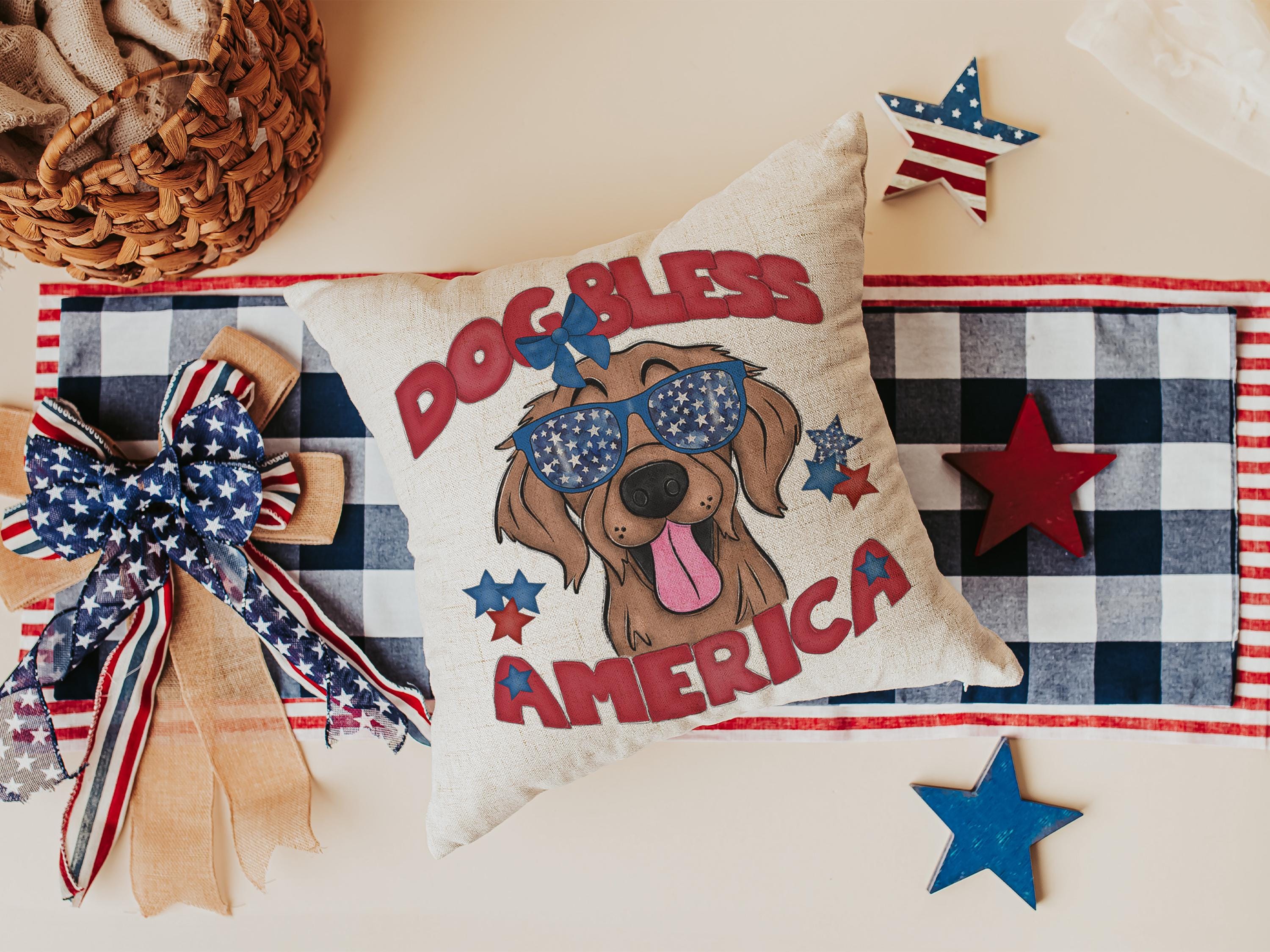 A Dog Bless America Golden Retriever design in red, white, and blue. Available as a kitchen towel, a matching throw pillow, or together as a set—great for 4th of July BBQs, patriotic kitchen decor, and dog-lover gifts.