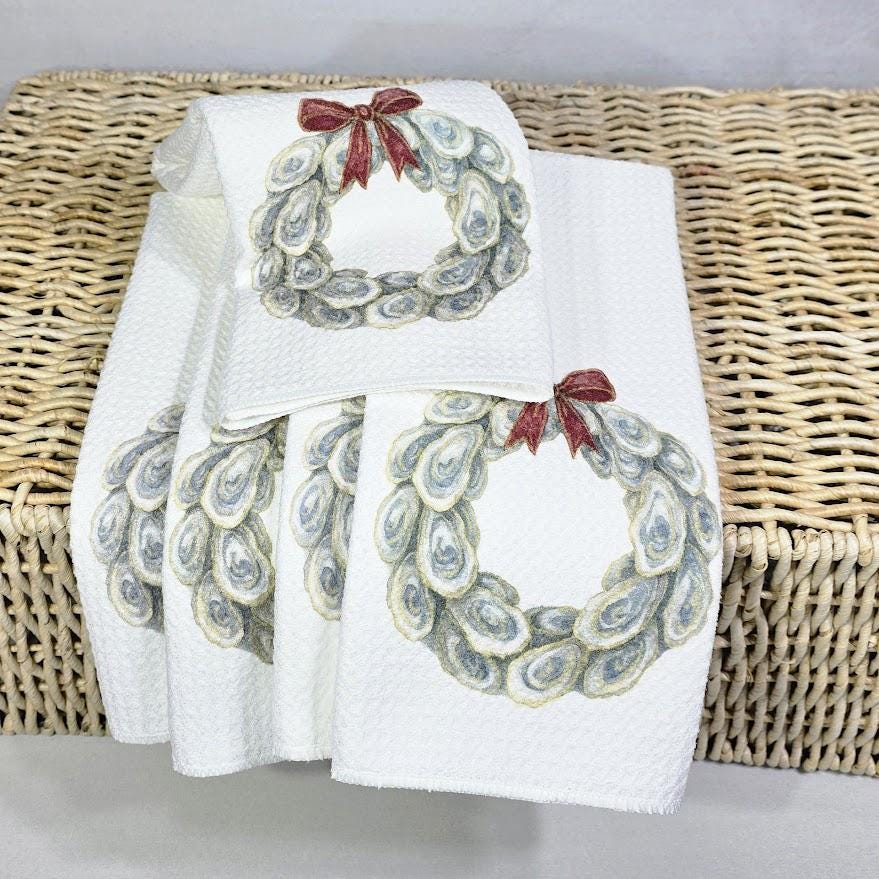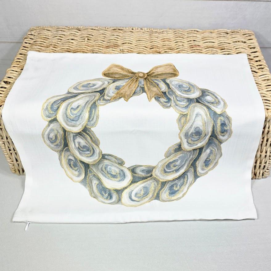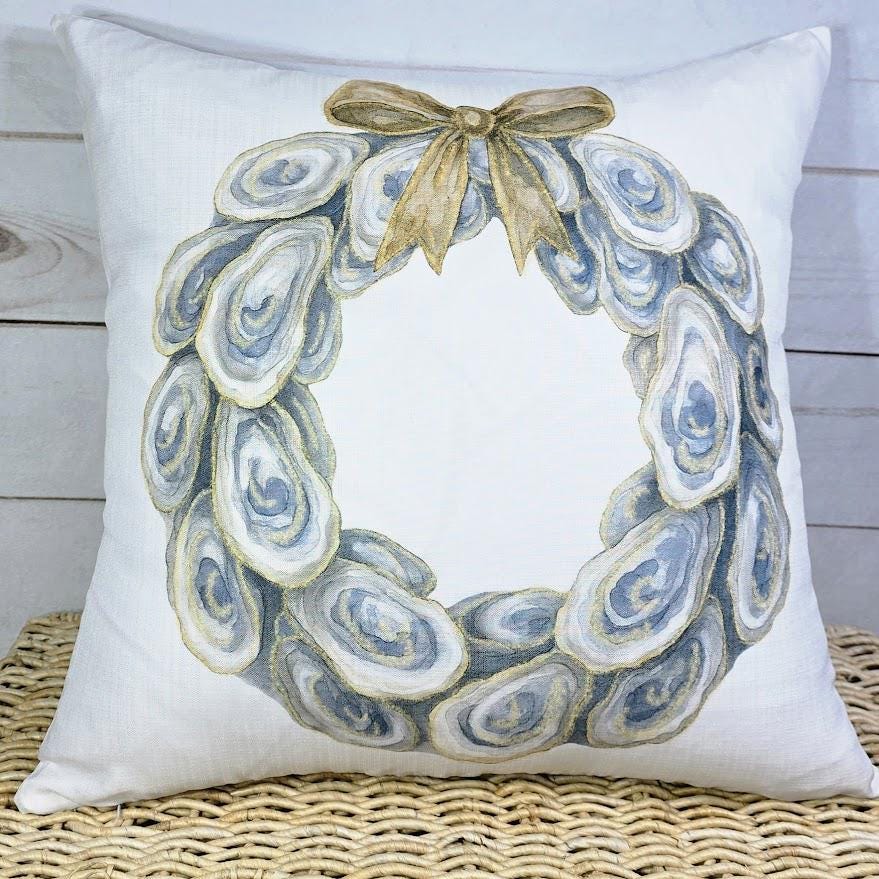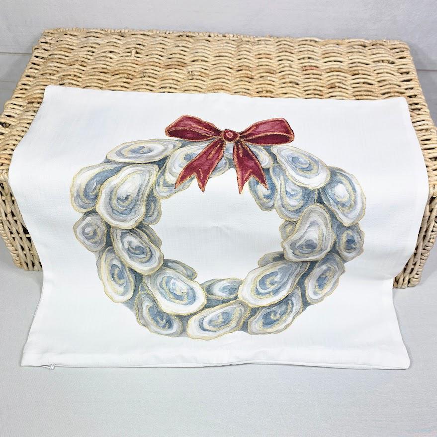 Bring coastal Christmas style to your home with oyster shell wreath pillows and matching towels, perfect for the living room, kitchen, or bathroom. These beach-inspired accents make beautiful oyster Christmas gifts for neighbors and timeless coastal holiday decor. Available to purchase as pillows or towels, sold separately or as sets.