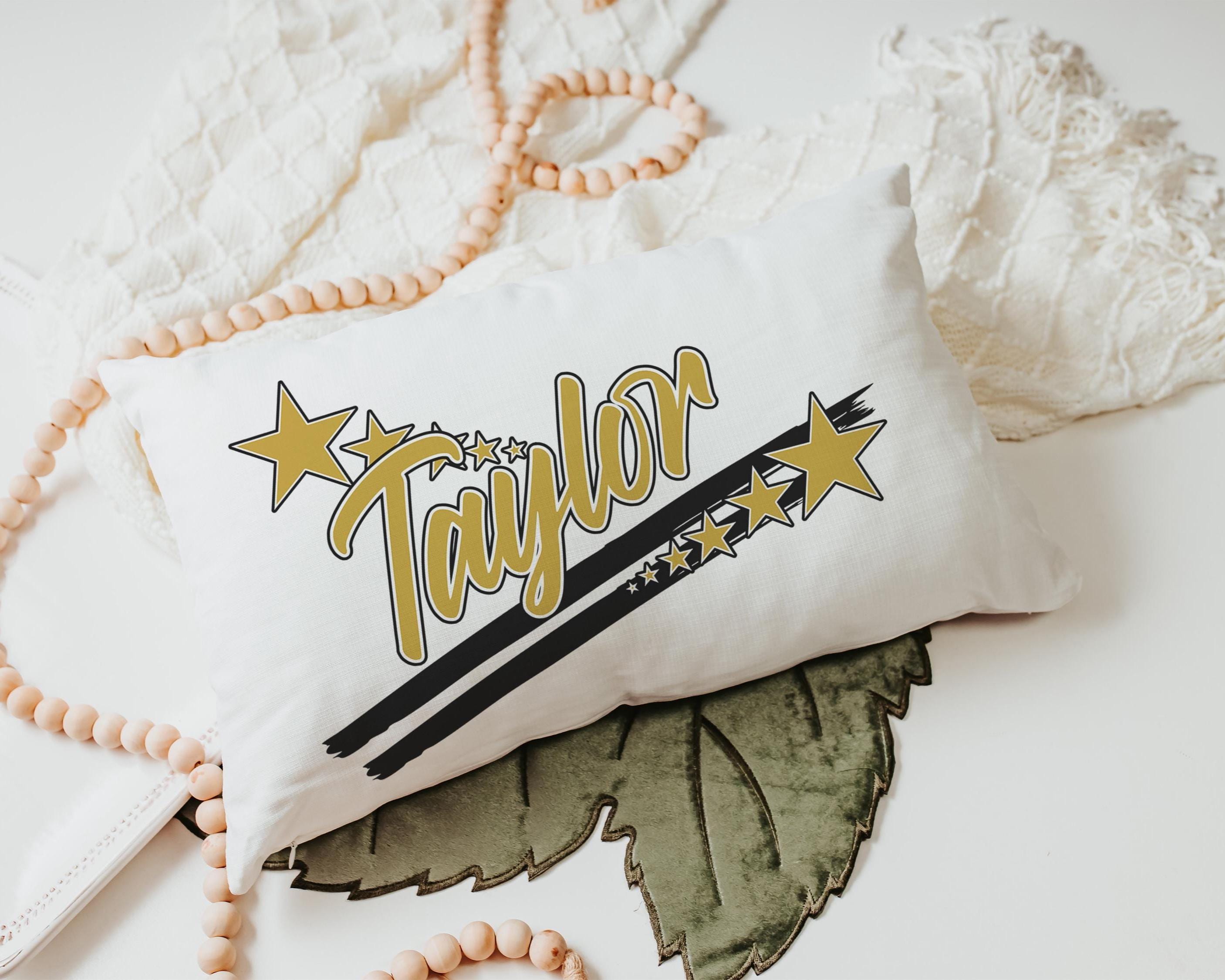 Add a personalized touch to your space with a vegas gold name pillow designed for a dorm room or girls bedroom decor. This long pillow works beautifully on full beds as a gold school spirit accent, making it one of the best gifts for teen girls.