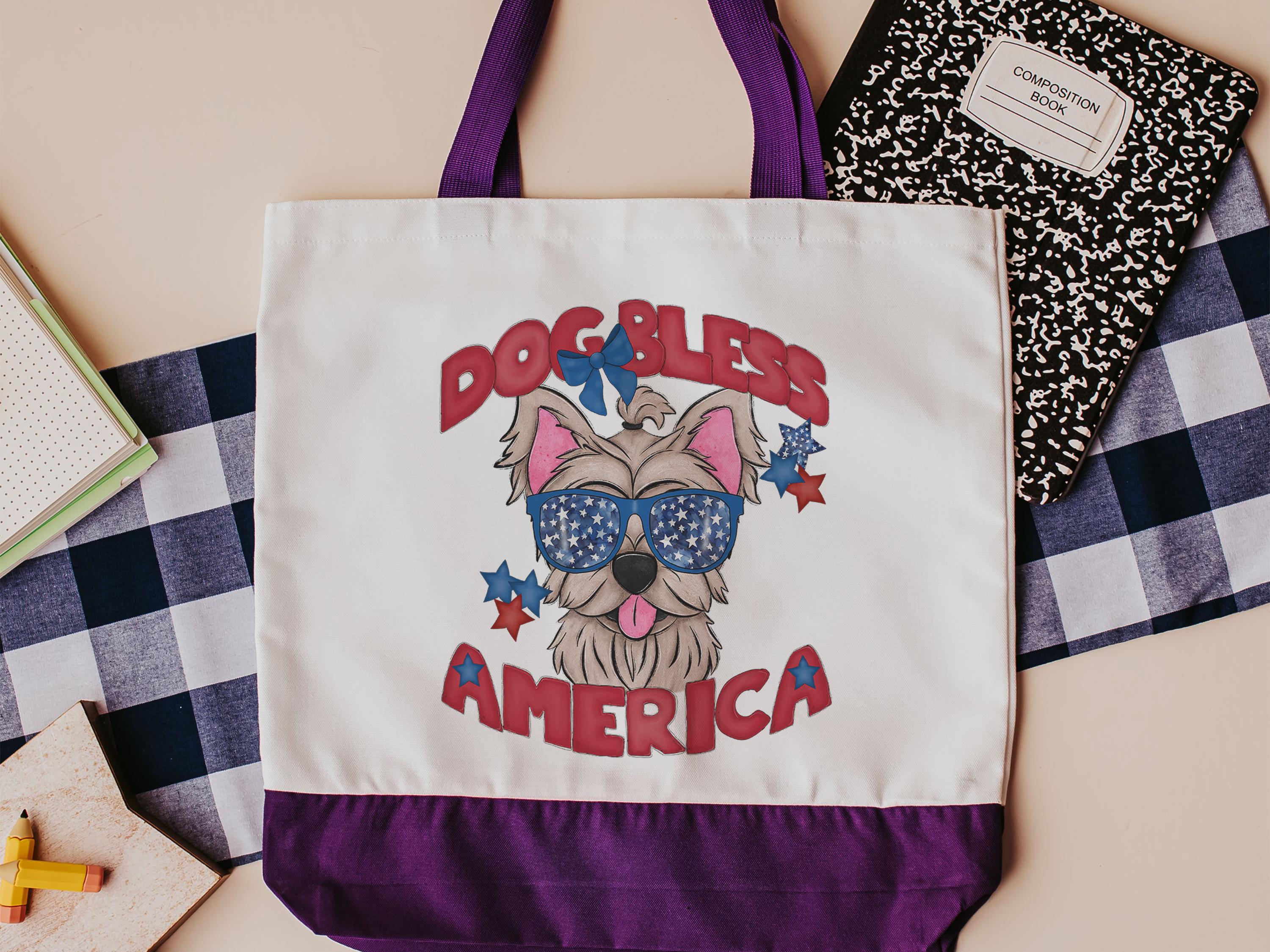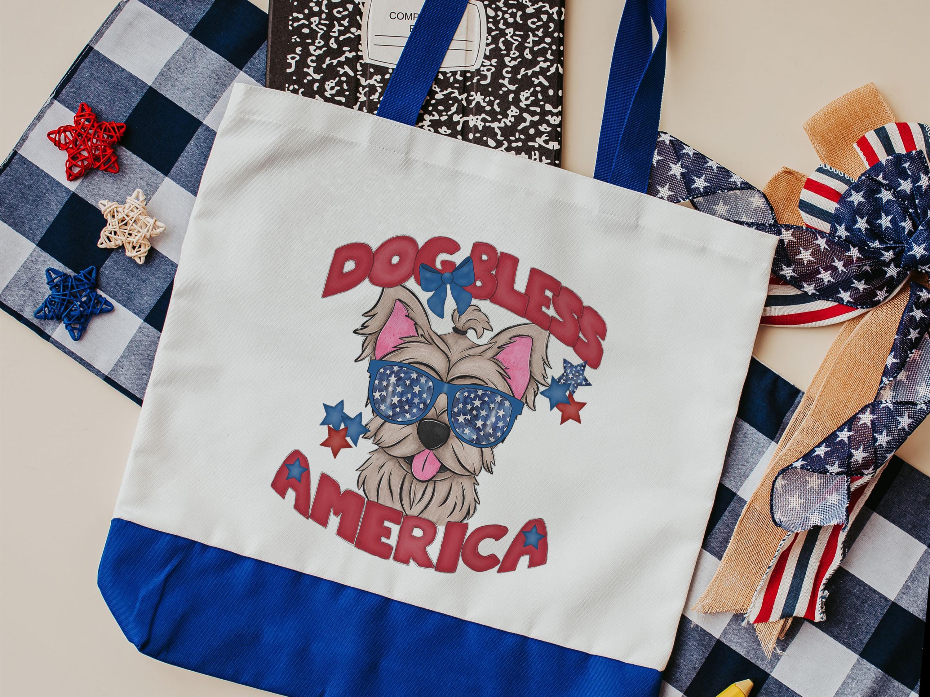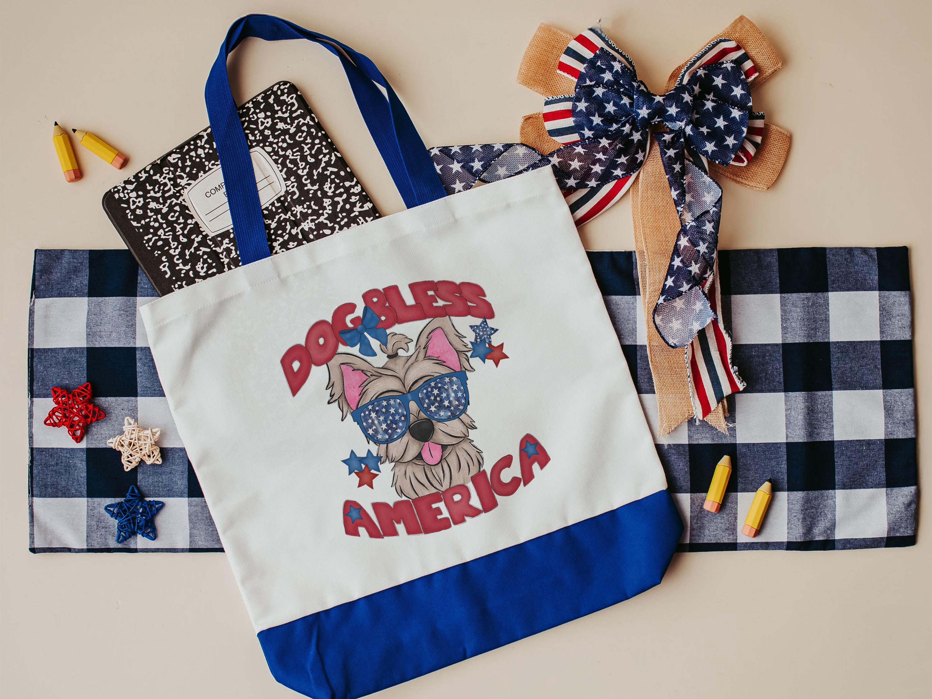Celebrate your love for Yorkies with this Dog Bless America patriotic tote bag. A fun everyday bag for summer outings, errands, or beach days, and a great gift for Yorkie owners and dog moms who enjoy red, white, and blue dog designs.