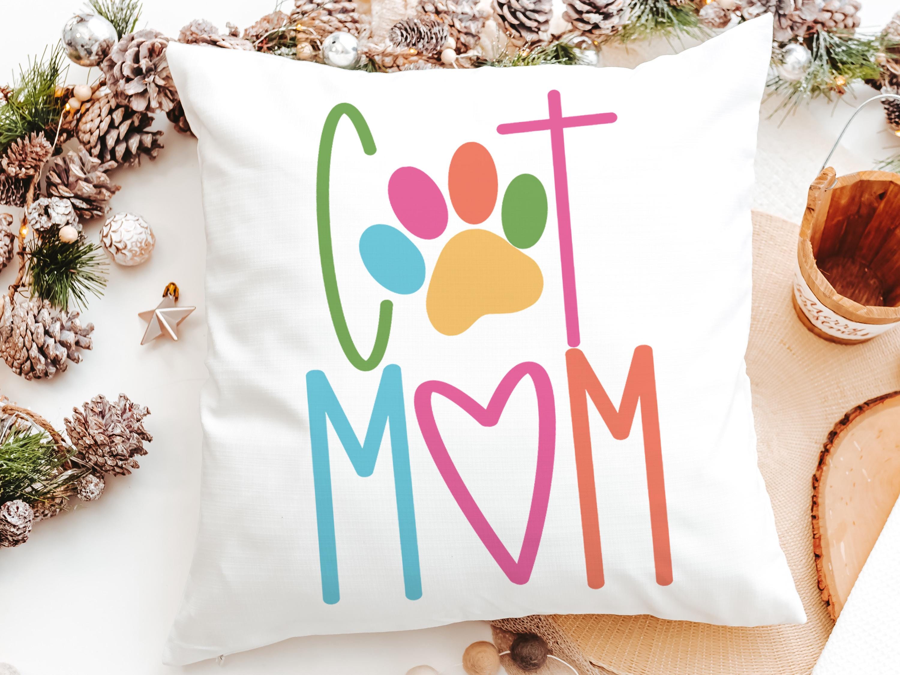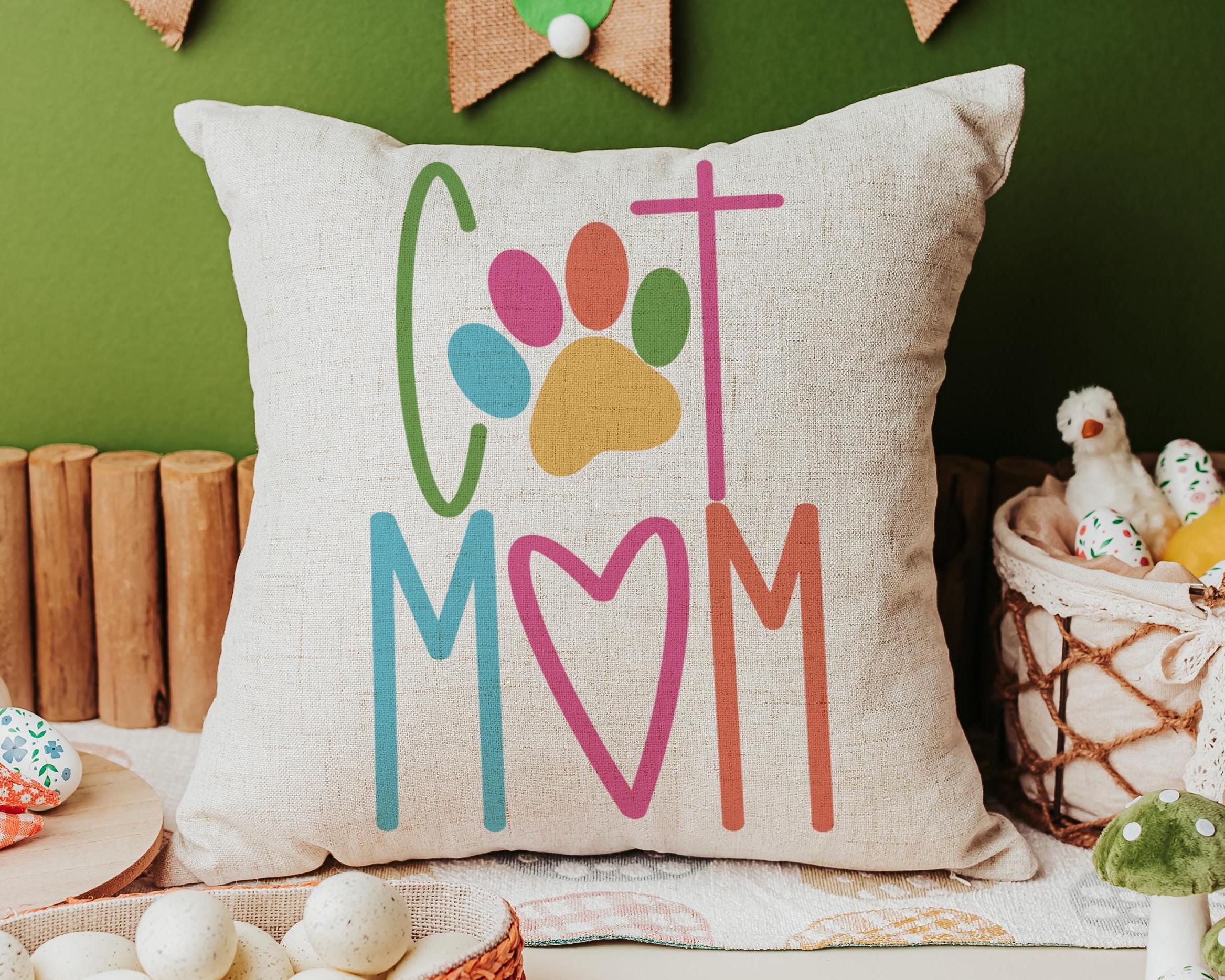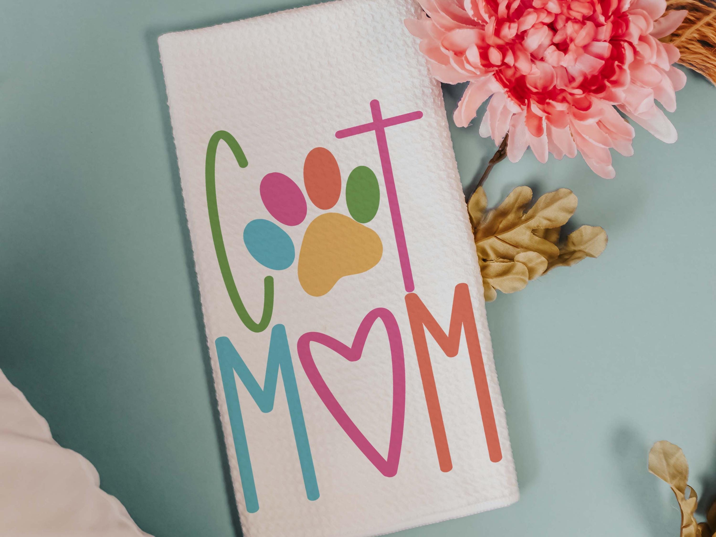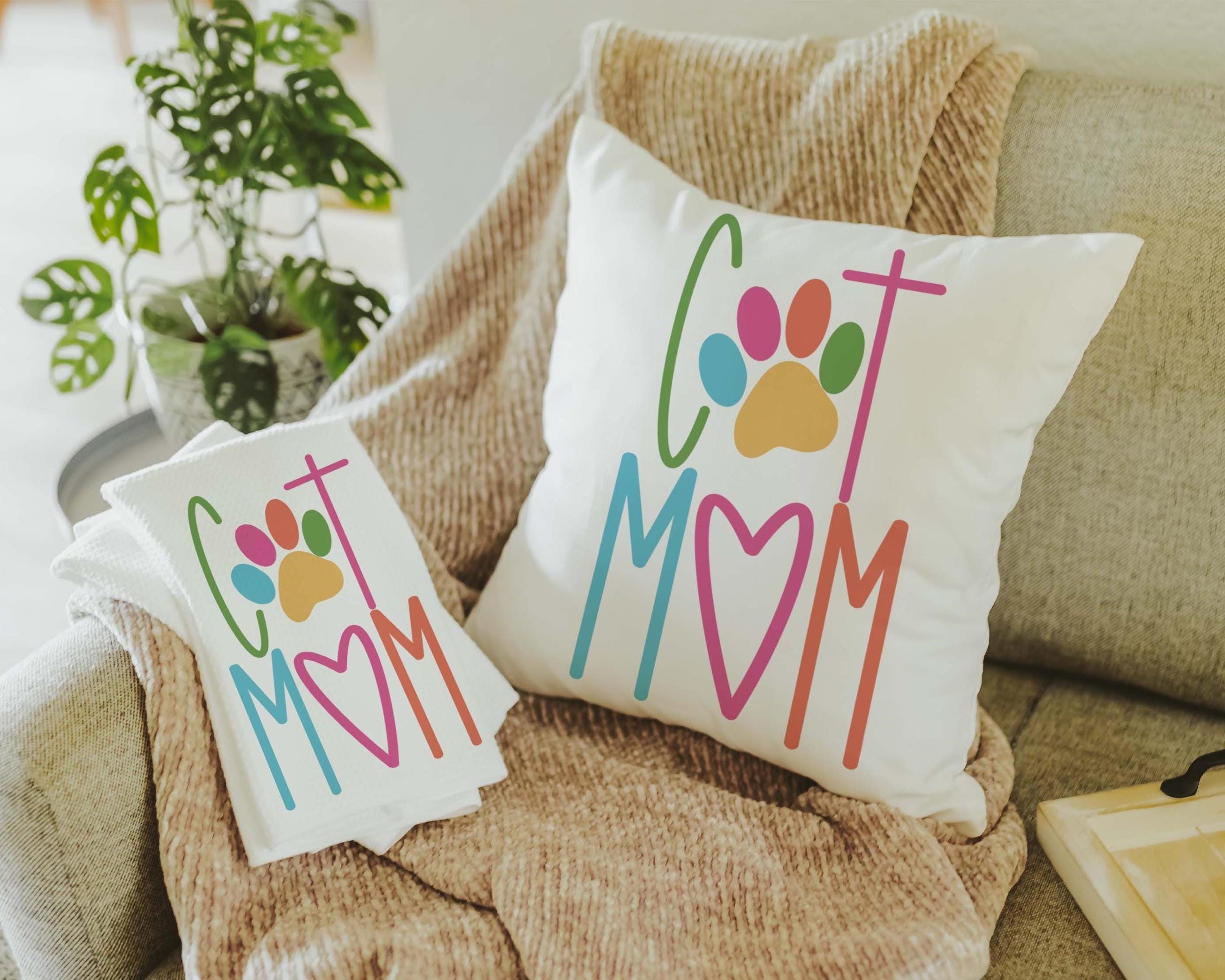 Add a fun touch of color to a chair or kitchen with this cat mom throw pillow and matching towels. A cute Mother’s Day gift for cat lovers and pet moms who enjoy fun, colorful cat decor around the home.
