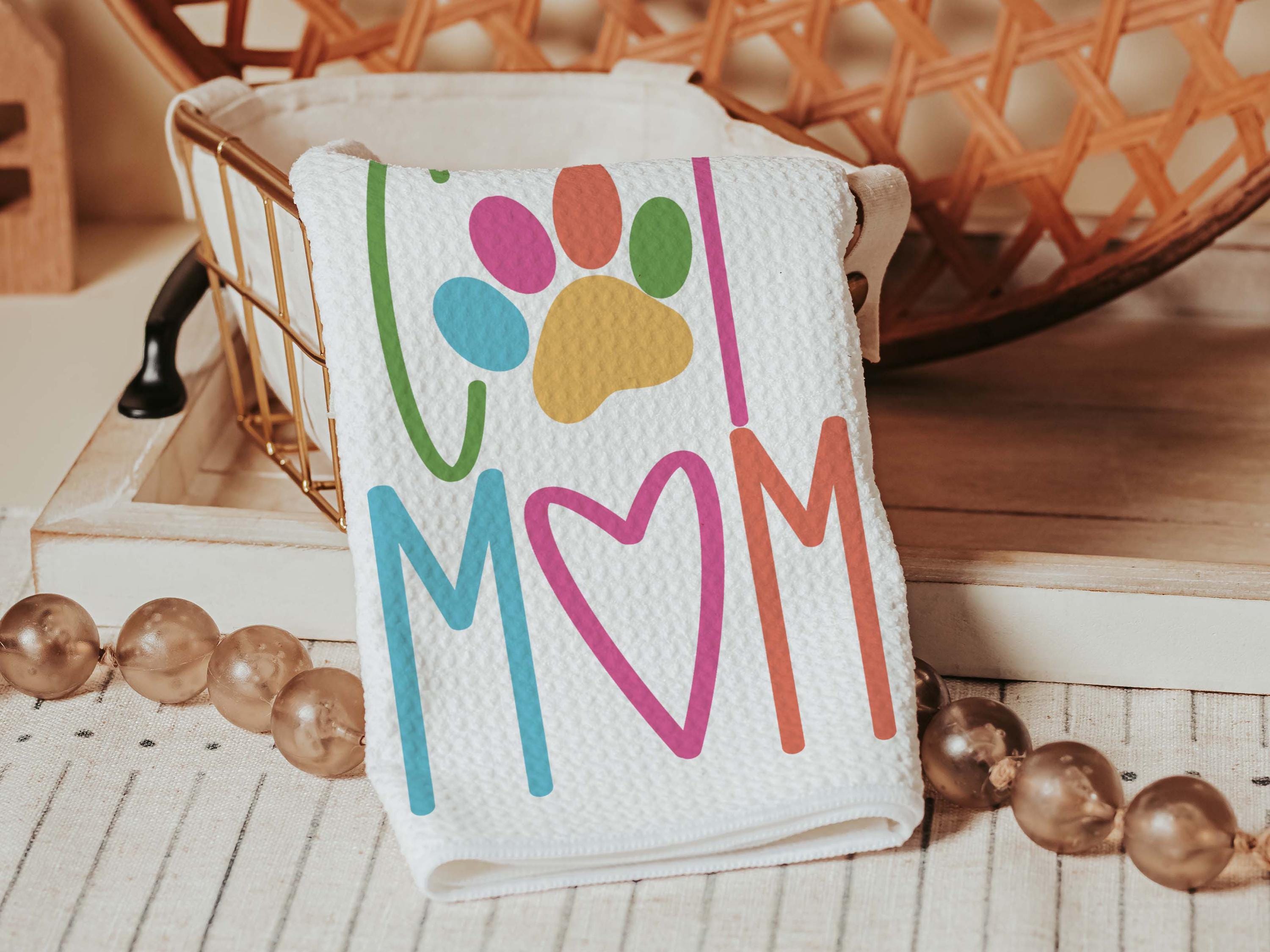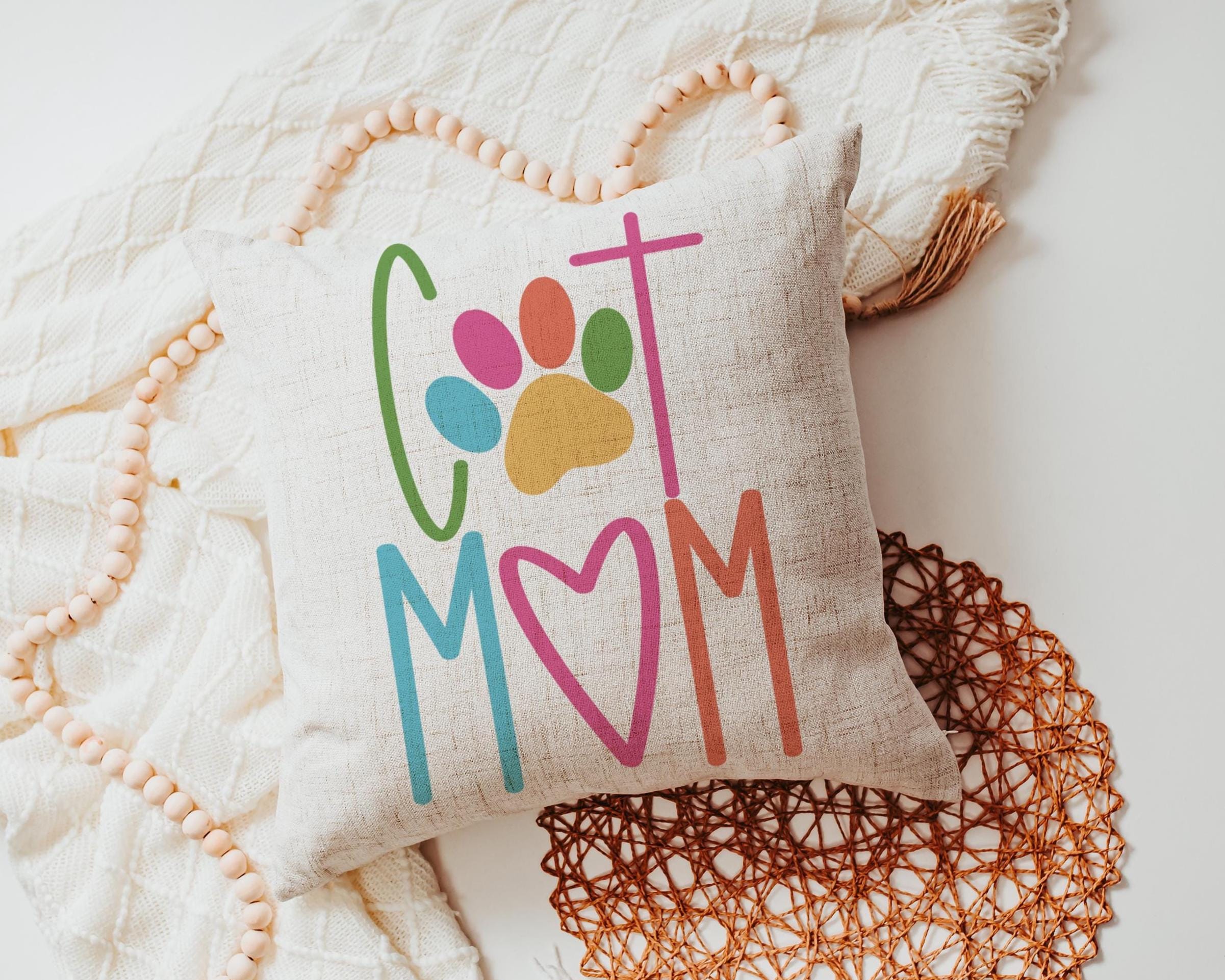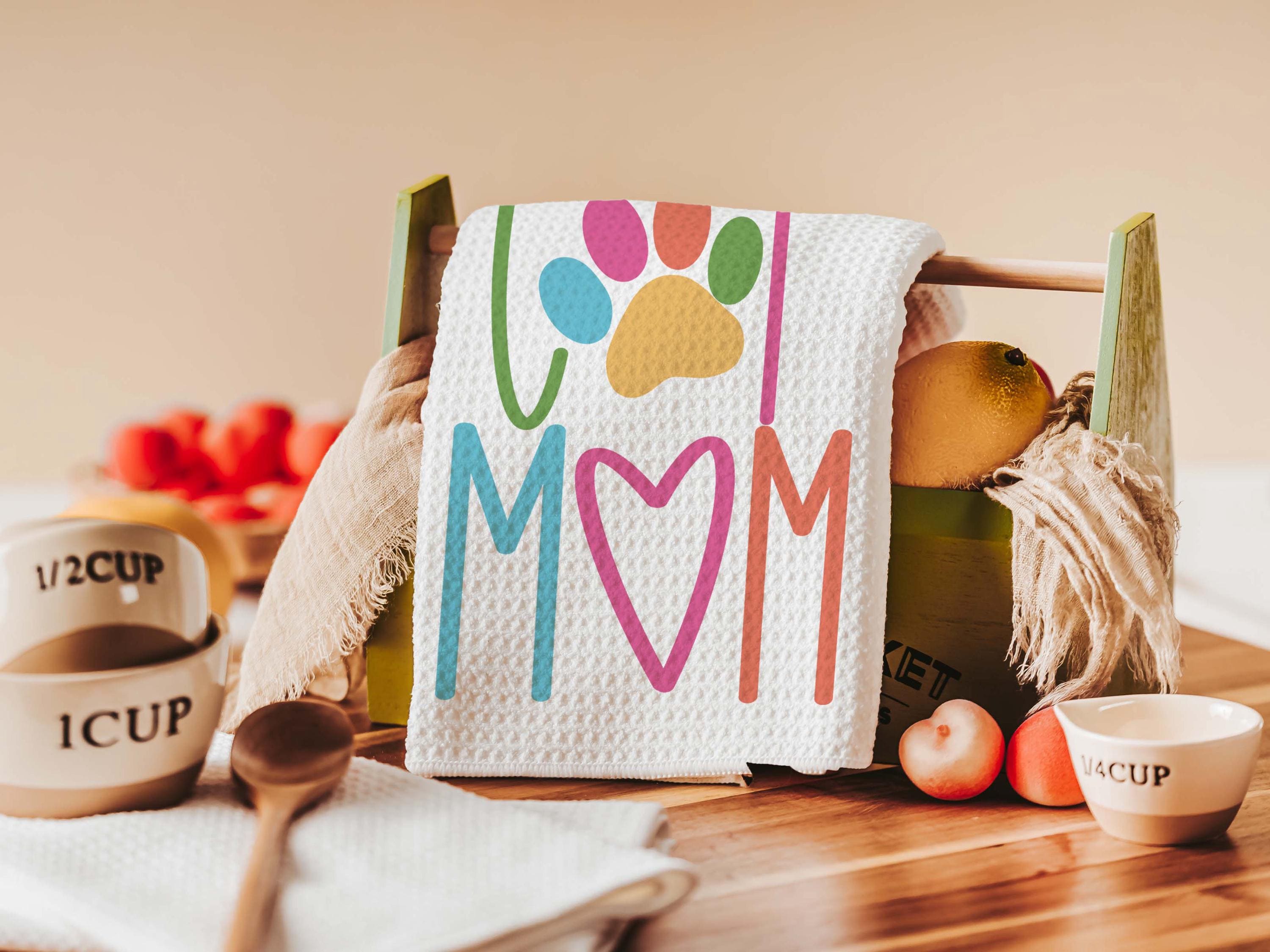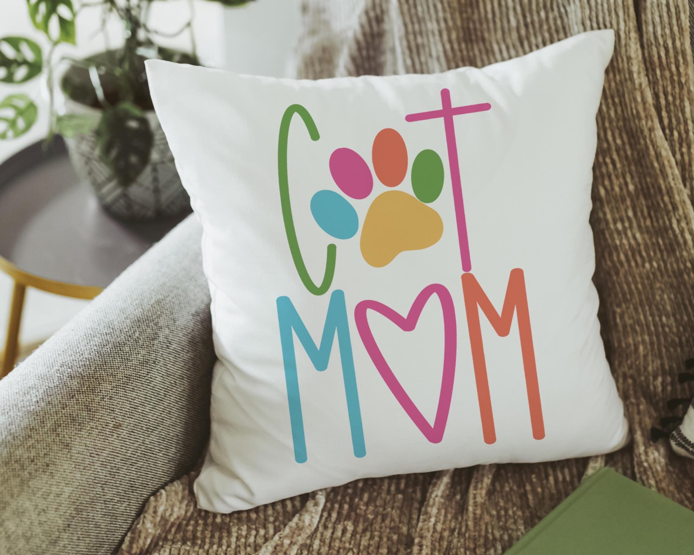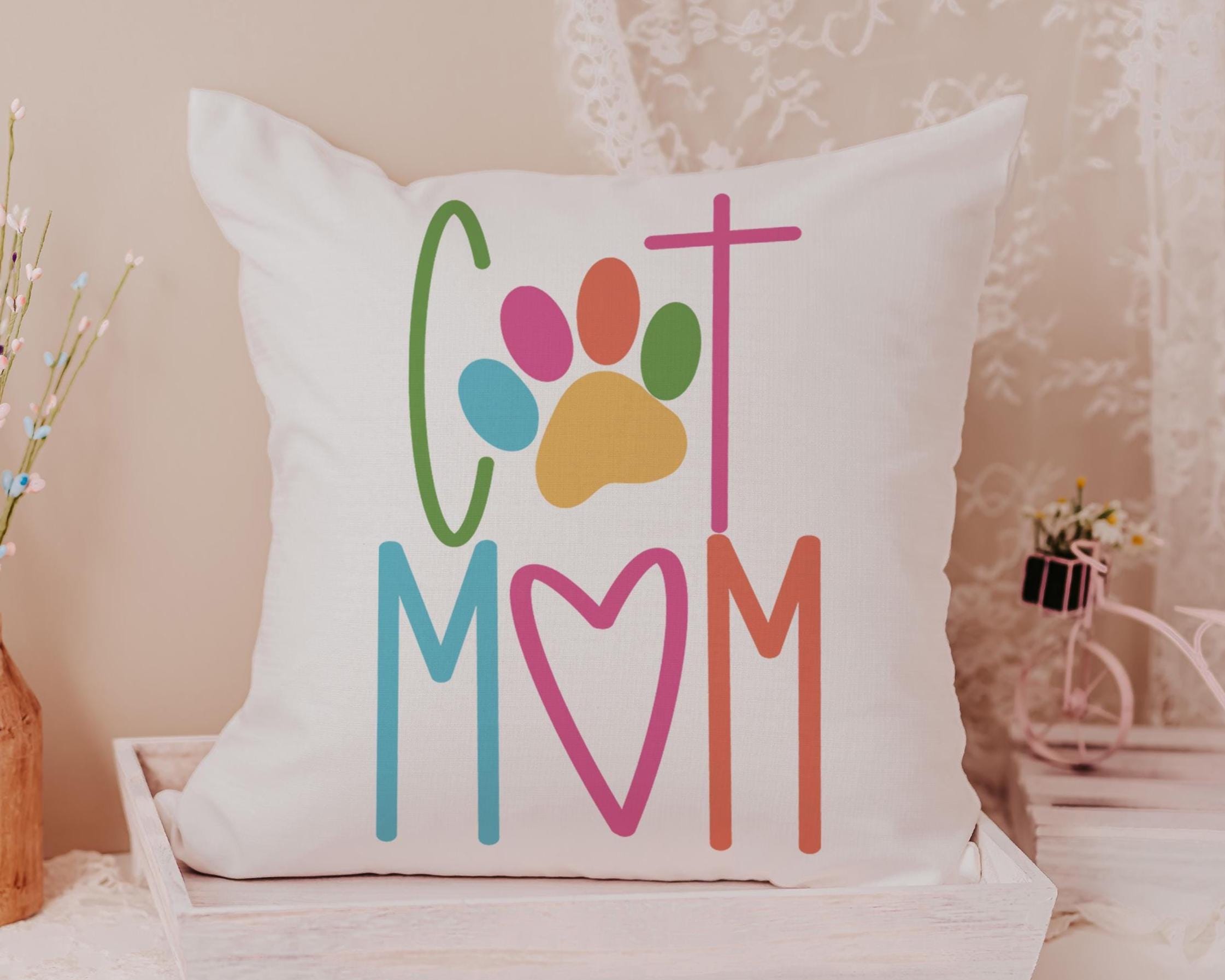 Add a fun touch of color to a chair or kitchen with this cat mom throw pillow and matching towels. A cute Mother’s Day gift for cat lovers and pet moms who enjoy fun, colorful cat decor around the home.
