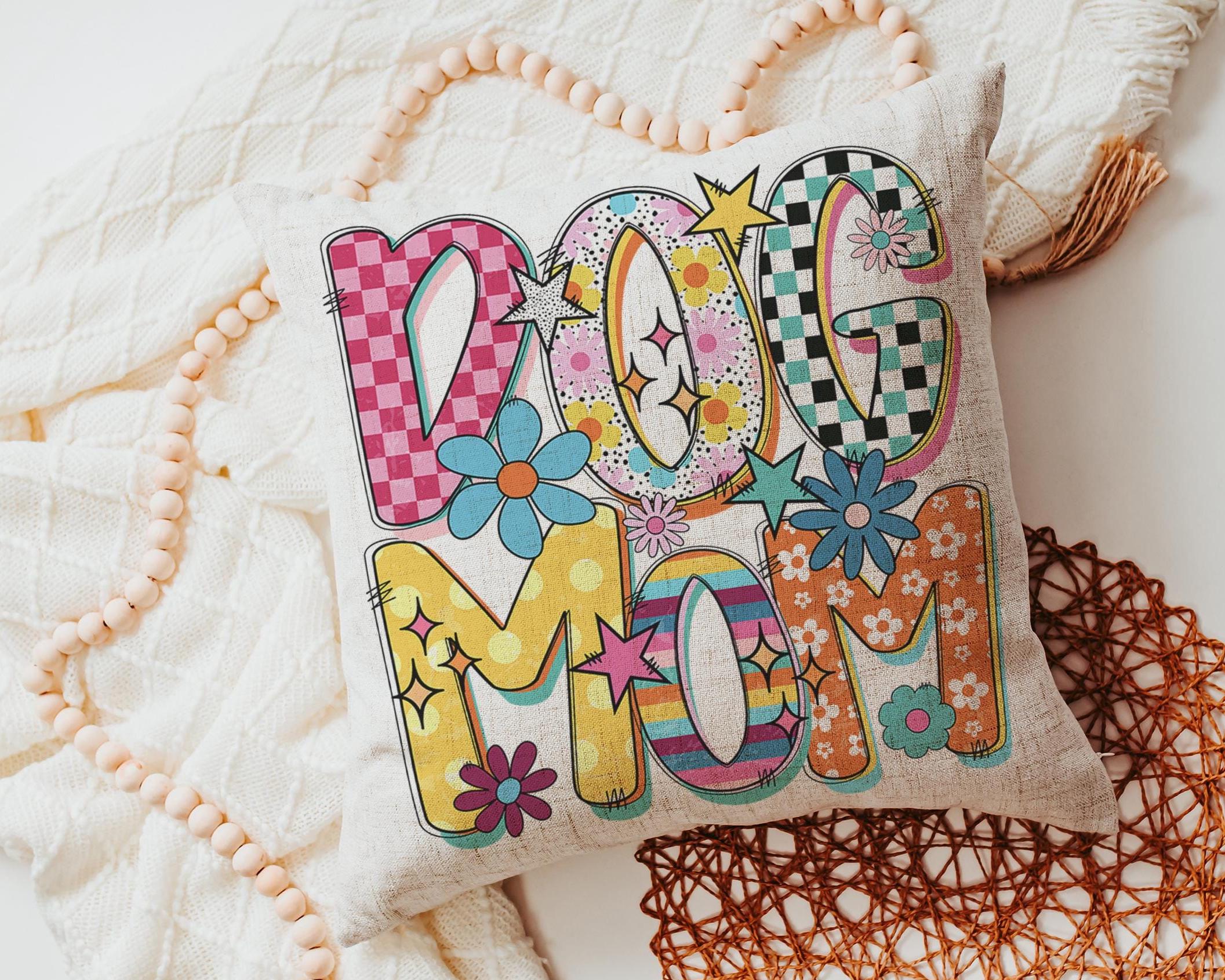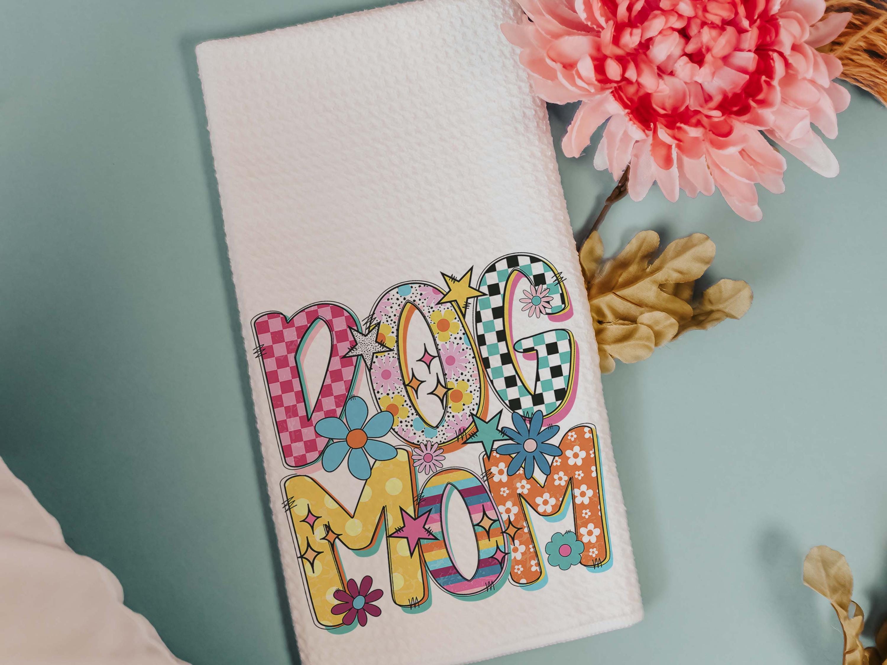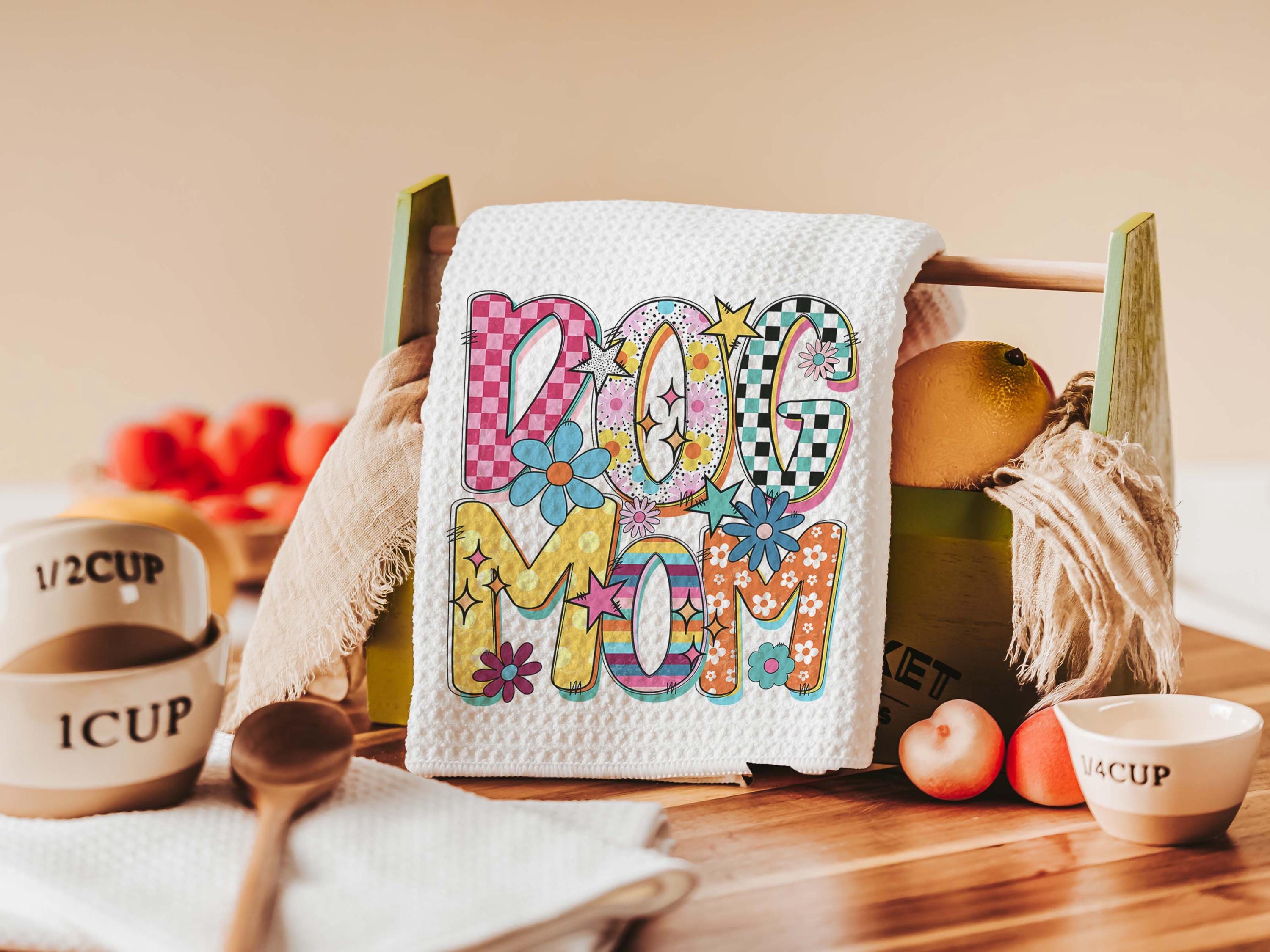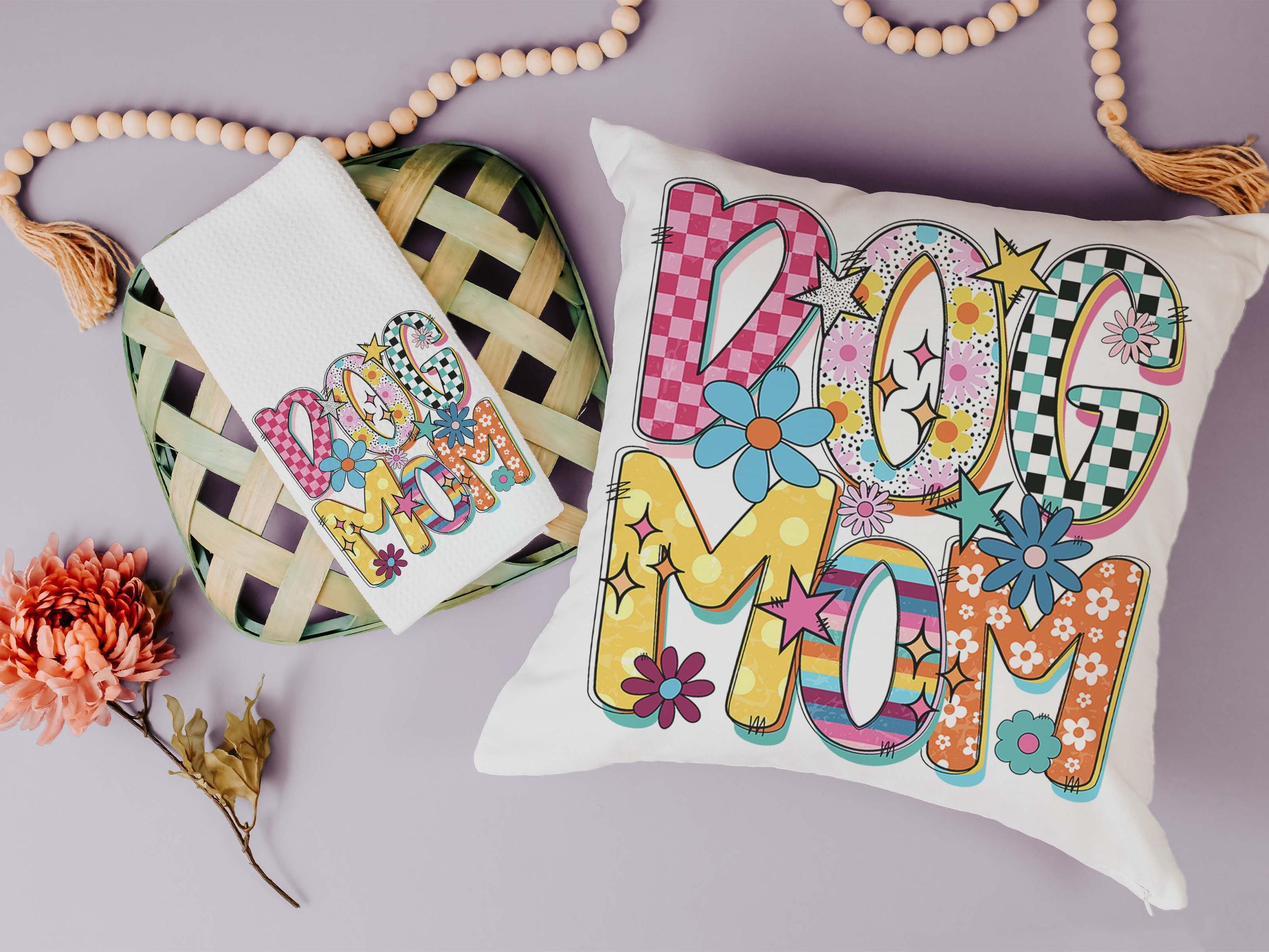 A rainbow dog mom design with a mod style brings a fun touch to a kitchen, couch, or cozy corner with the same design on both pieces. A cute pick for dog lovers and dog mom gifts, with the towel and pillow available separately or together as a set.