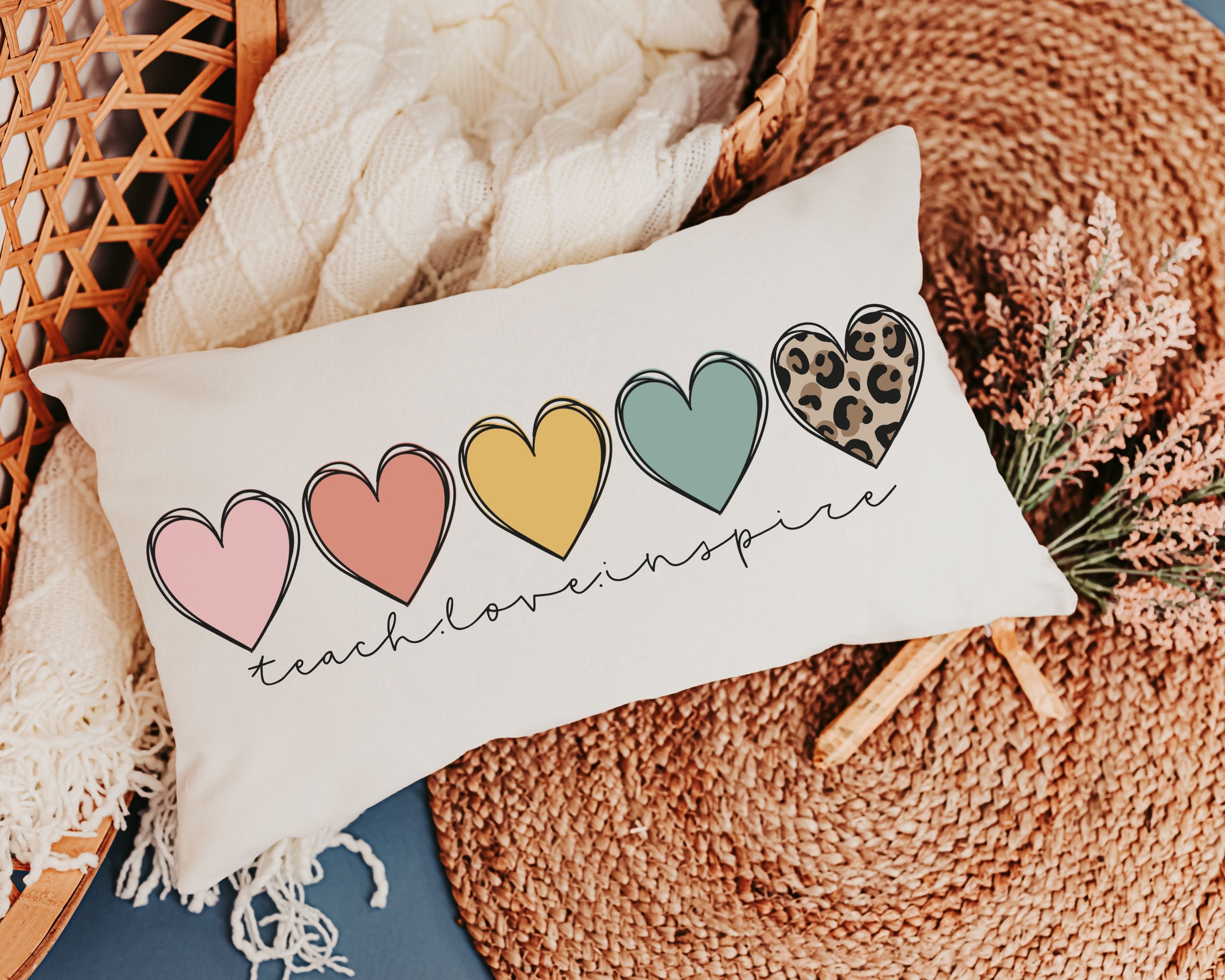 A teach love inspire message makes a great accent pillow for a couch, chair, or classroom reading corner. A wonderful thank you gift for colleagues and a great choice for preschool or kindergarten teacher gifts and everyday classroom decor.