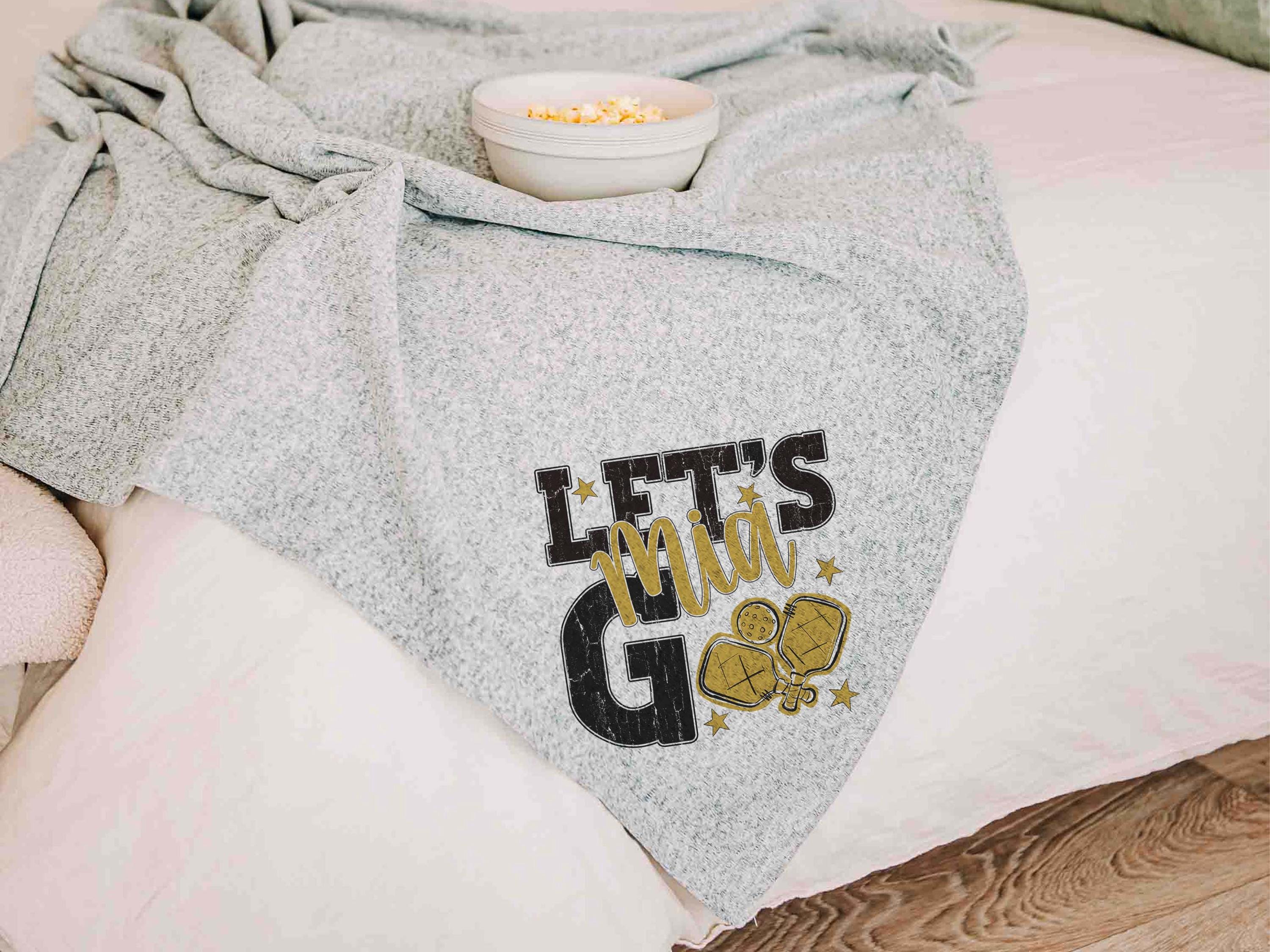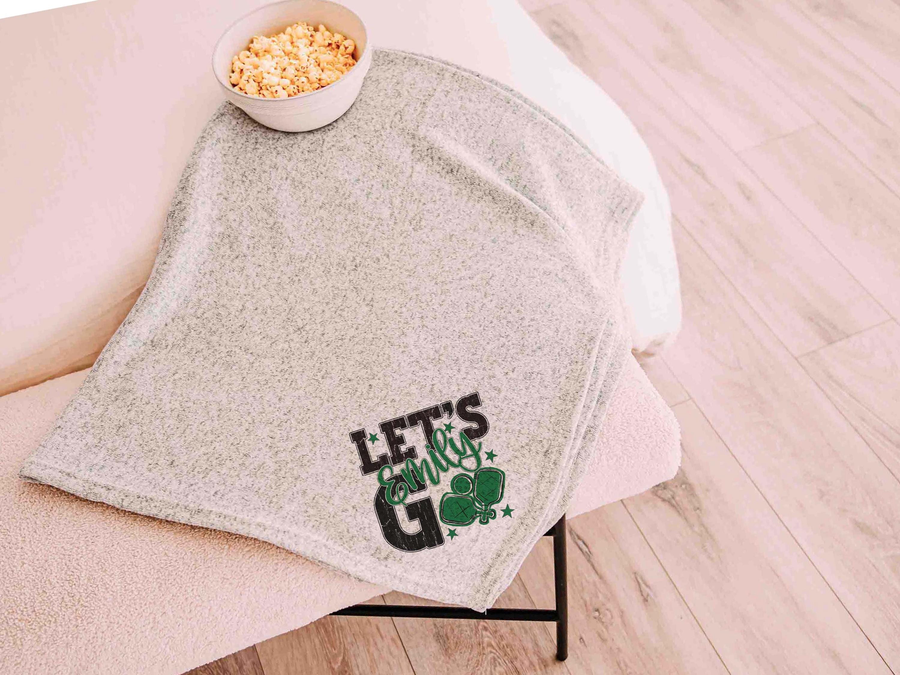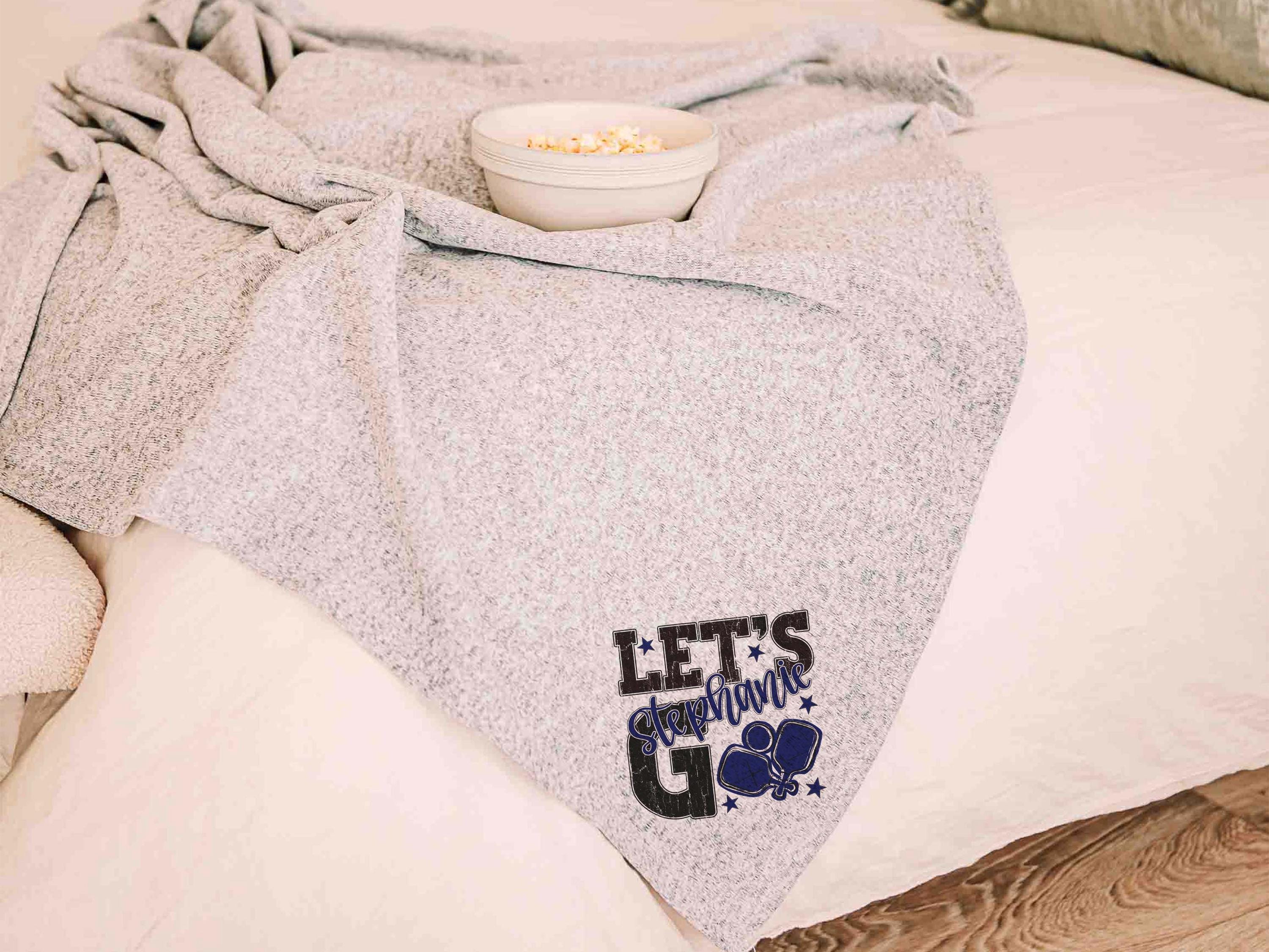 A personalized name in carolina blue with a lets go pickleball-inspired look brings a great touch to a bed or sofa at home or in a dorm. A great choice for a woman graduate gift or college pickleball gifts, especially for high school pickleball girls moving into their next season.
