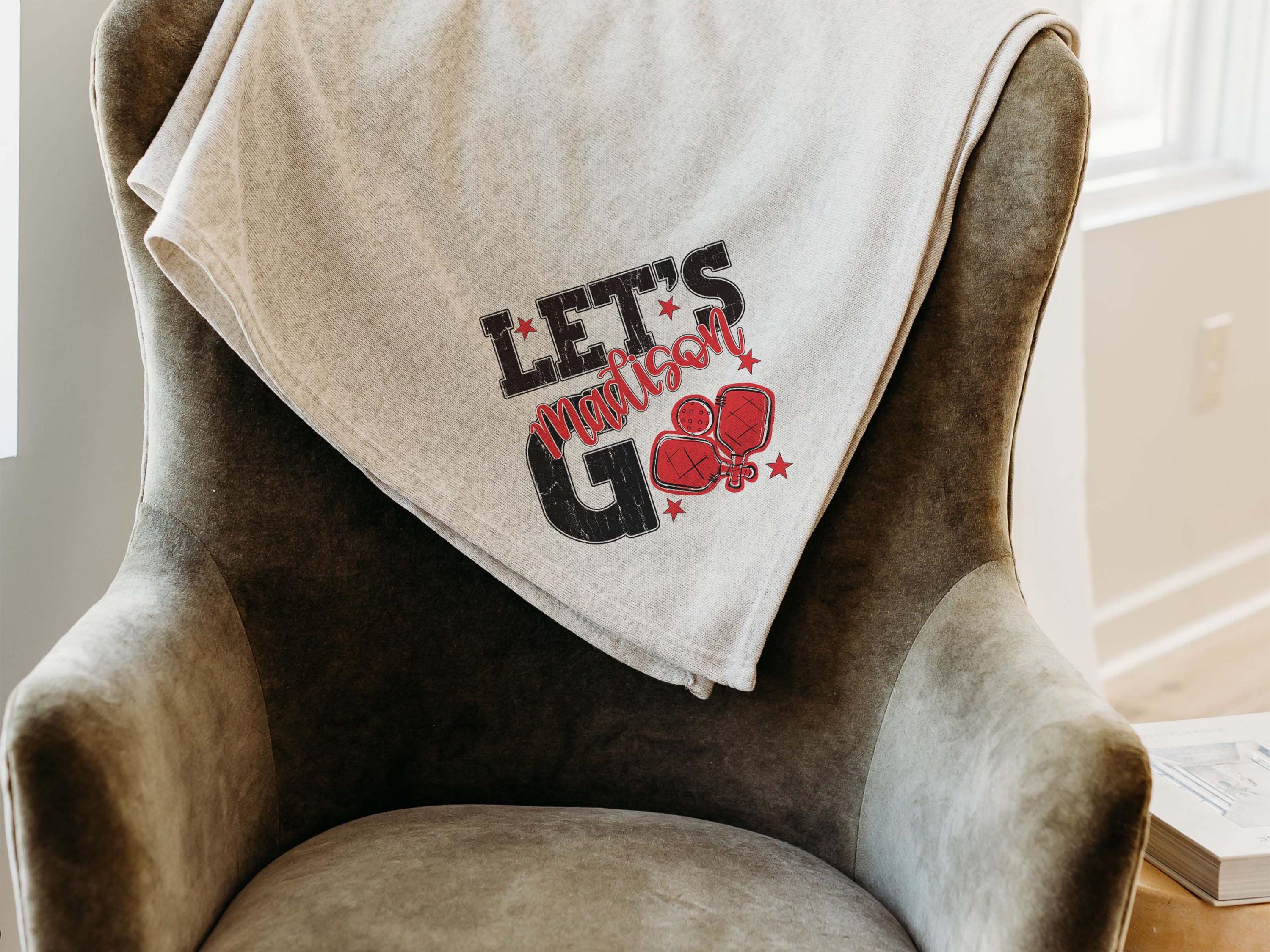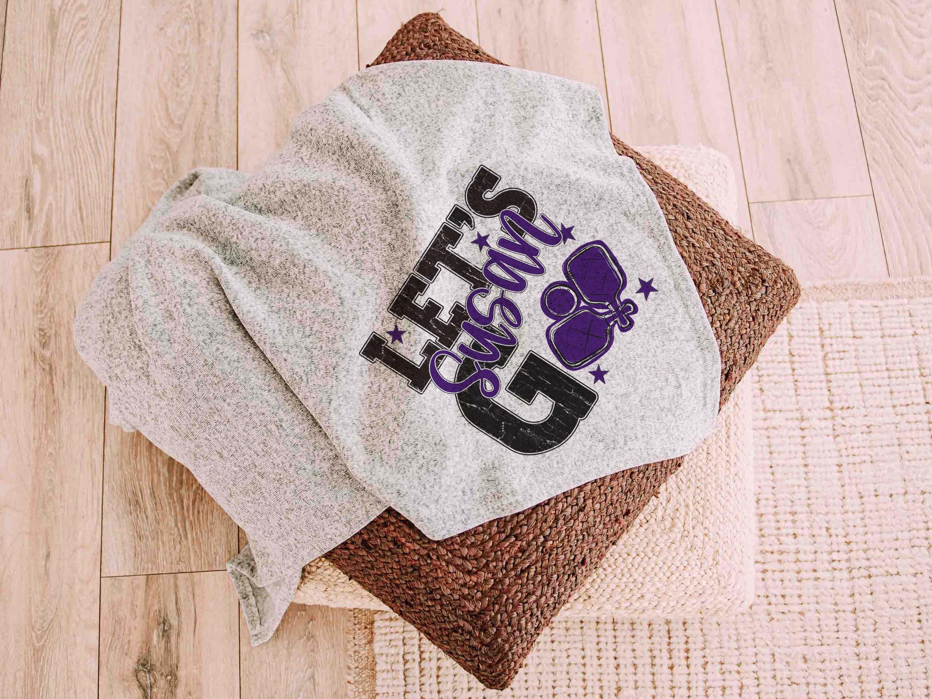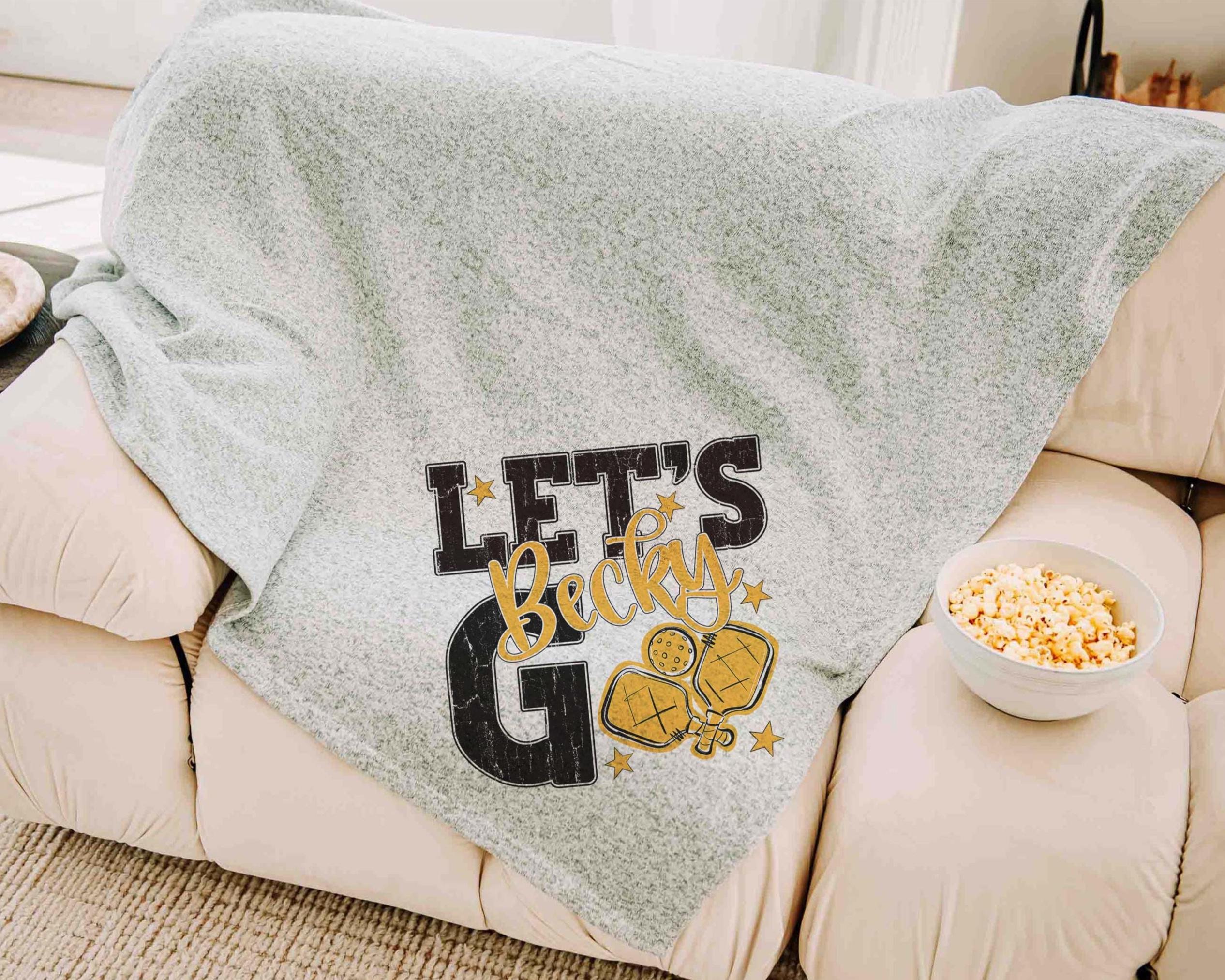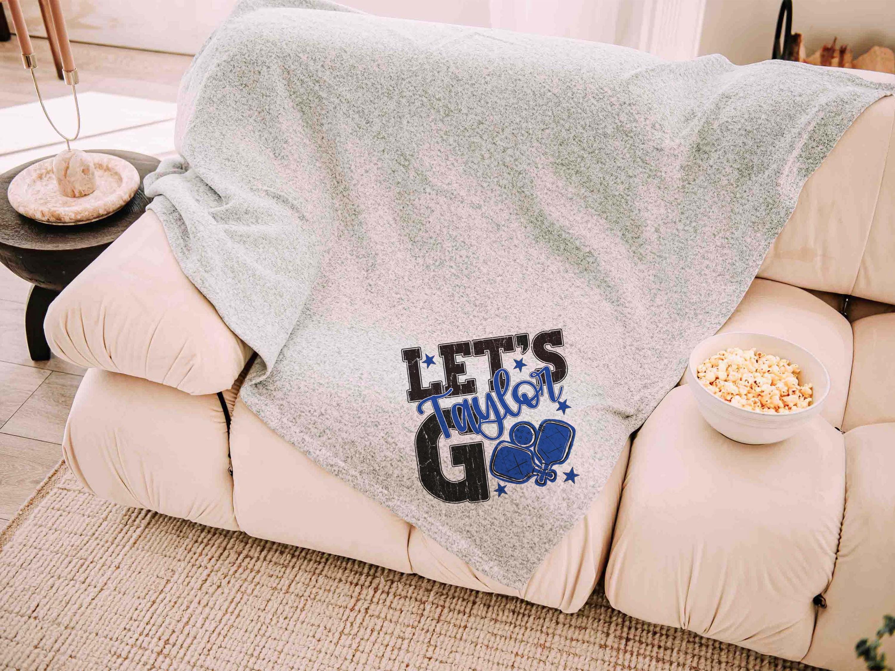 A personalized name in carolina blue with a lets go pickleball-inspired look brings a great touch to a bed or sofa at home or in a dorm. A great choice for a woman graduate gift or college pickleball gifts, especially for high school pickleball girls moving into their next season.
