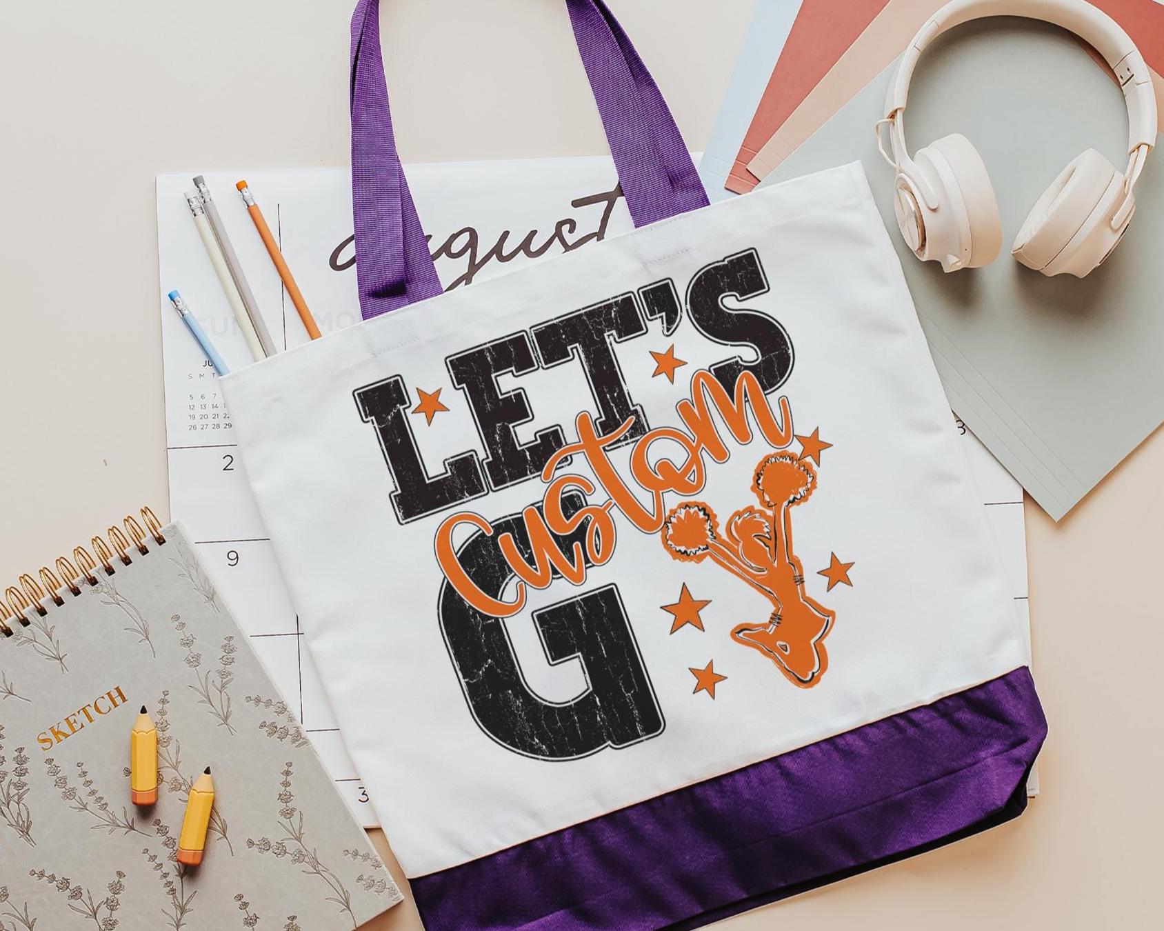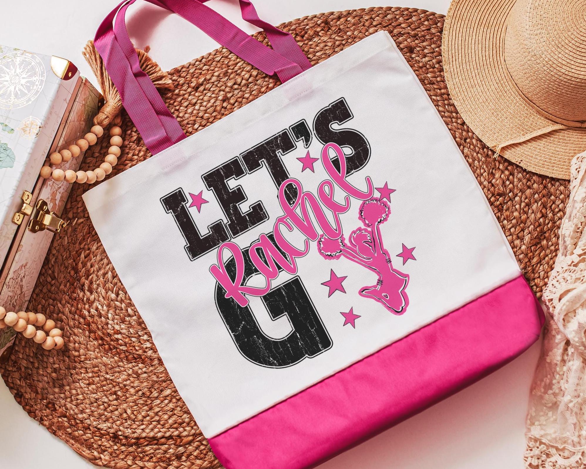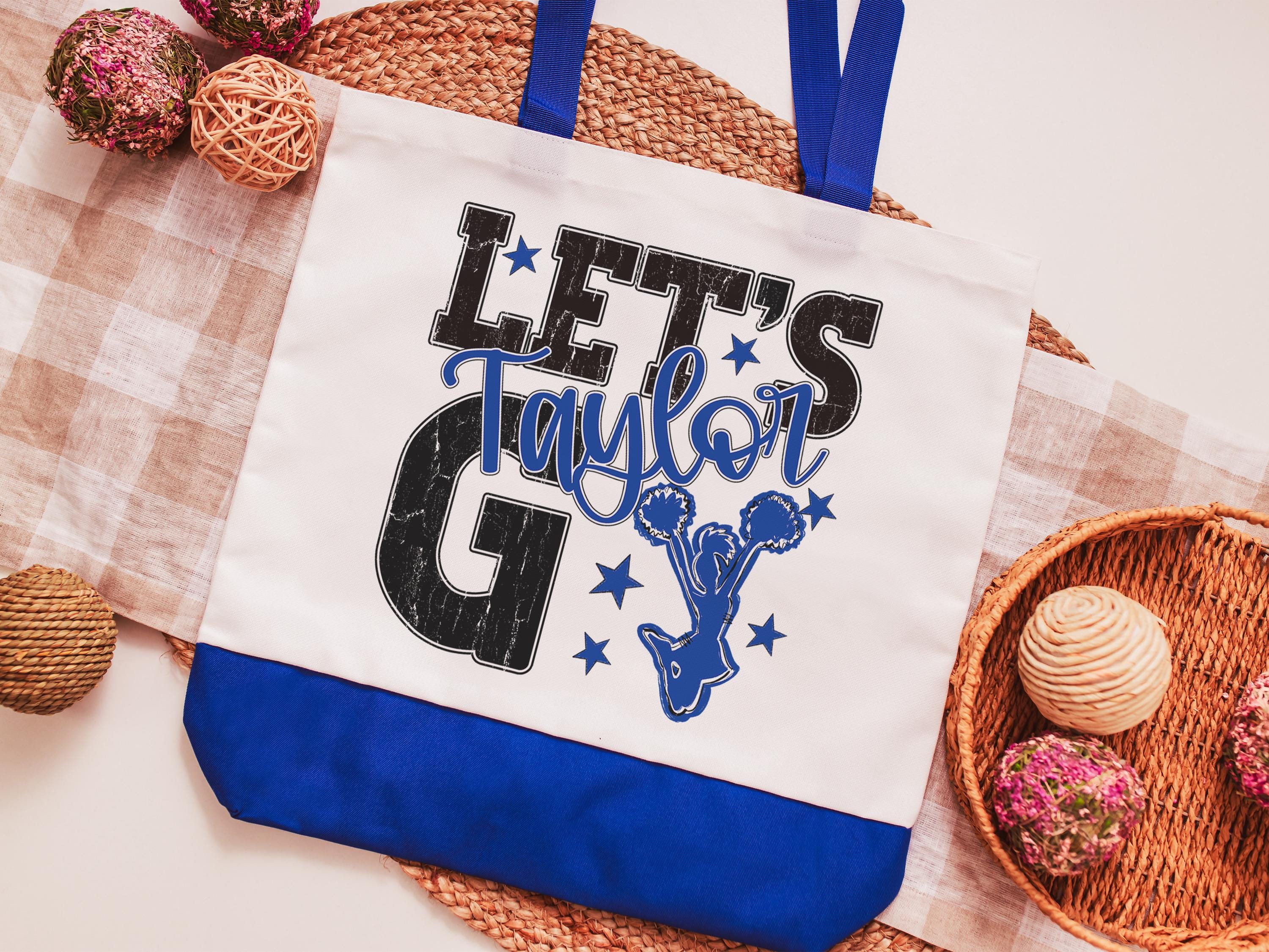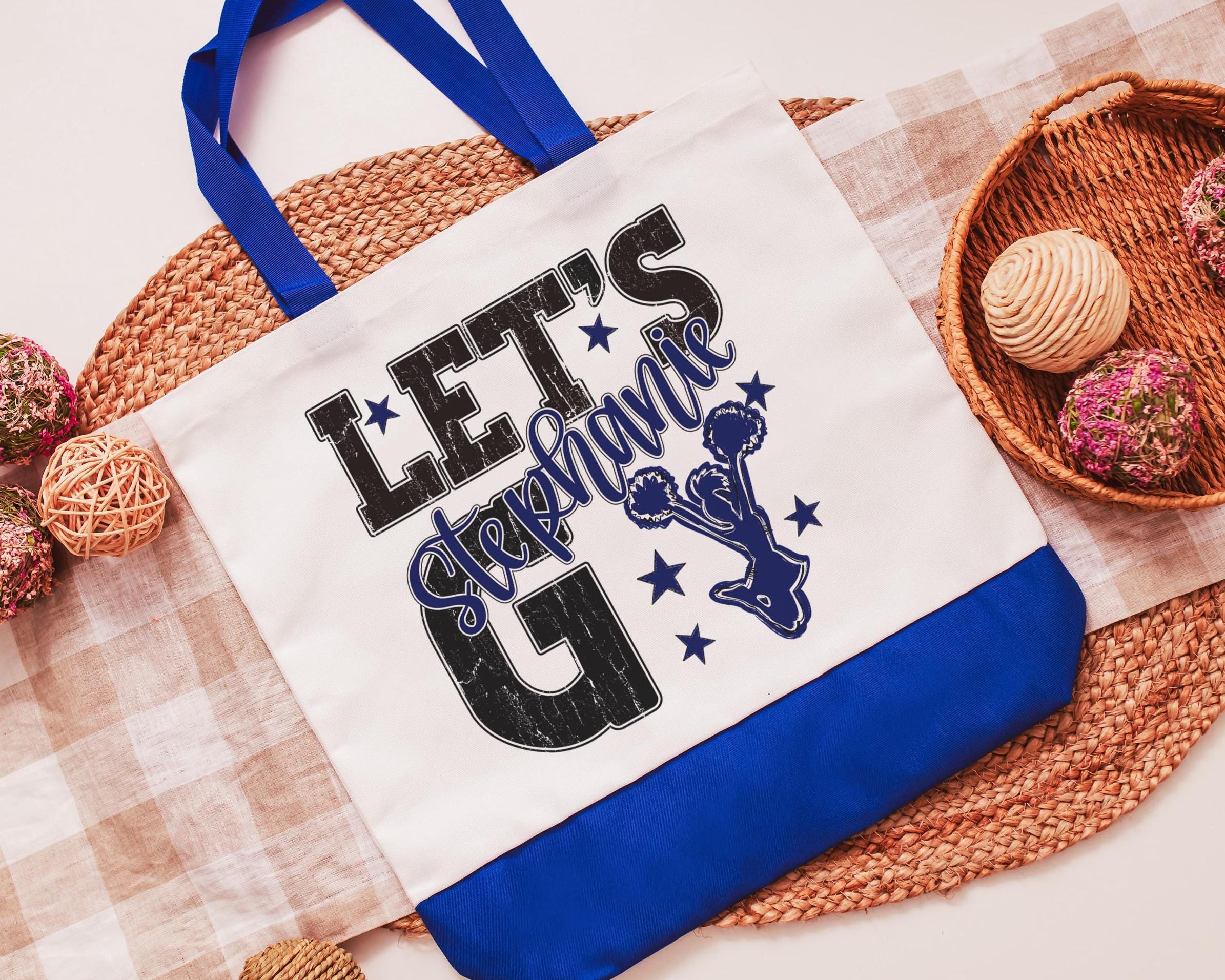 A personalized name with a lets go cheer style makes a great tote for events, travel, or everyday use. A fun pick for cheer gifts or tournament gifts, with a matching wristlet with zipper available separately or together as a set.
