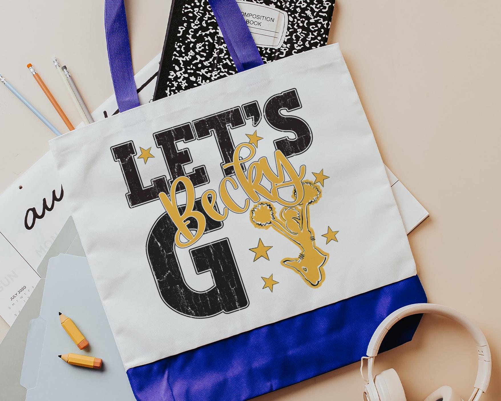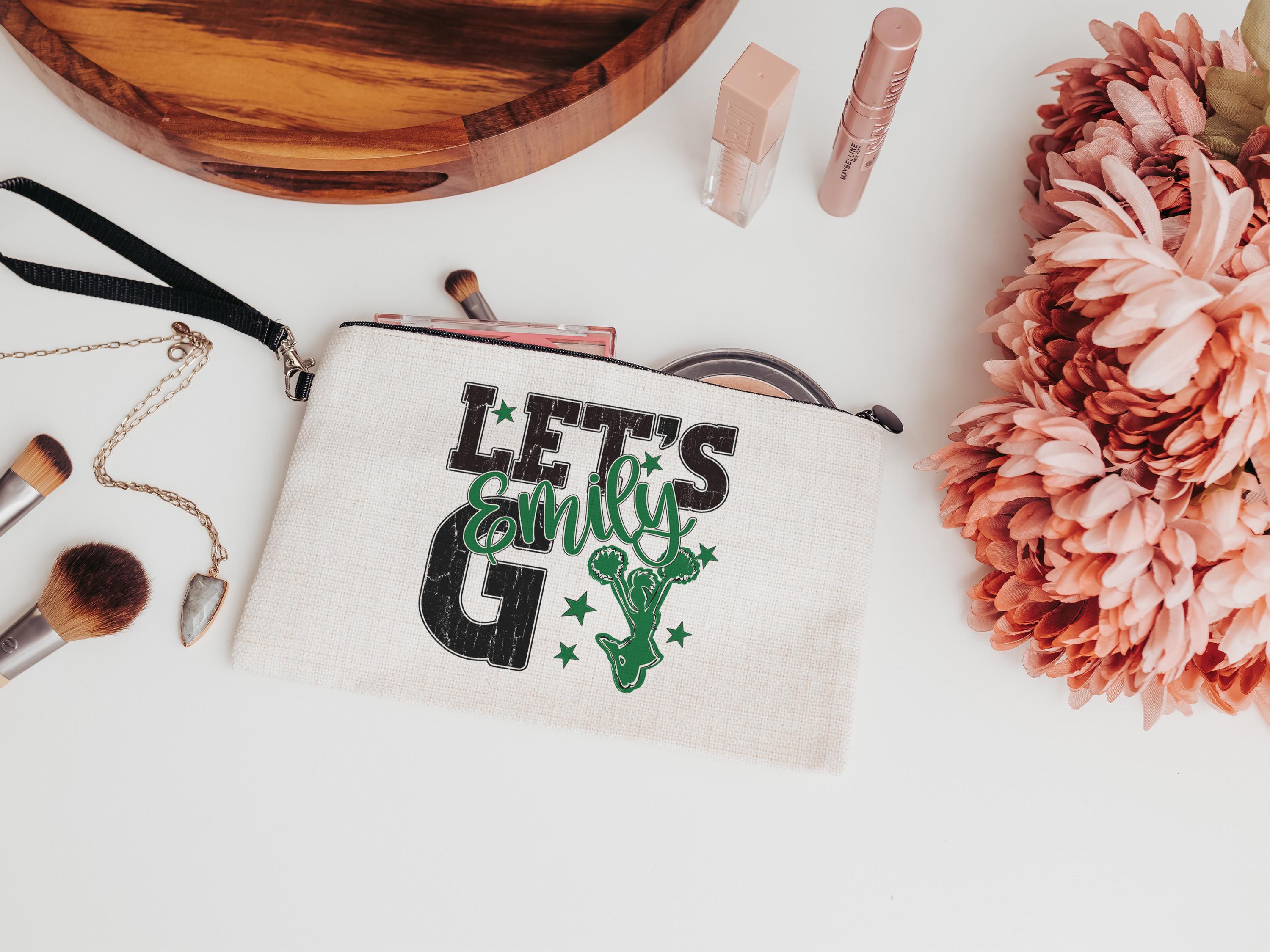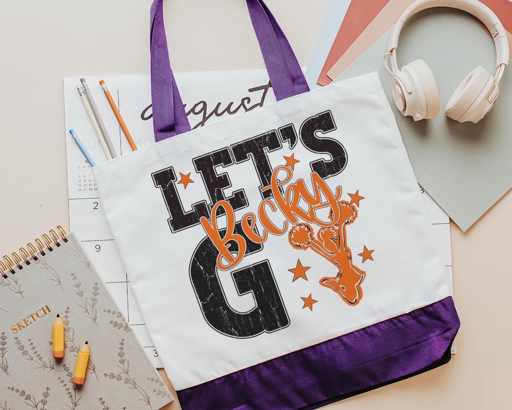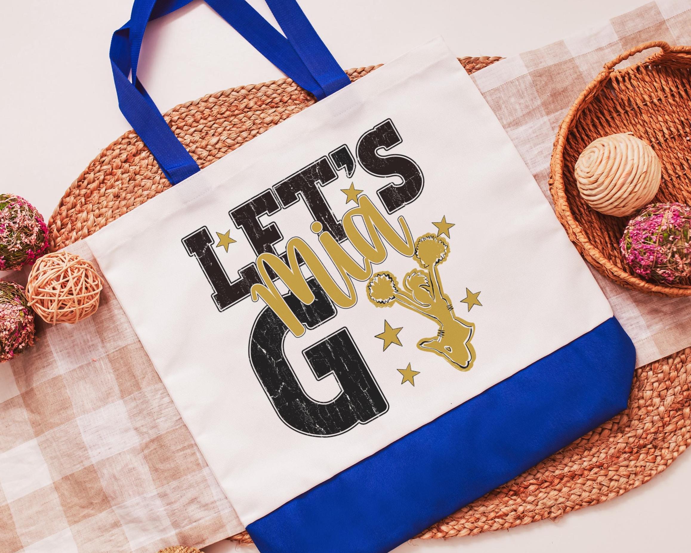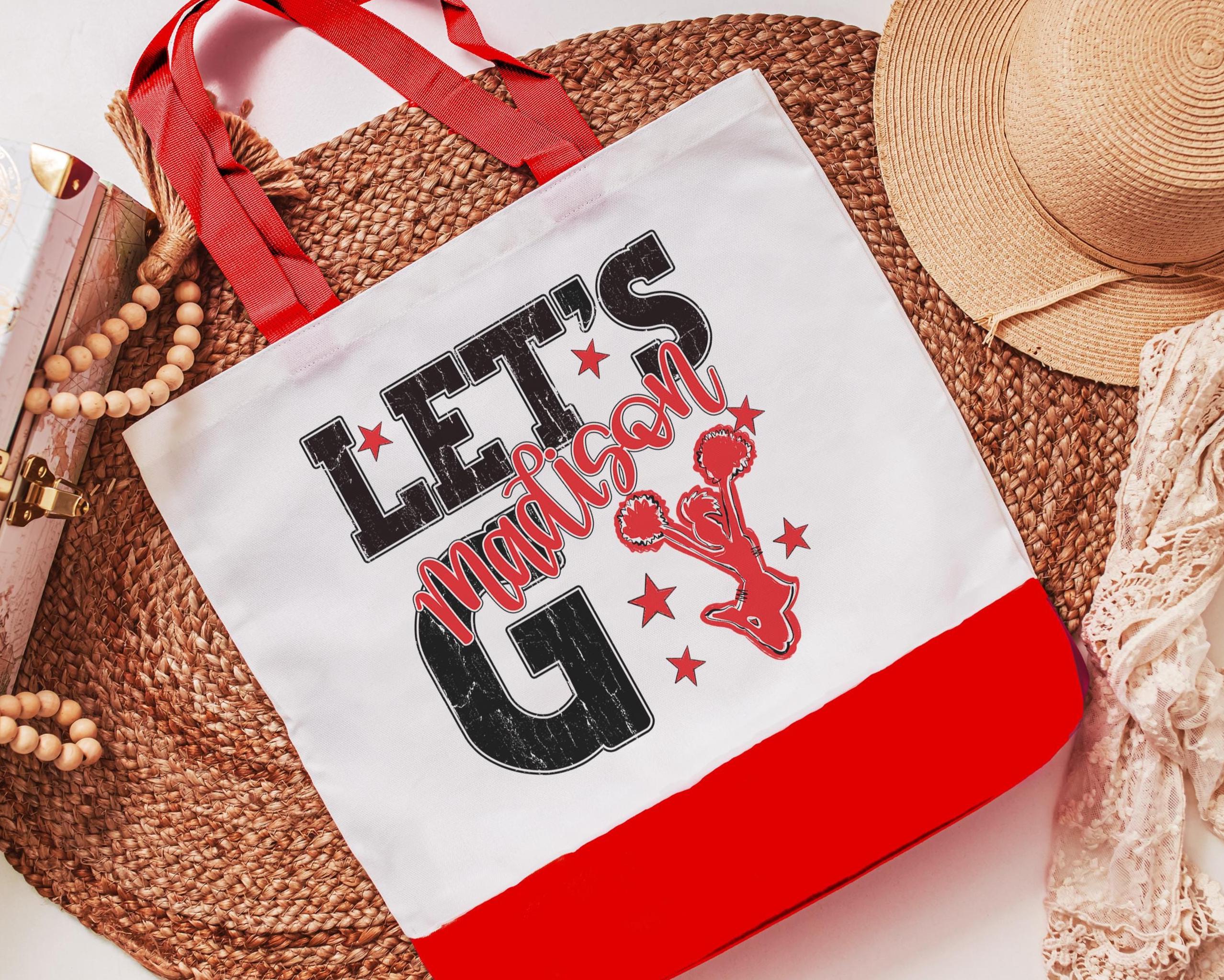 A personalized name with a lets go cheer style makes a great tote for events, travel, or everyday use. A fun pick for cheer gifts or tournament gifts, with a matching wristlet with zipper available separately or together as a set.