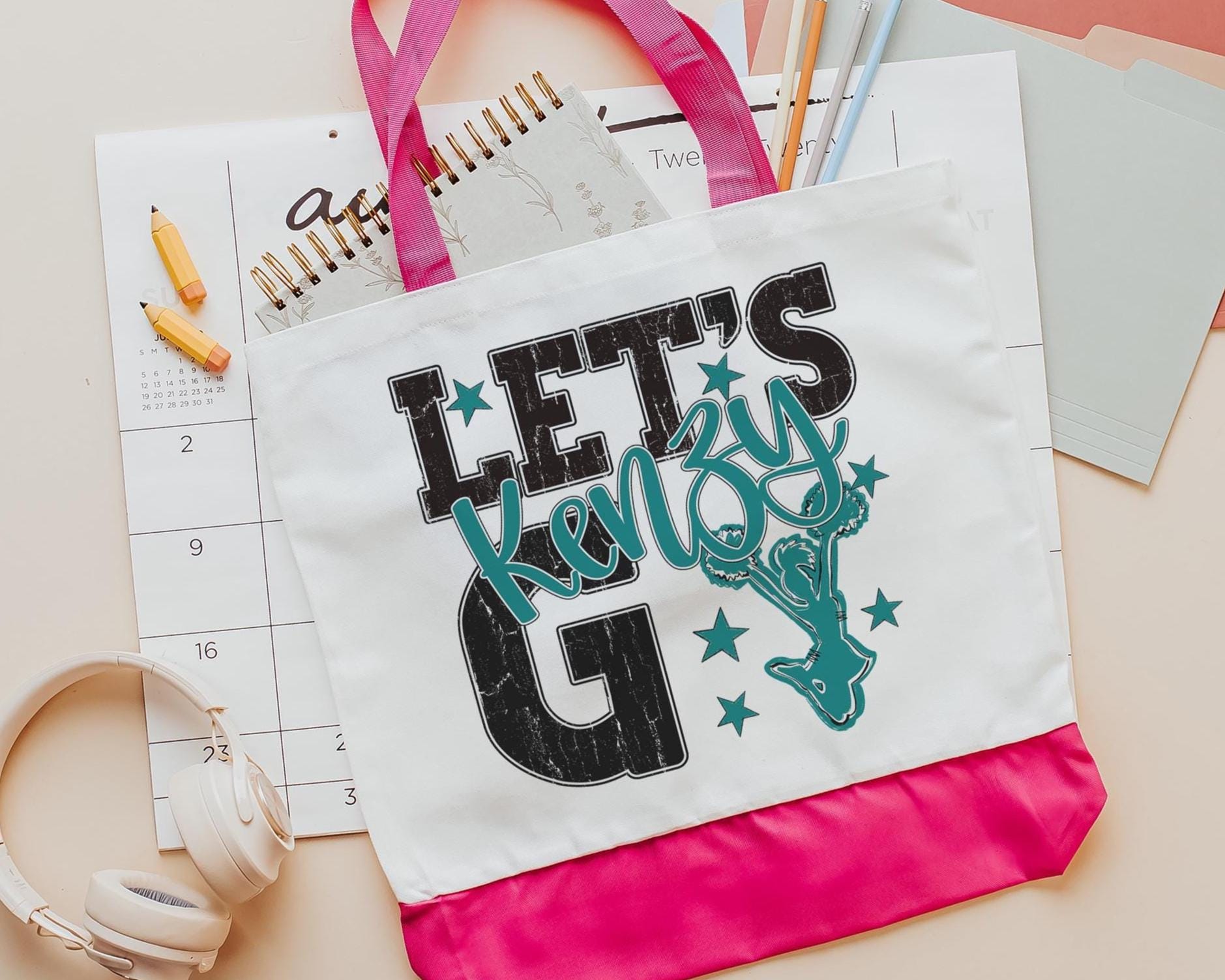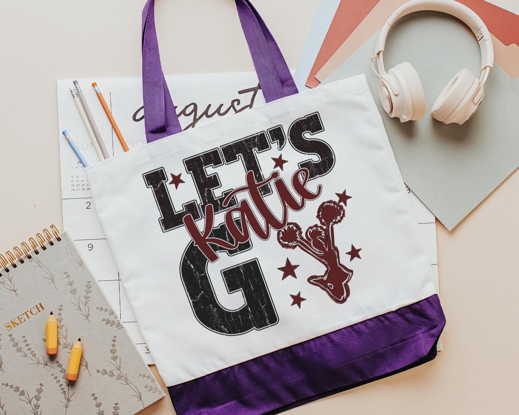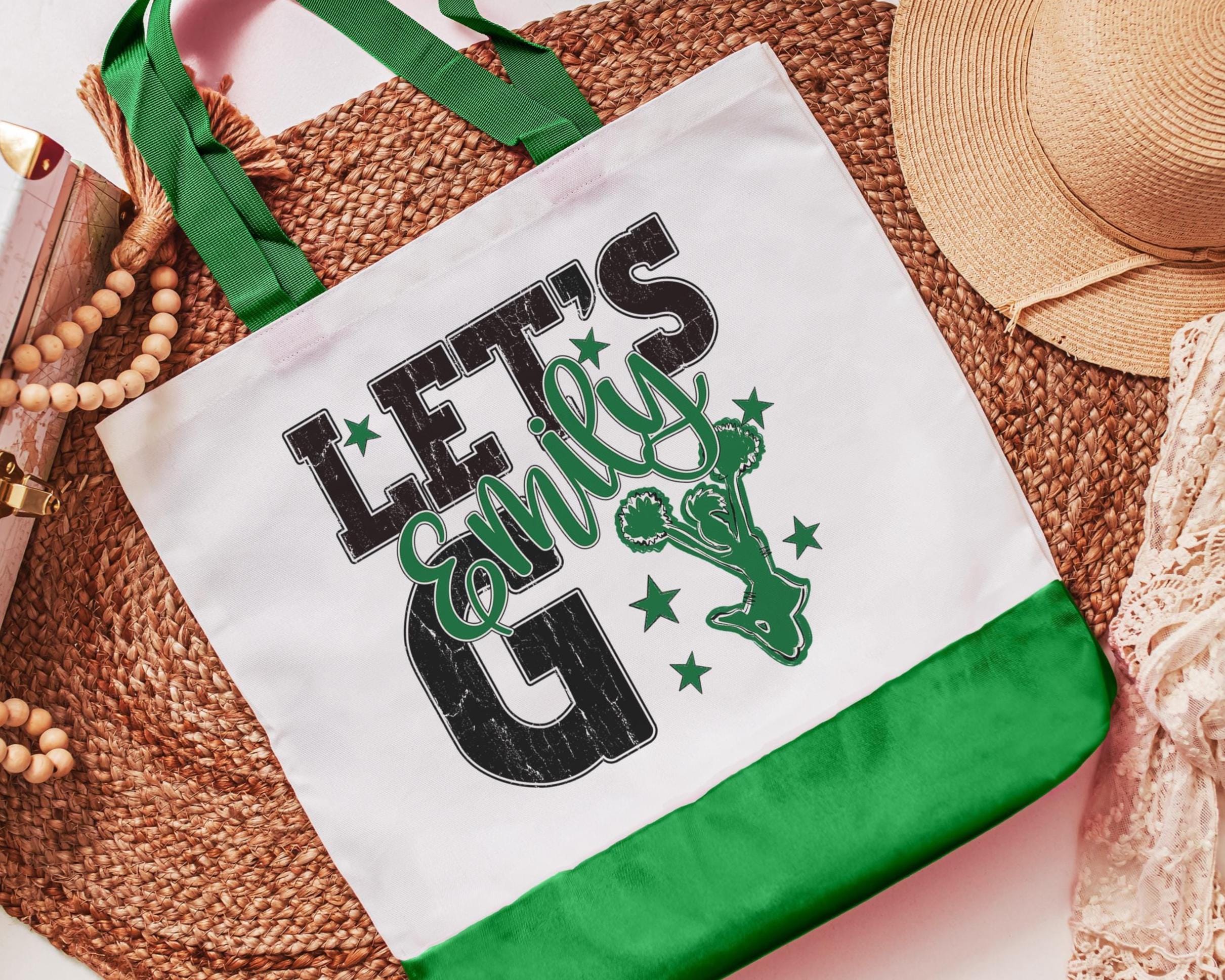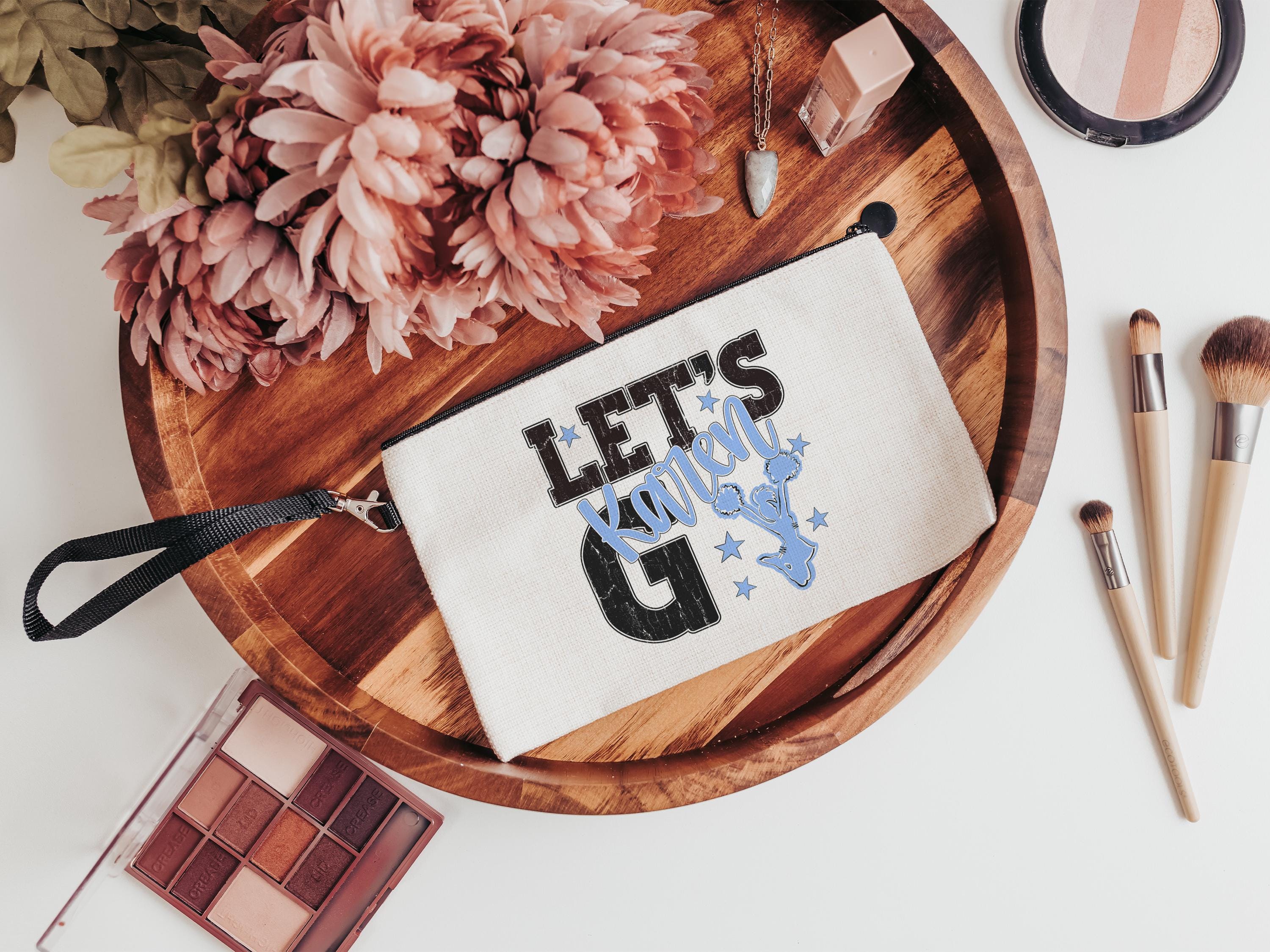 A personalized name with a lets go cheer style makes a great tote for events, travel, or everyday use. A fun pick for cheer gifts or tournament gifts, with a matching wristlet with zipper available separately or together as a set.