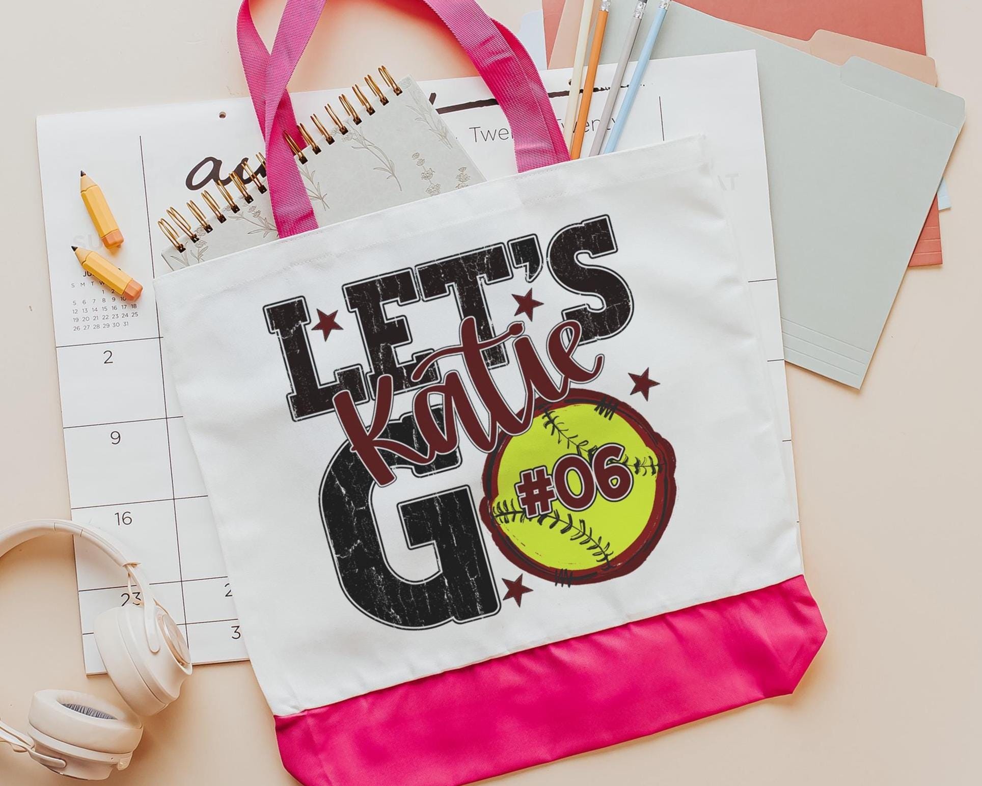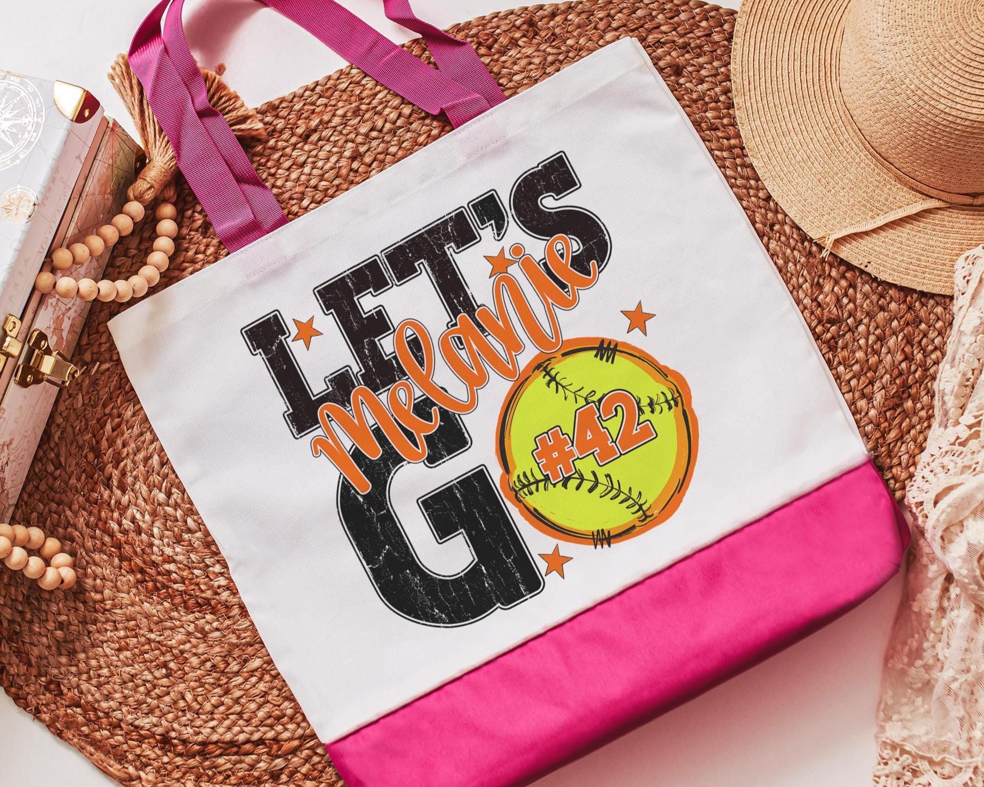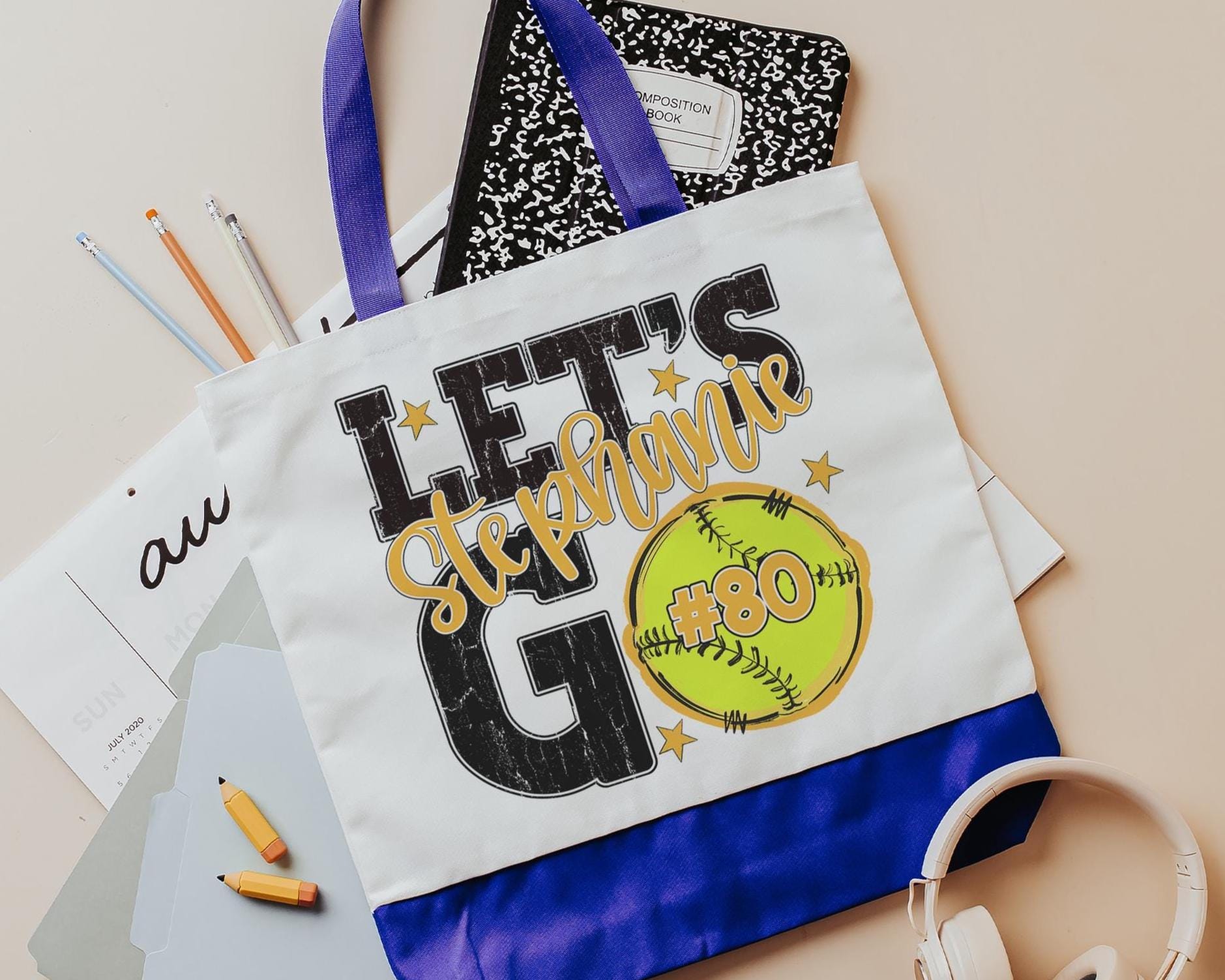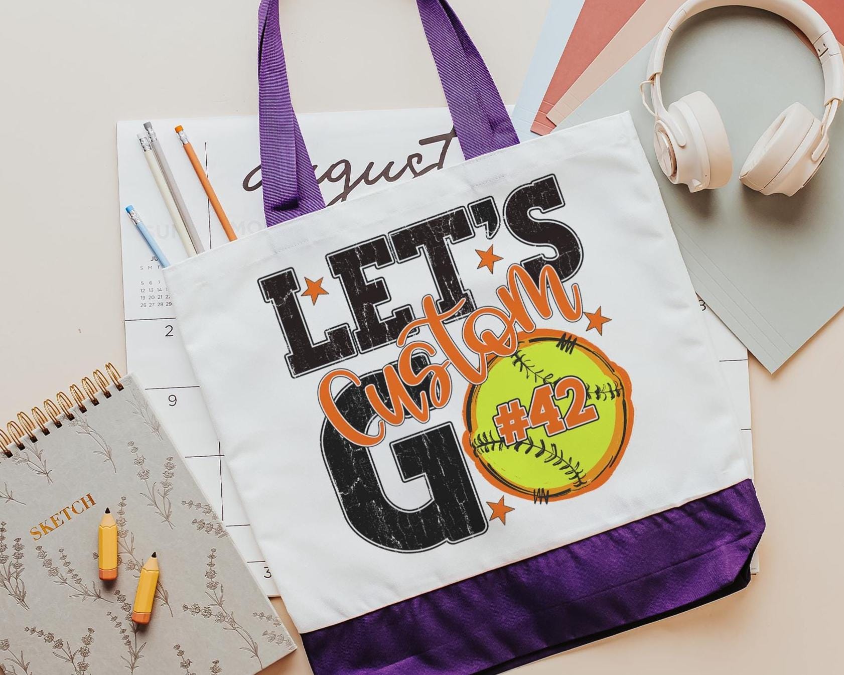 A personalized softball design adds a put-together look for tournaments, errands, or everyday use with a roomy tote bag. A matching wristlet with zipper is available to pair with it, making a great gift for her or any lady softball player who loves practical softball gifts.