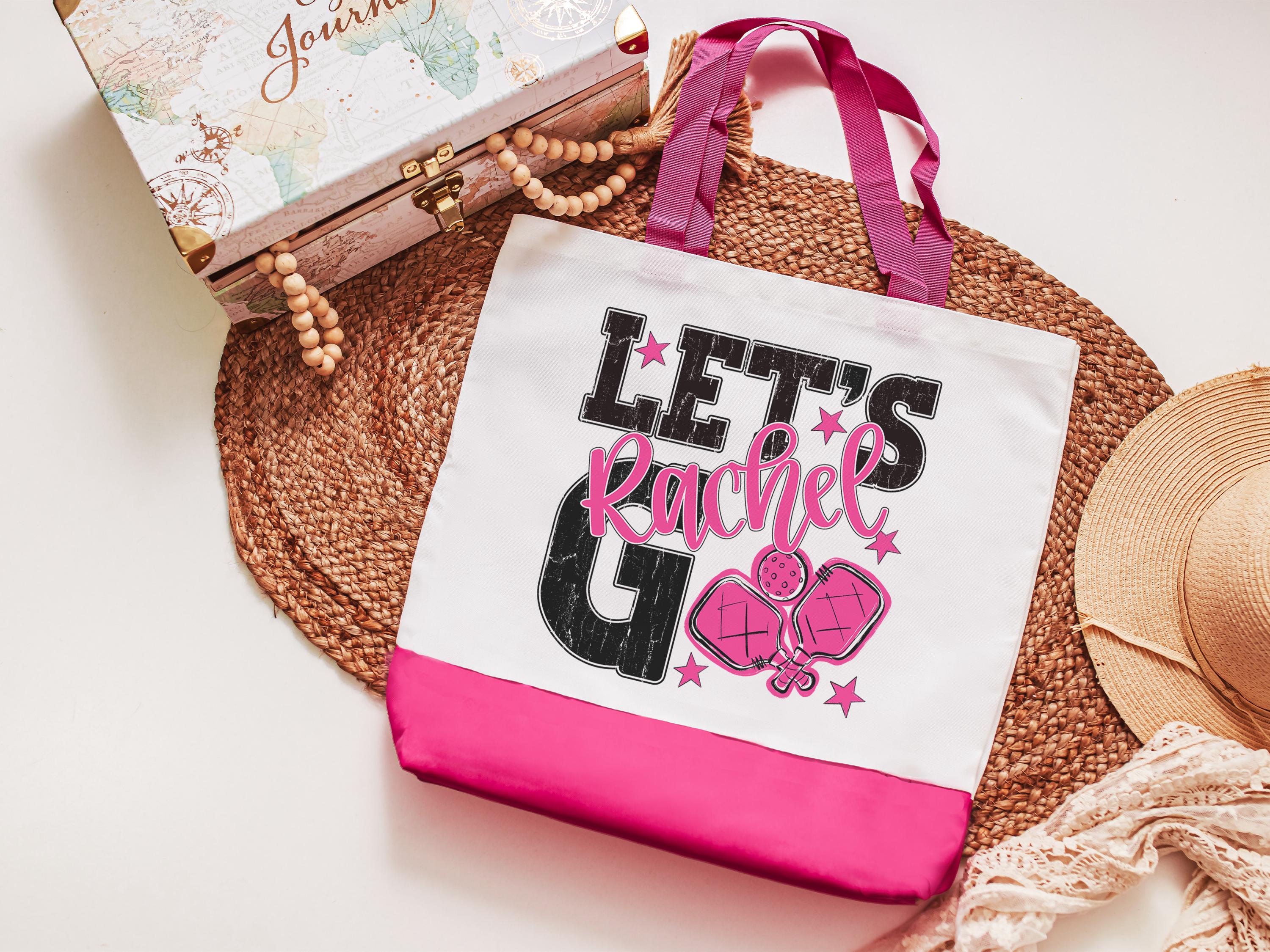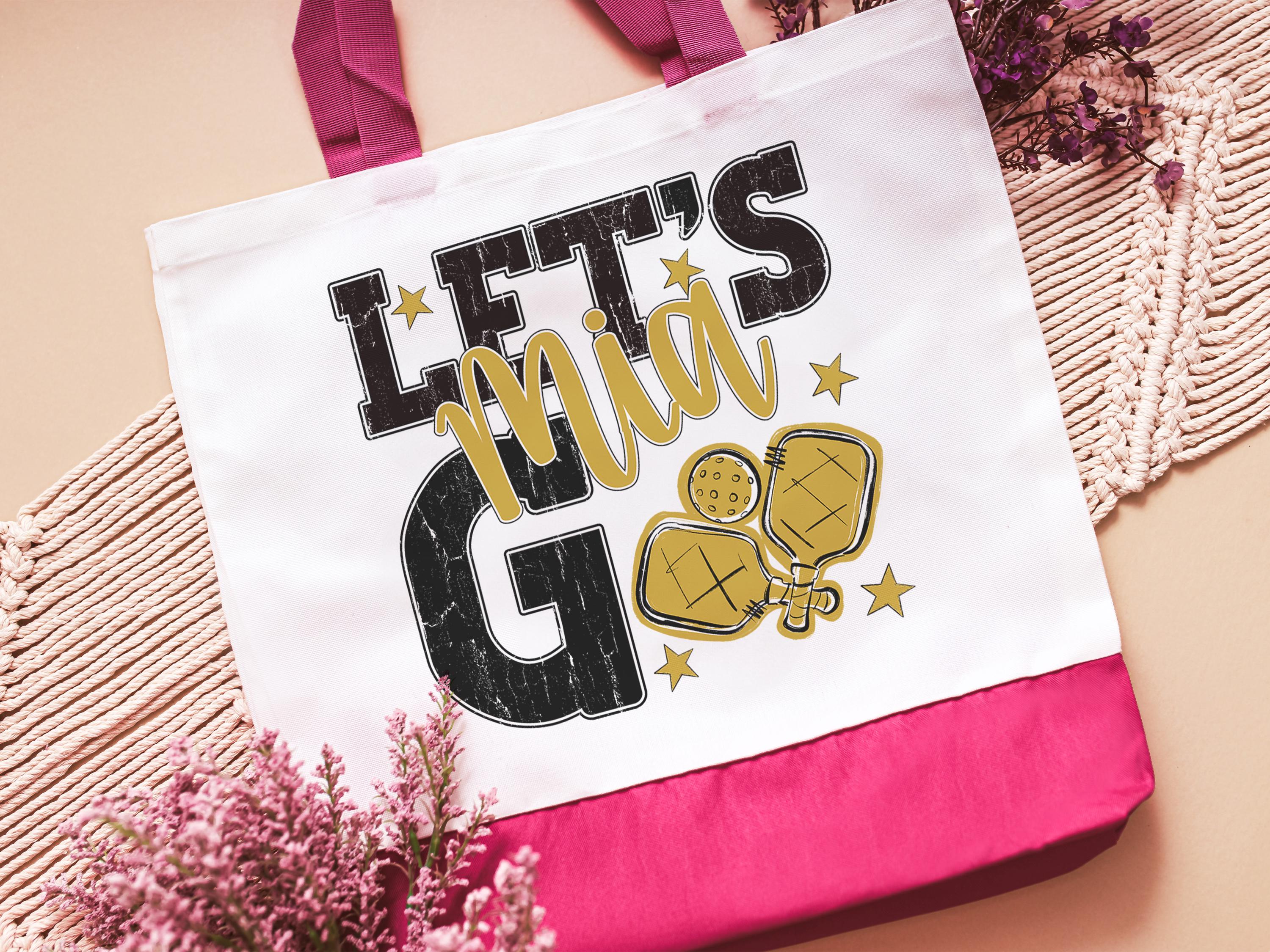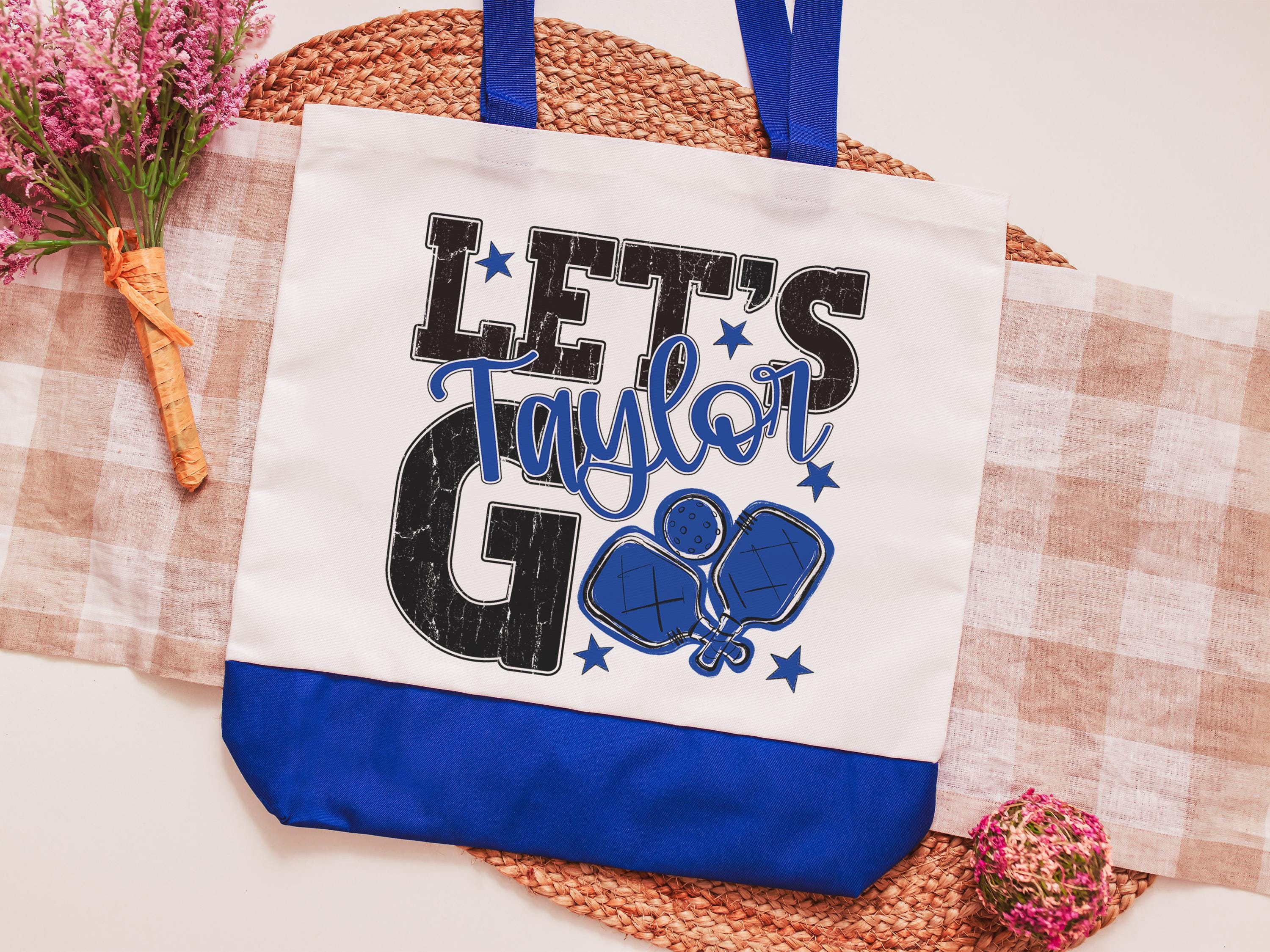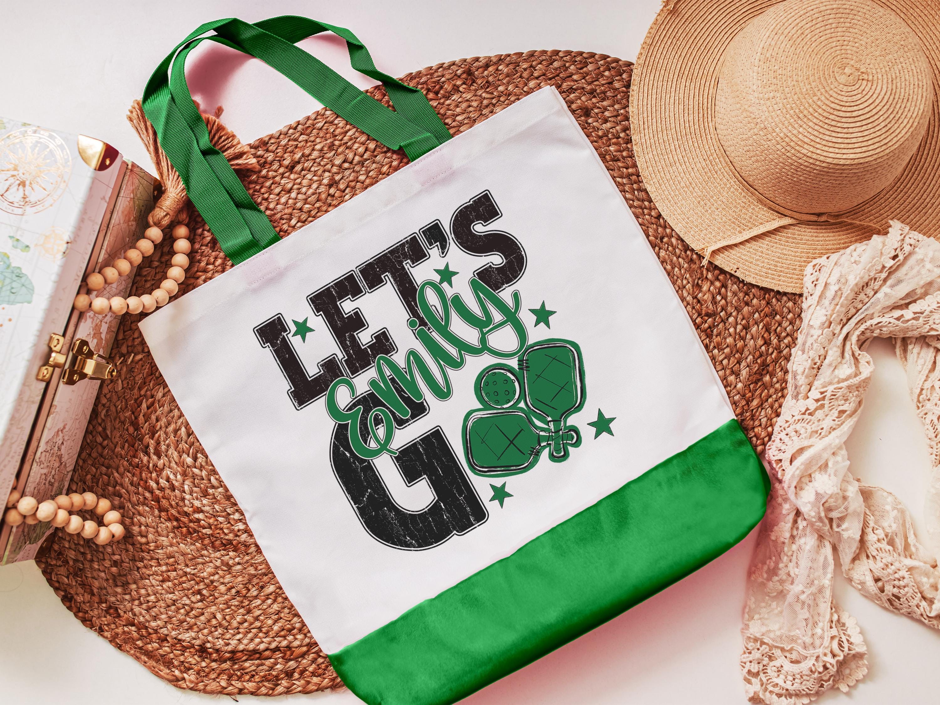 A personalized lets go pickleball design adds a put-together look for tournaments, errands, or everyday use with a roomy tote bag. A matching wristlet with zipper is available to pair with it, making a great gift for her or any lady pickleball player who loves practical pickleball gifts.