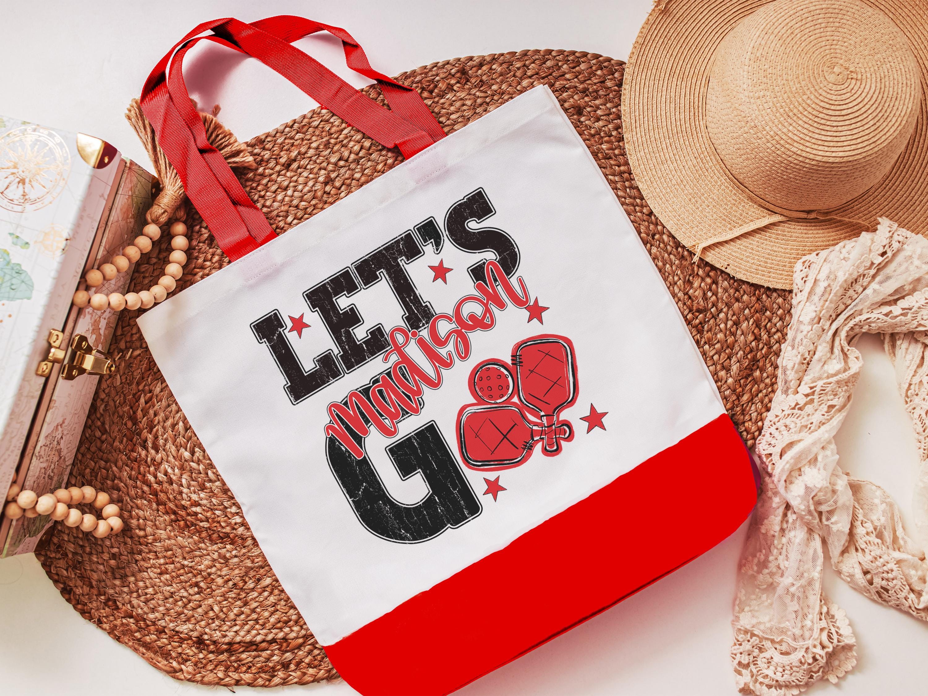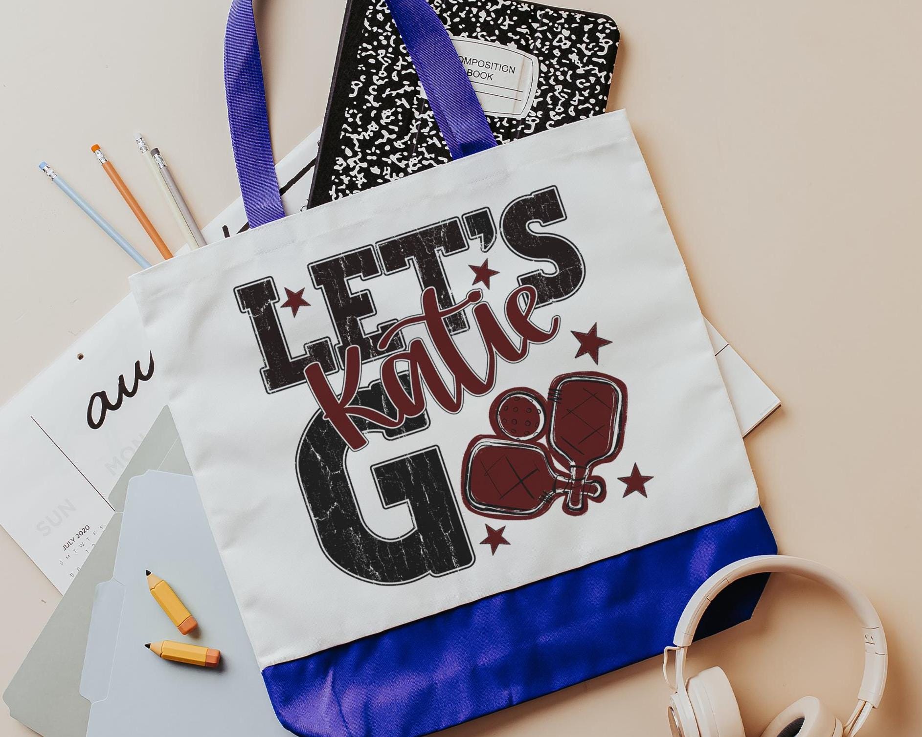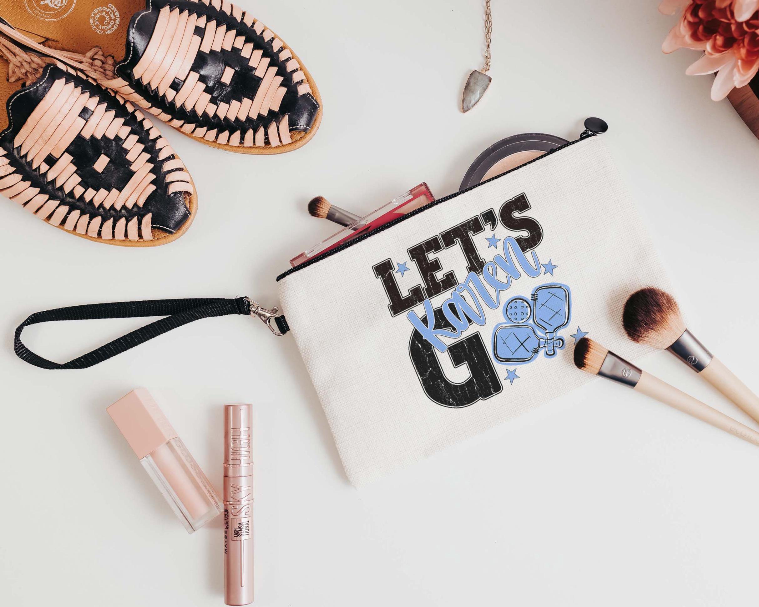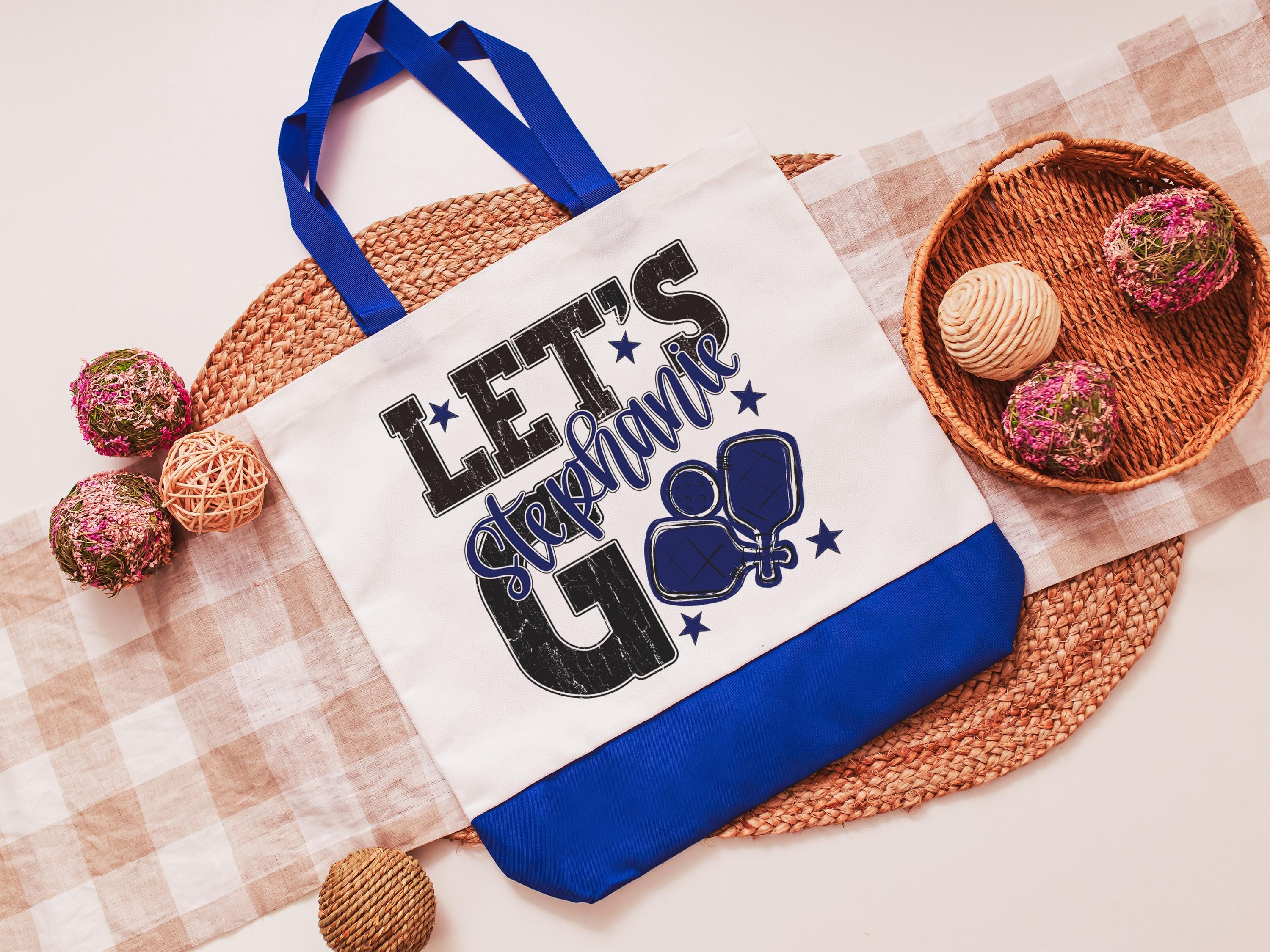 A personalized lets go pickleball design adds a put-together look for tournaments, errands, or everyday use with a roomy tote bag. A matching wristlet with zipper is available to pair with it, making a great gift for her or any lady pickleball player who loves practical pickleball gifts.