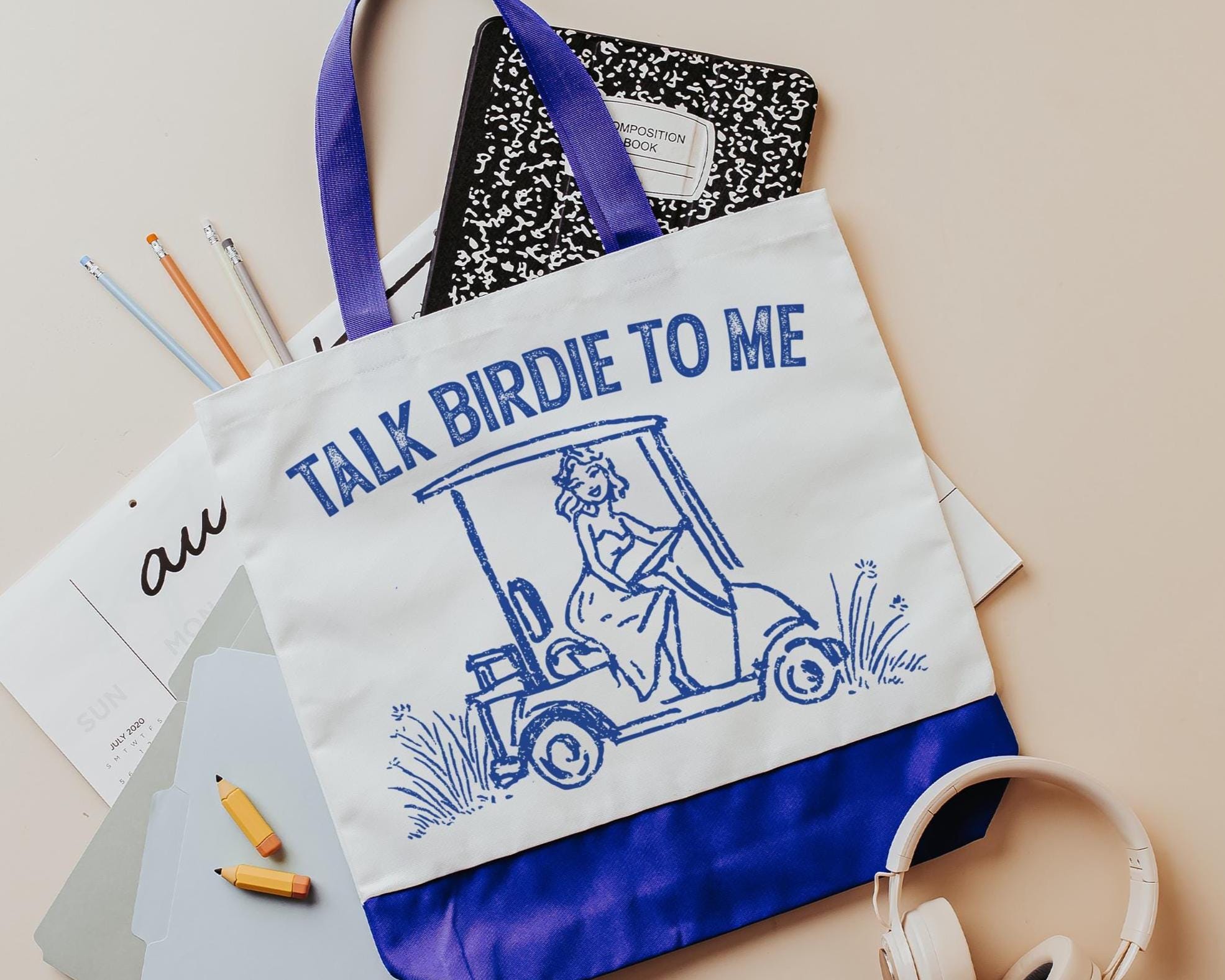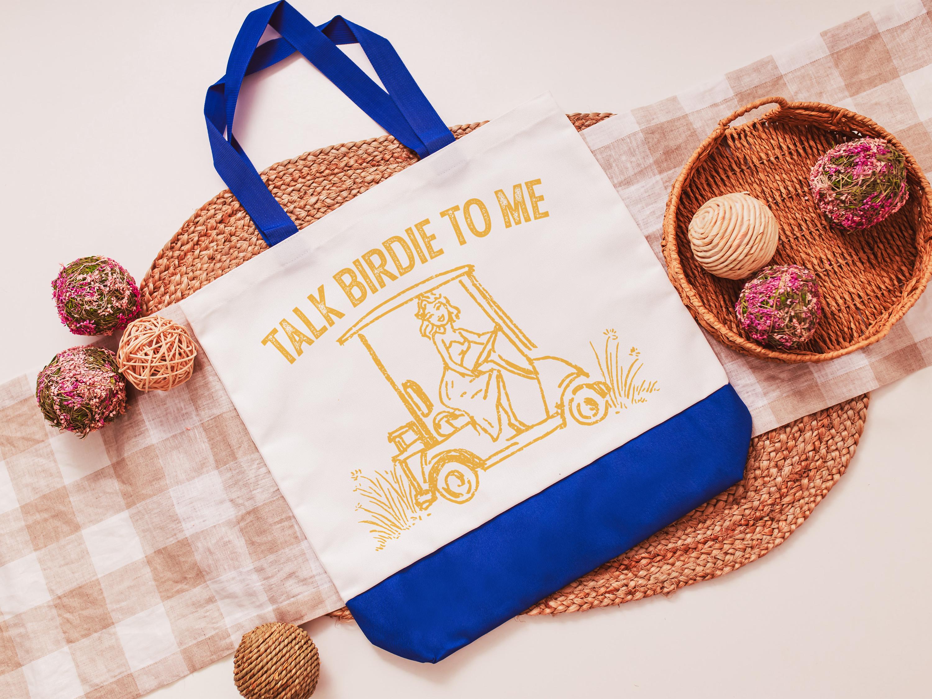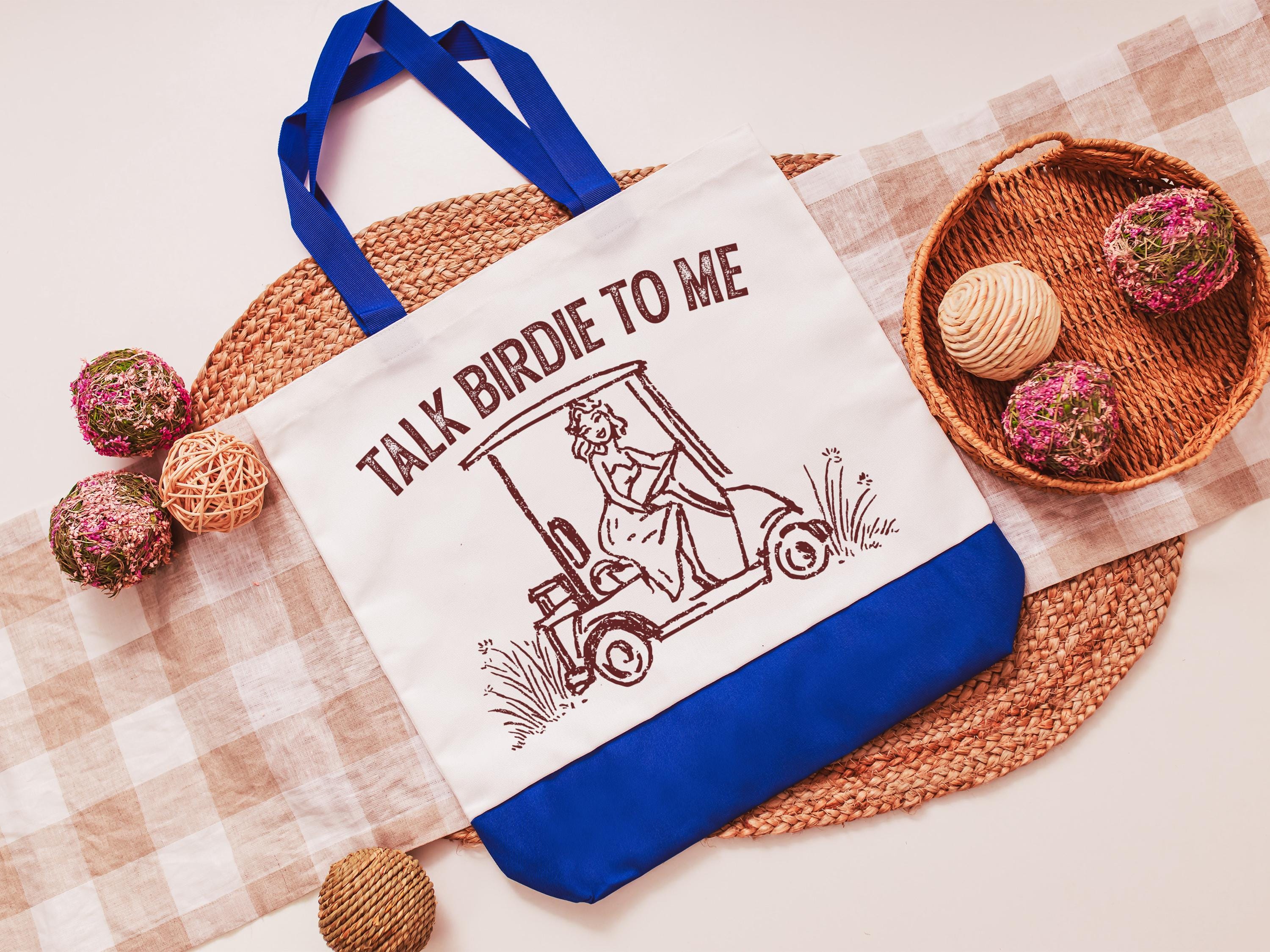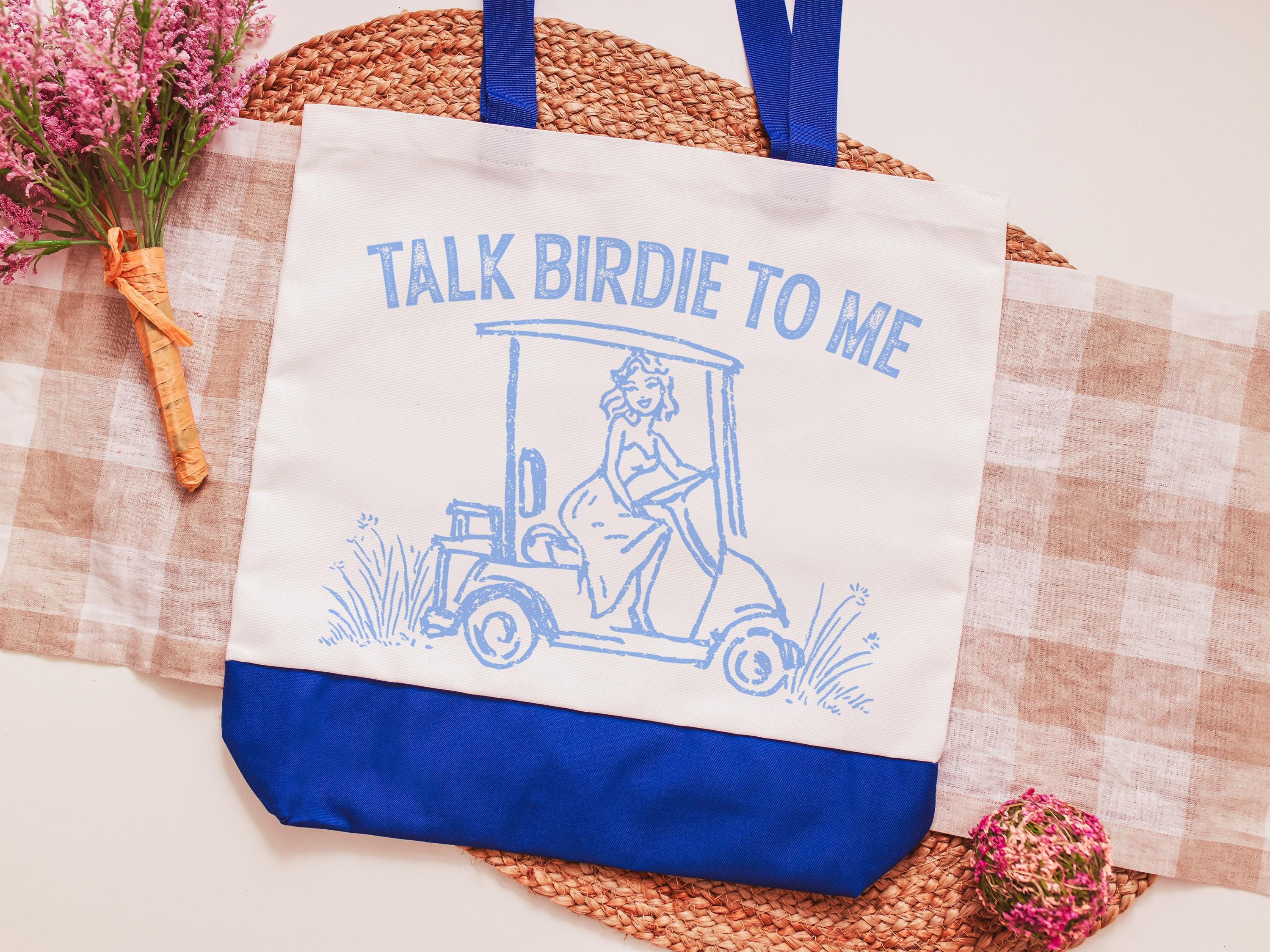 A columbia blue talk birdie to me sassy design makes a great tote for the course, tournaments, or everyday errands. A great pick for golf gifts, with a matching wristlet with zipper available separately or together as a set.