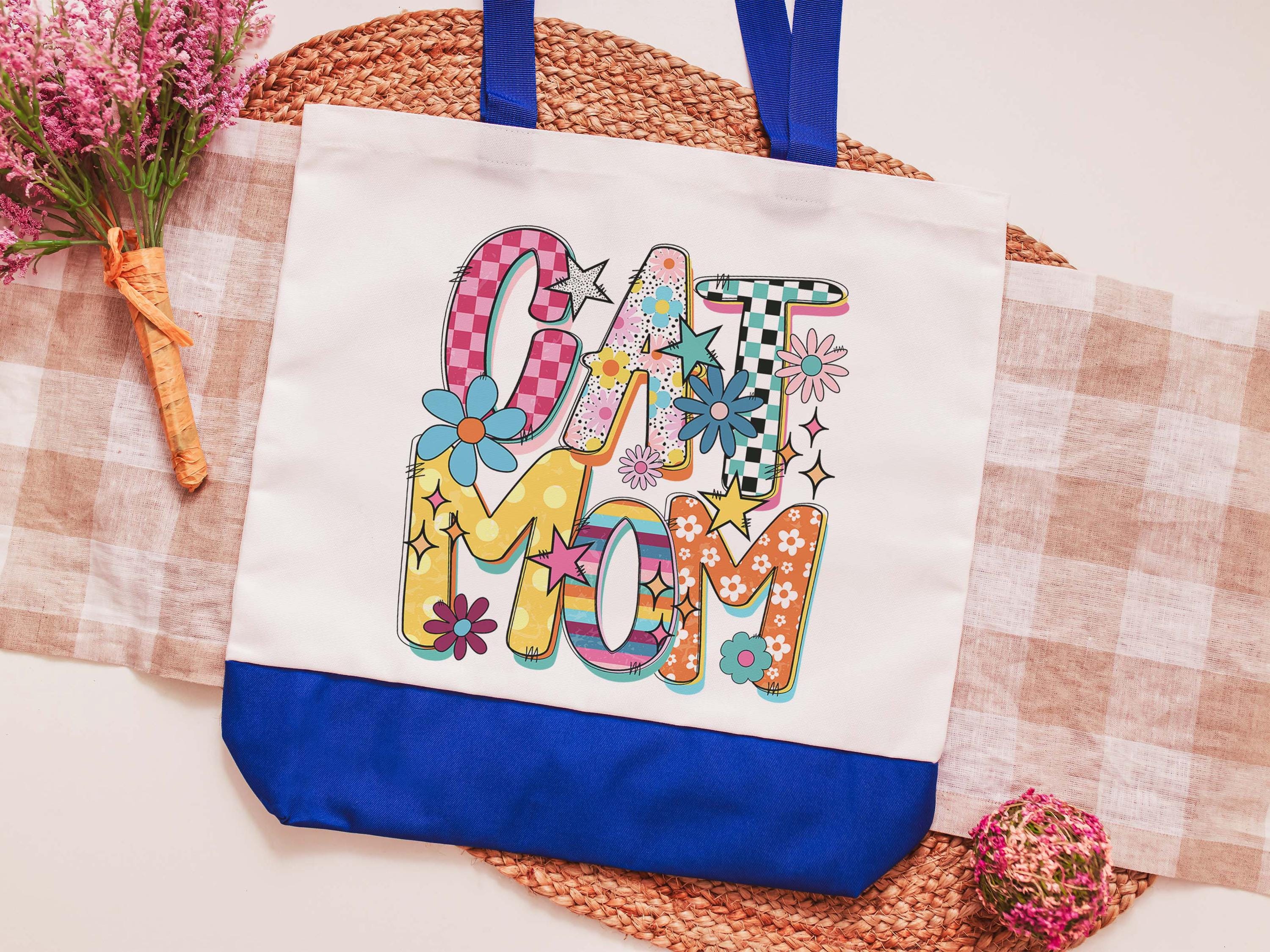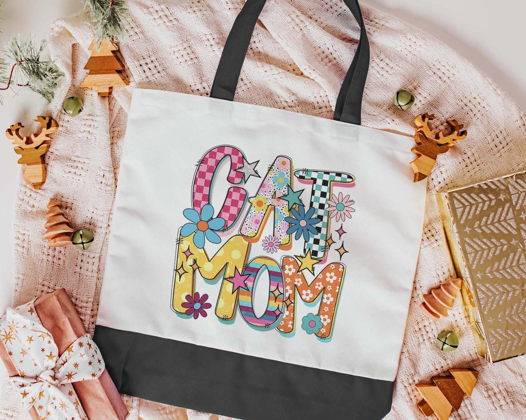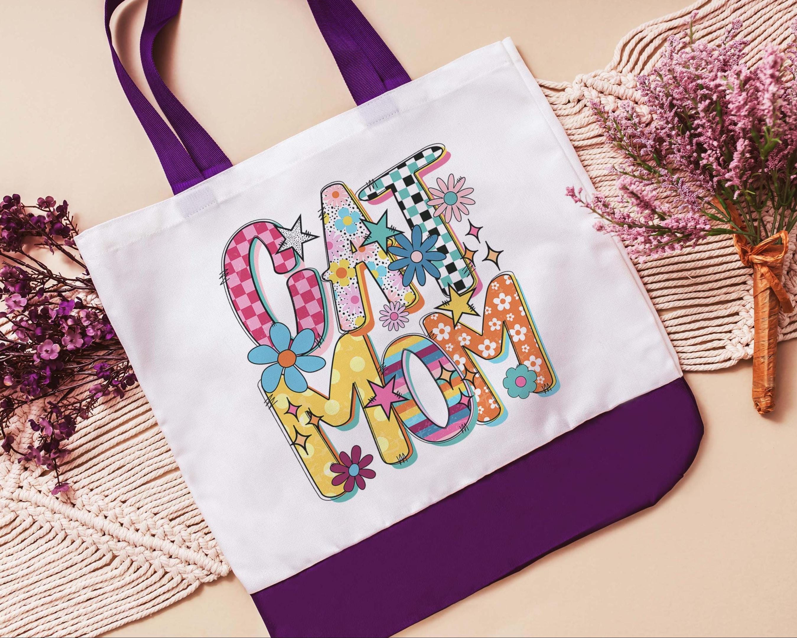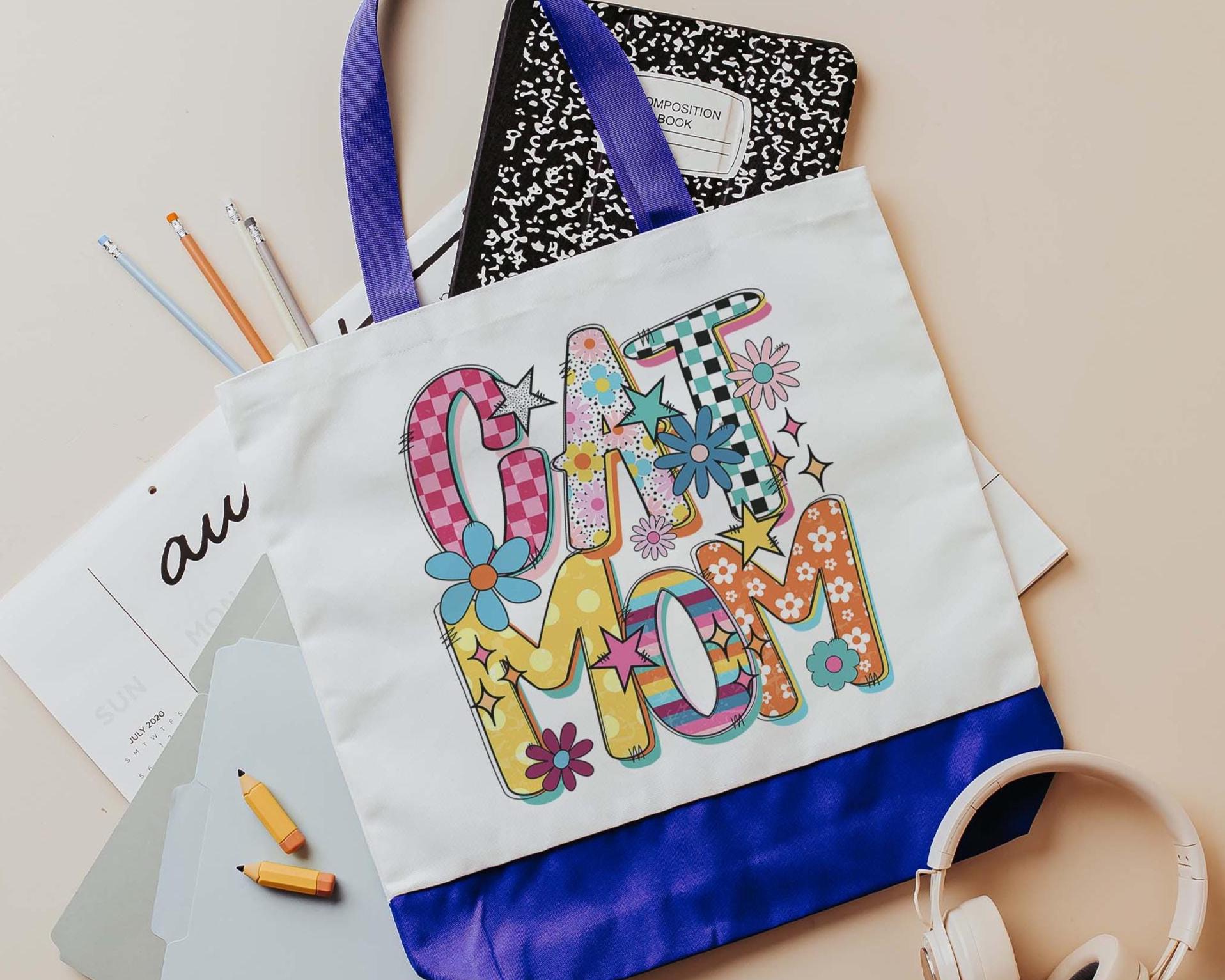 A colorful rainbow design says it all for this cat mom tote. A handy bag for errands, or everyday use, and a great gift for cat lovers or cat owners. A fun choice for cat moms who want something practical with personality.