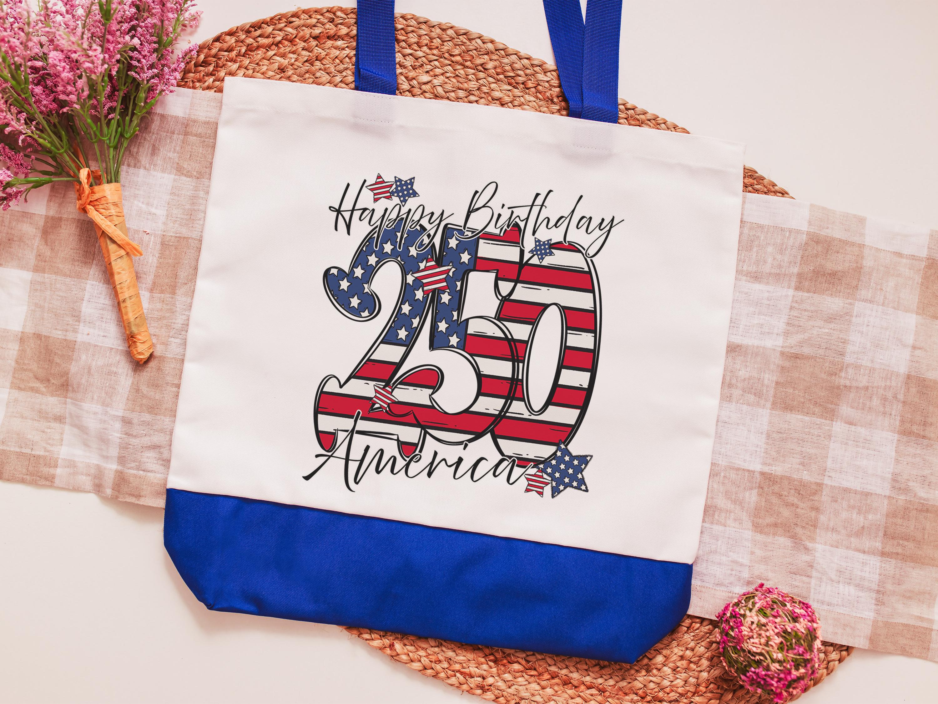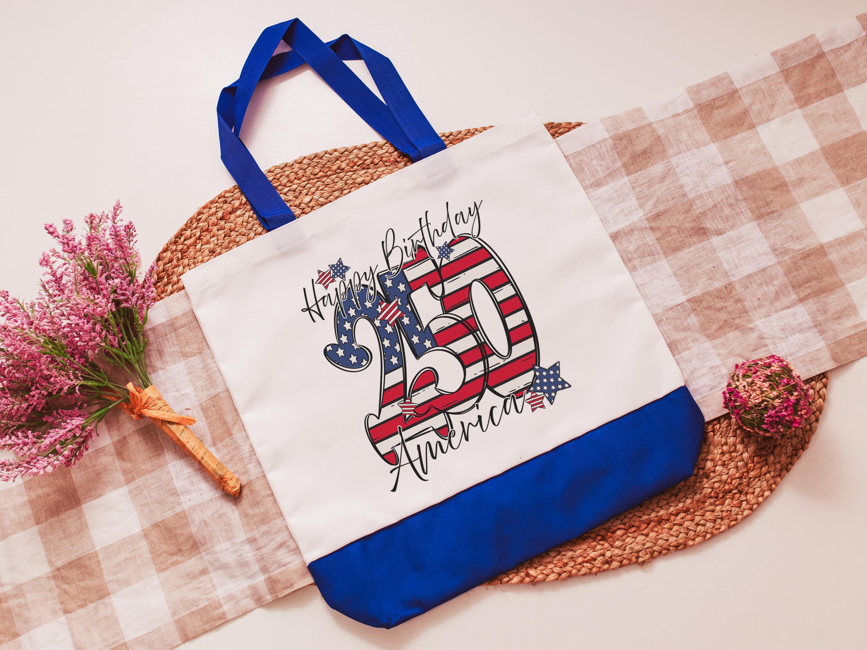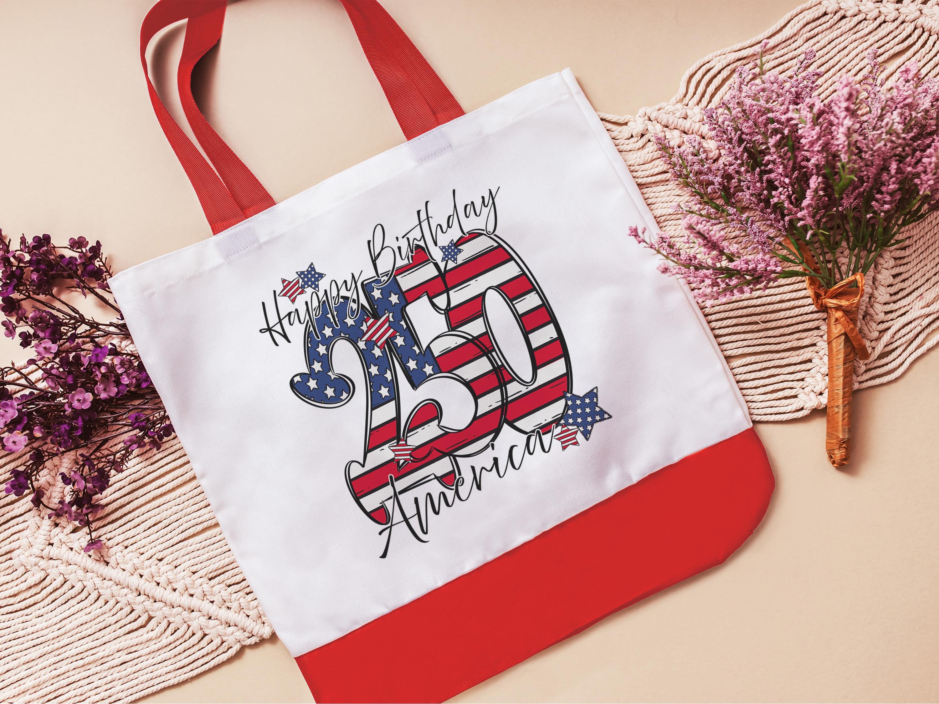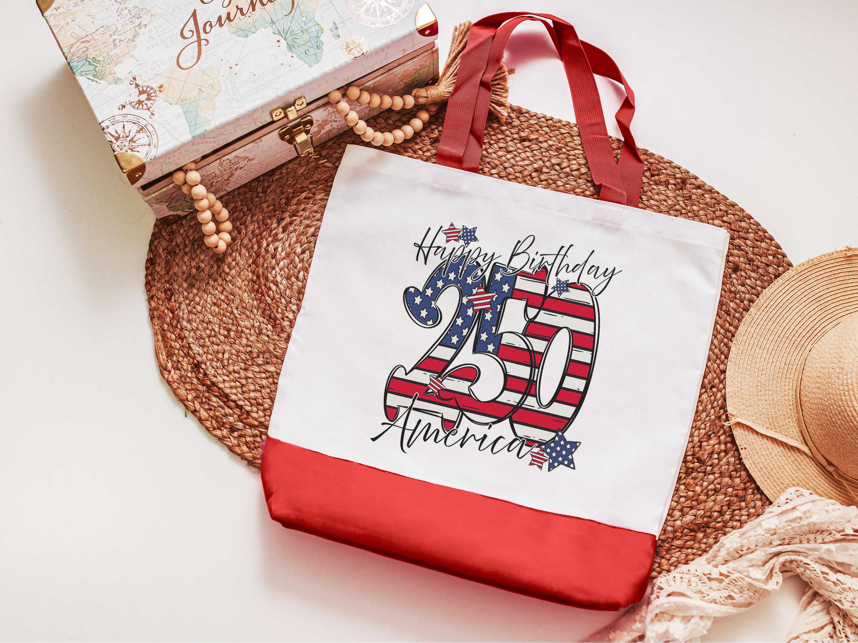 Carry a little red, white, and blue with you with this happy birthday 250 years America tote. A handy bag for summer errands, events, or everyday use and a great choice for 4th of July or patriotic gifts. A thoughtful option for military moms and anyone who loves patriotic style.
