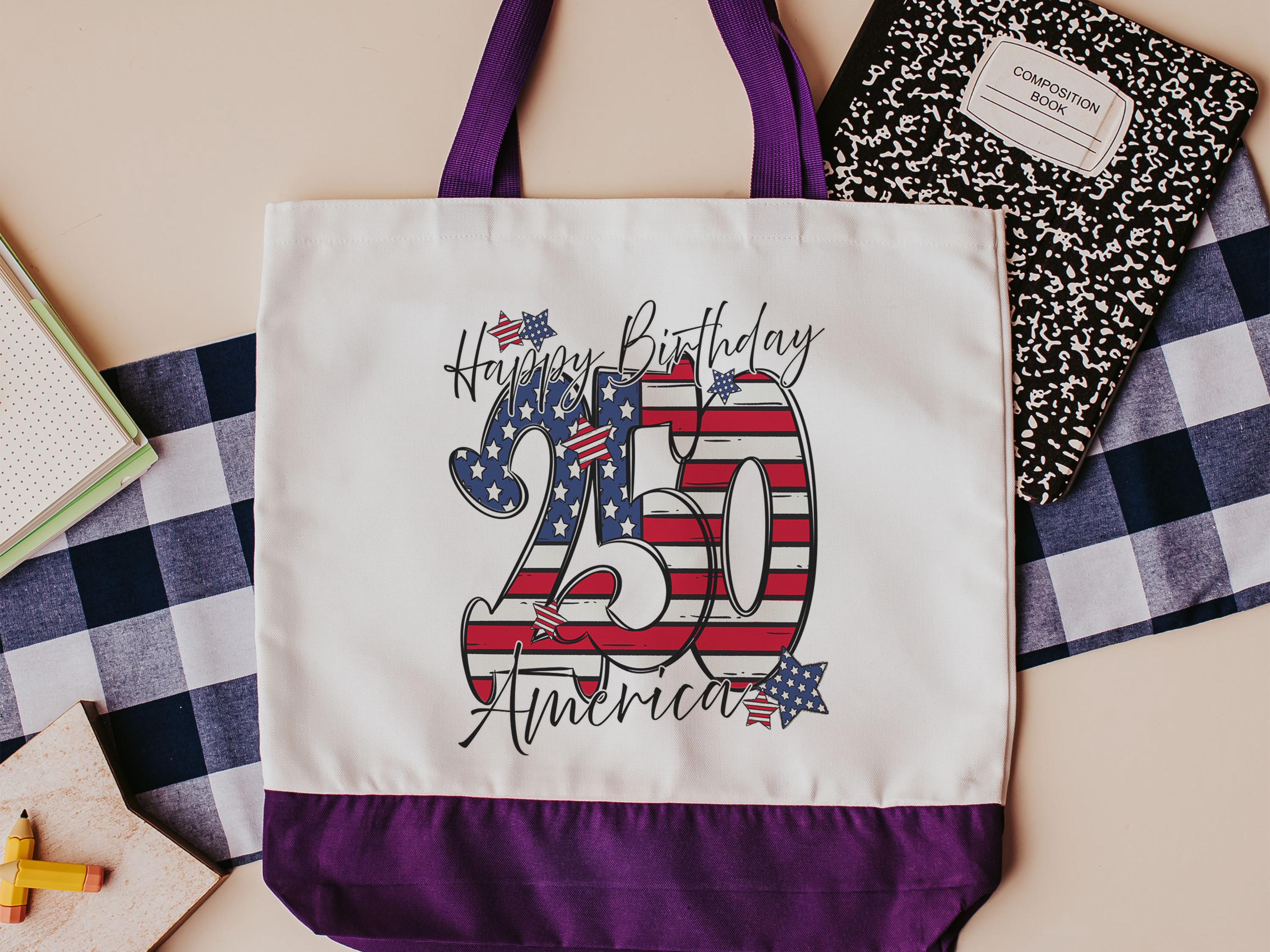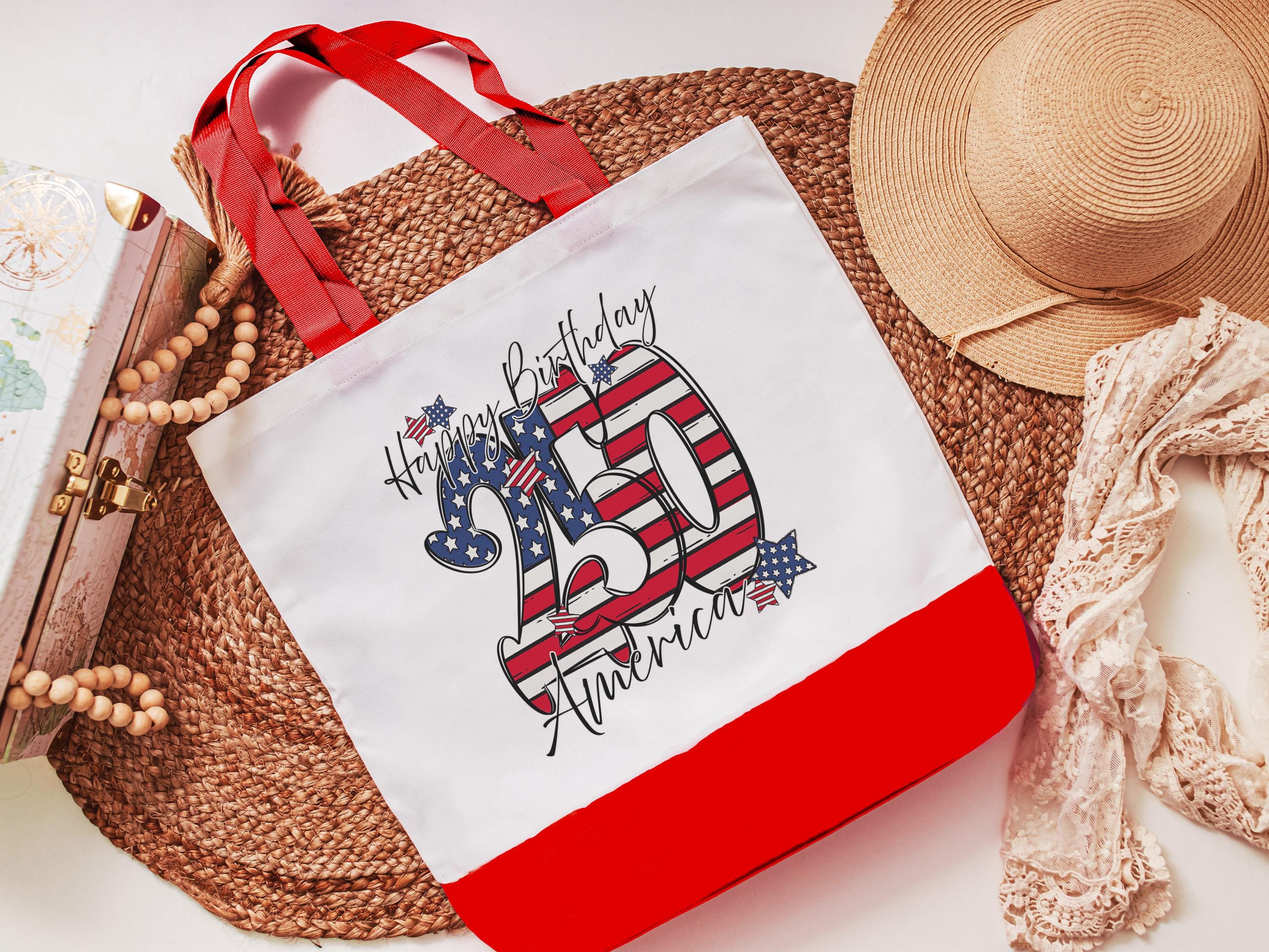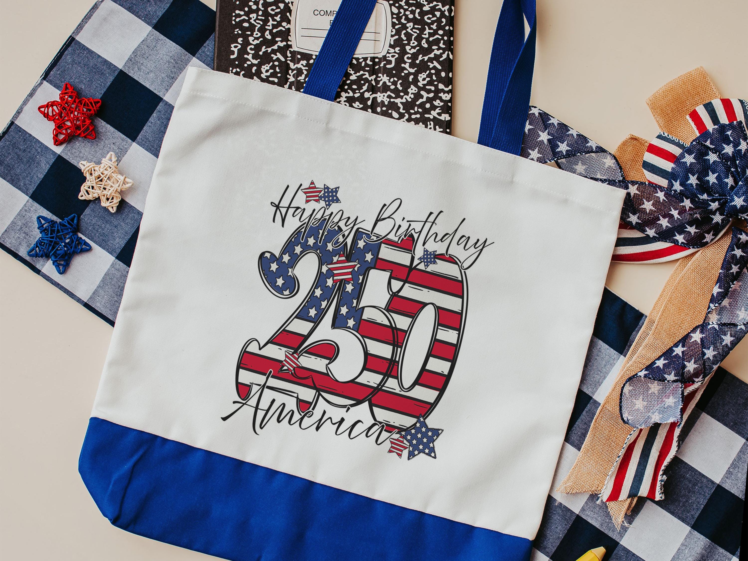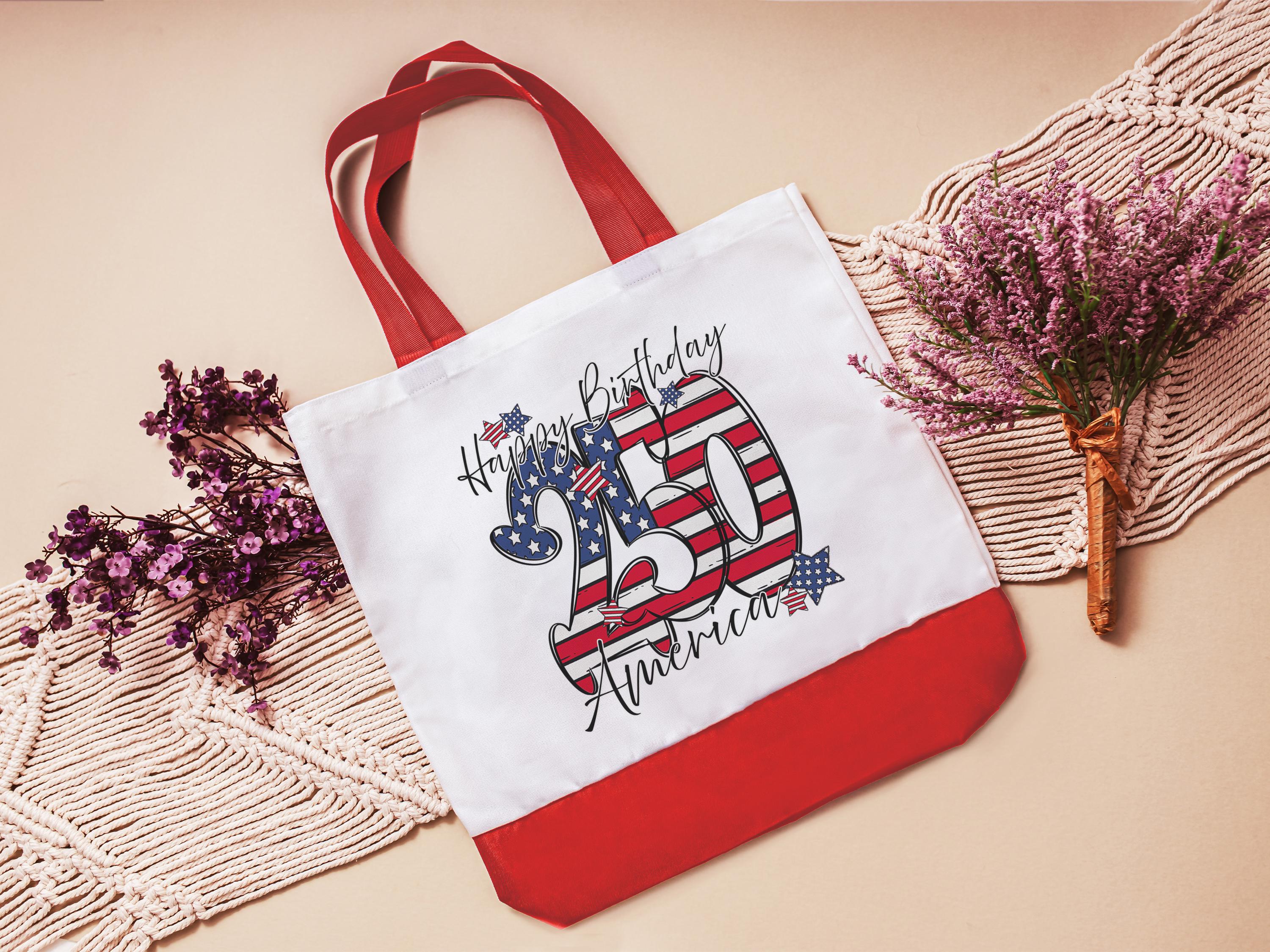 Carry a little red, white, and blue with you with this happy birthday 250 years America tote. A handy bag for summer errands, events, or everyday use and a great choice for 4th of July or patriotic gifts. A thoughtful option for military moms and anyone who loves patriotic style.