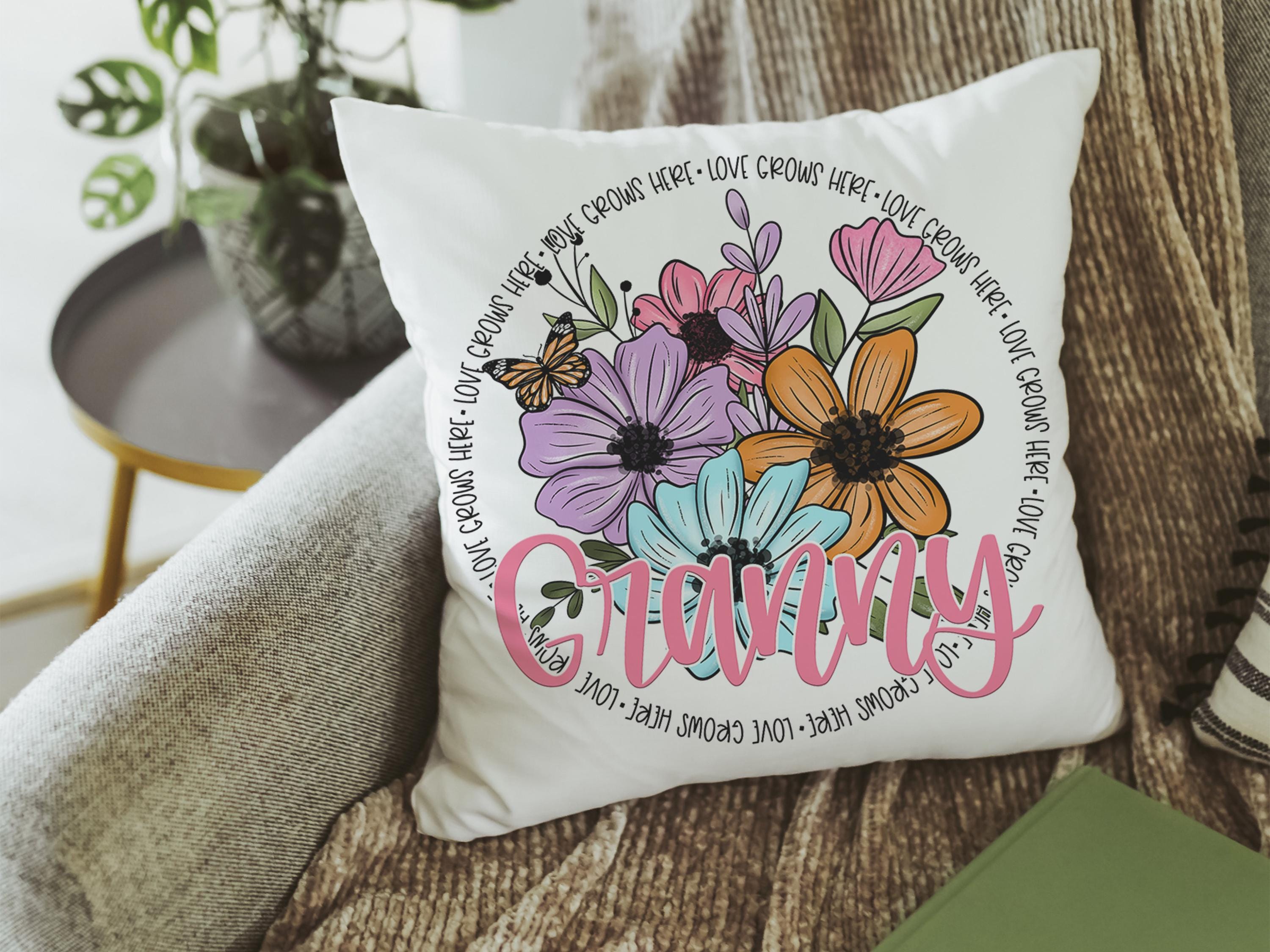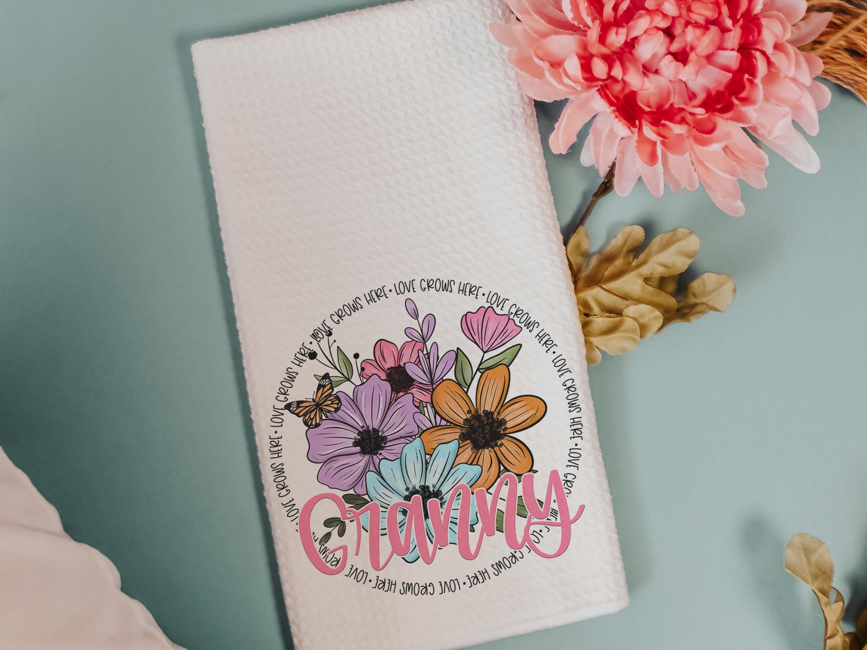 A personalized touch with a floral garden style makes a sweet addition to a kitchen, garden space, or favorite chair. A great pick for Granny, Nana, Grammie, Gigi, or Mimi for Mothers Day, with matching pillows and towels available separately or together as a set.
