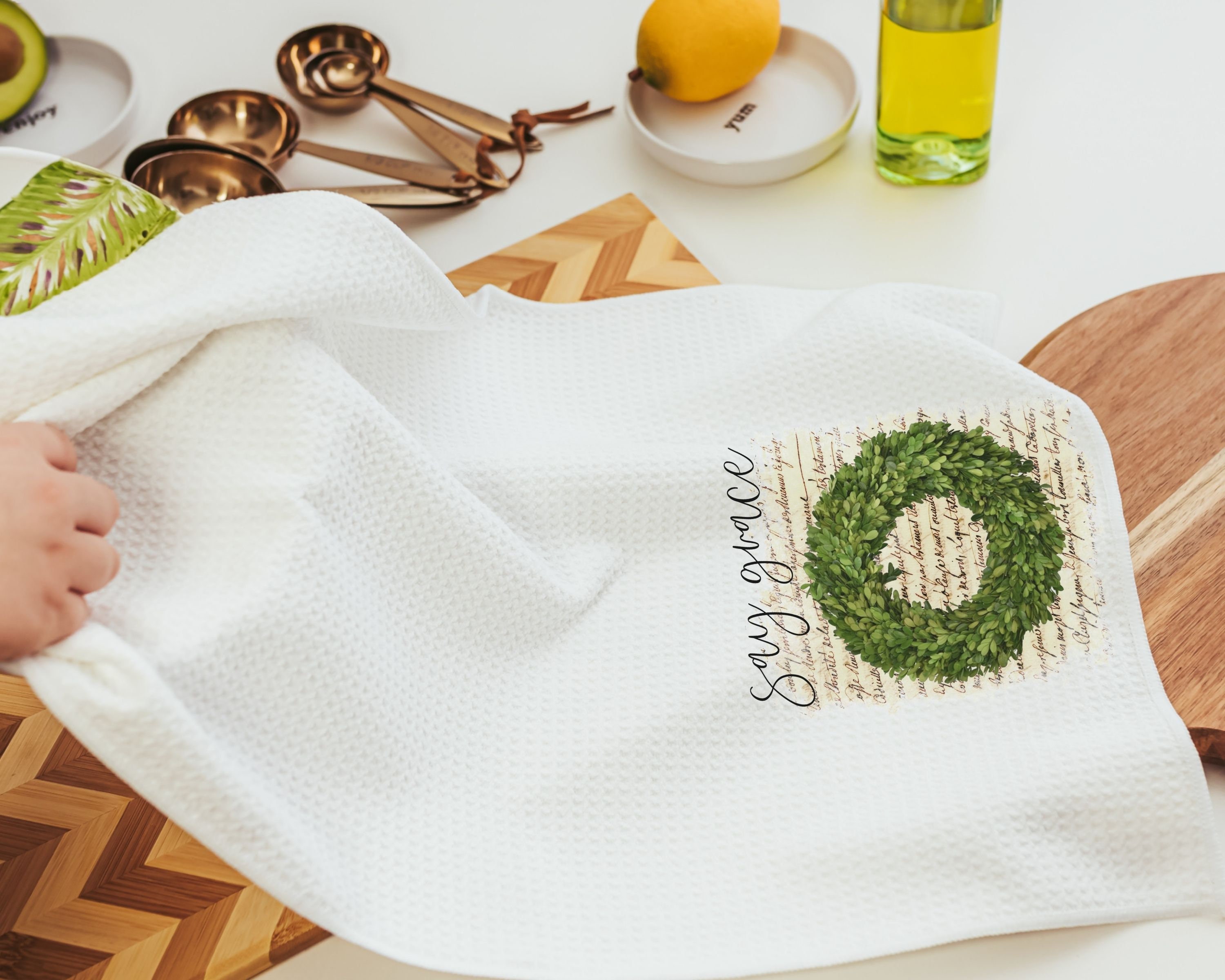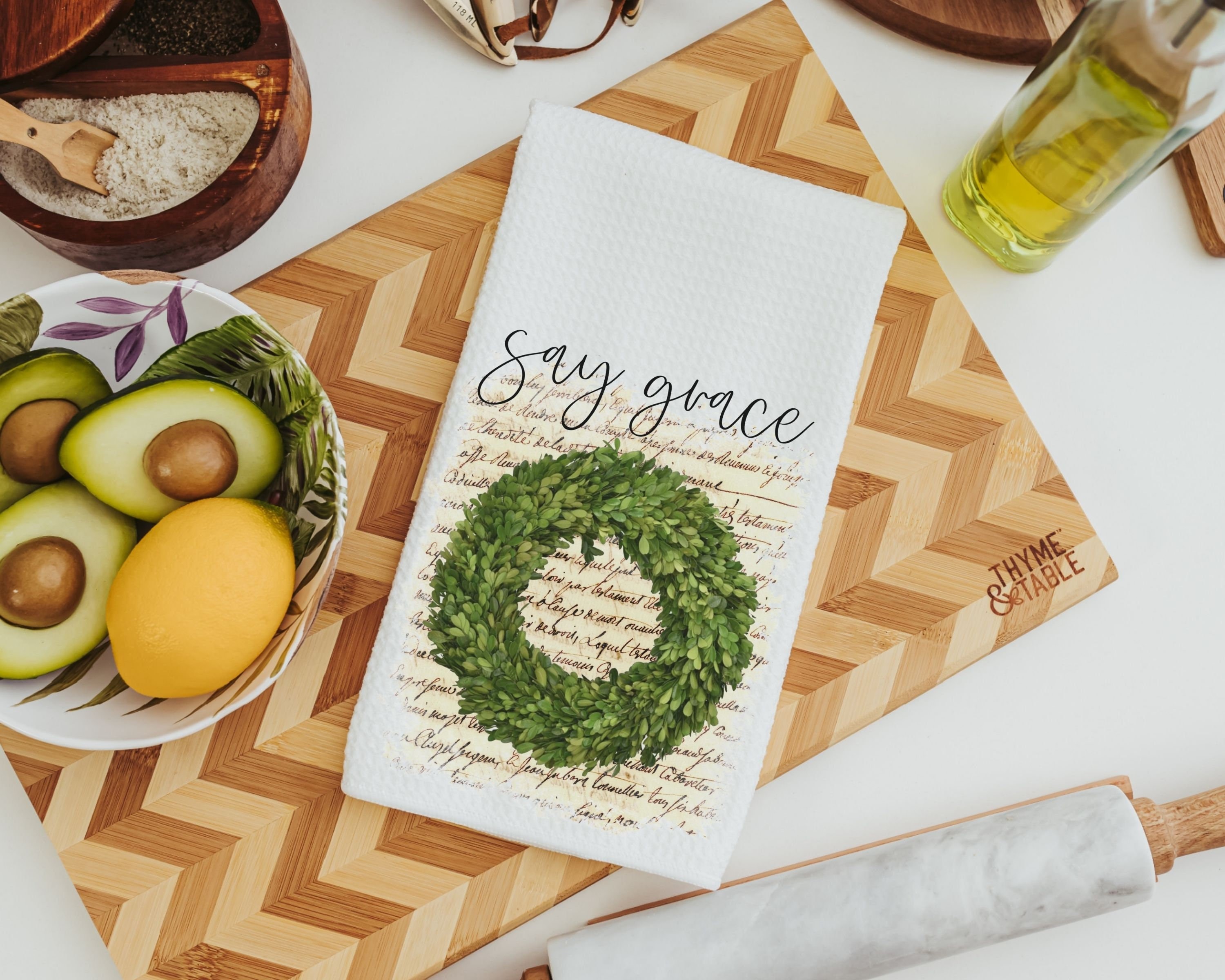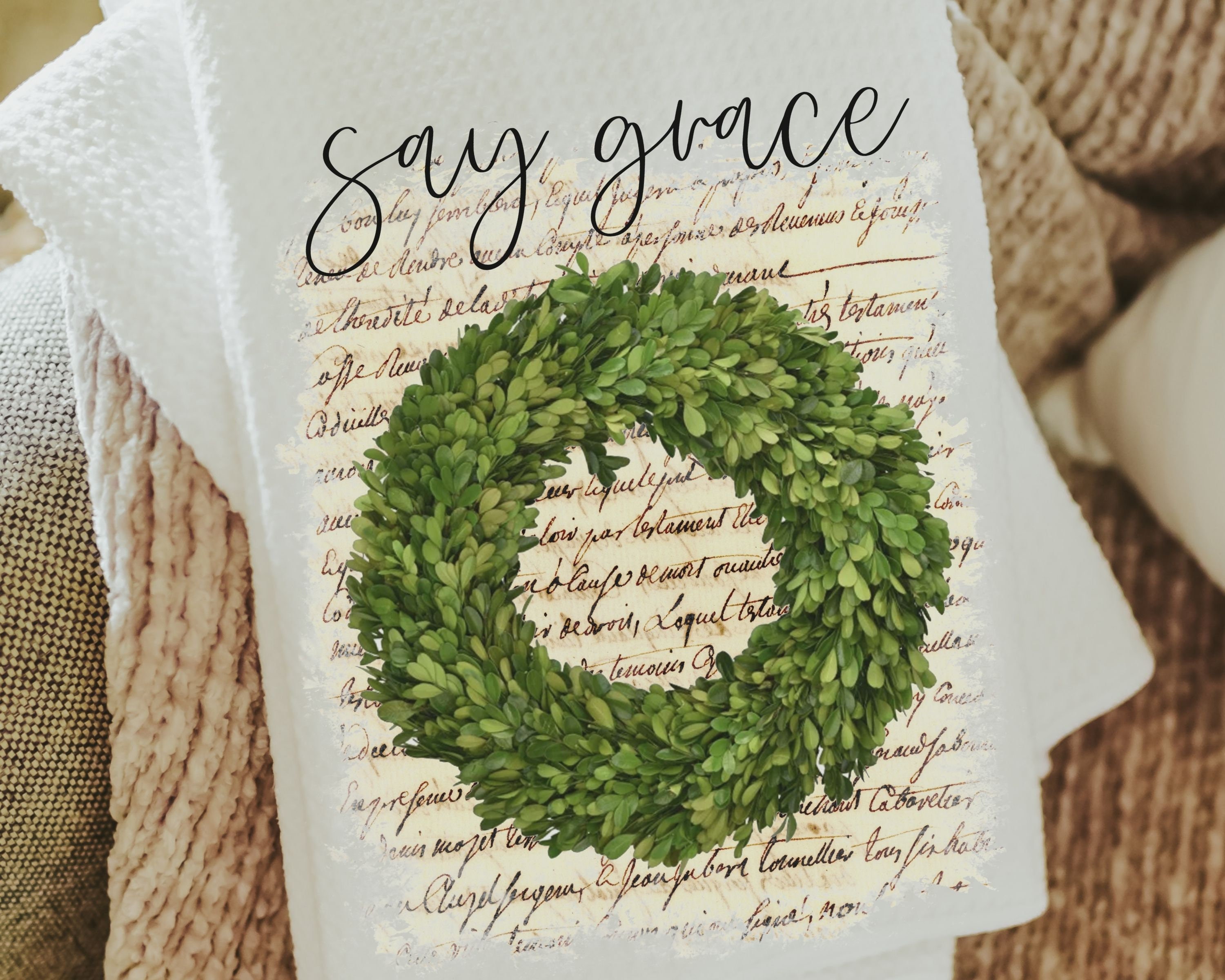 say grace farmhouse kitchen towels, Christmas gifts for Mom from daughter, stocking stuffers for women, Christian gifts for home, dish towel