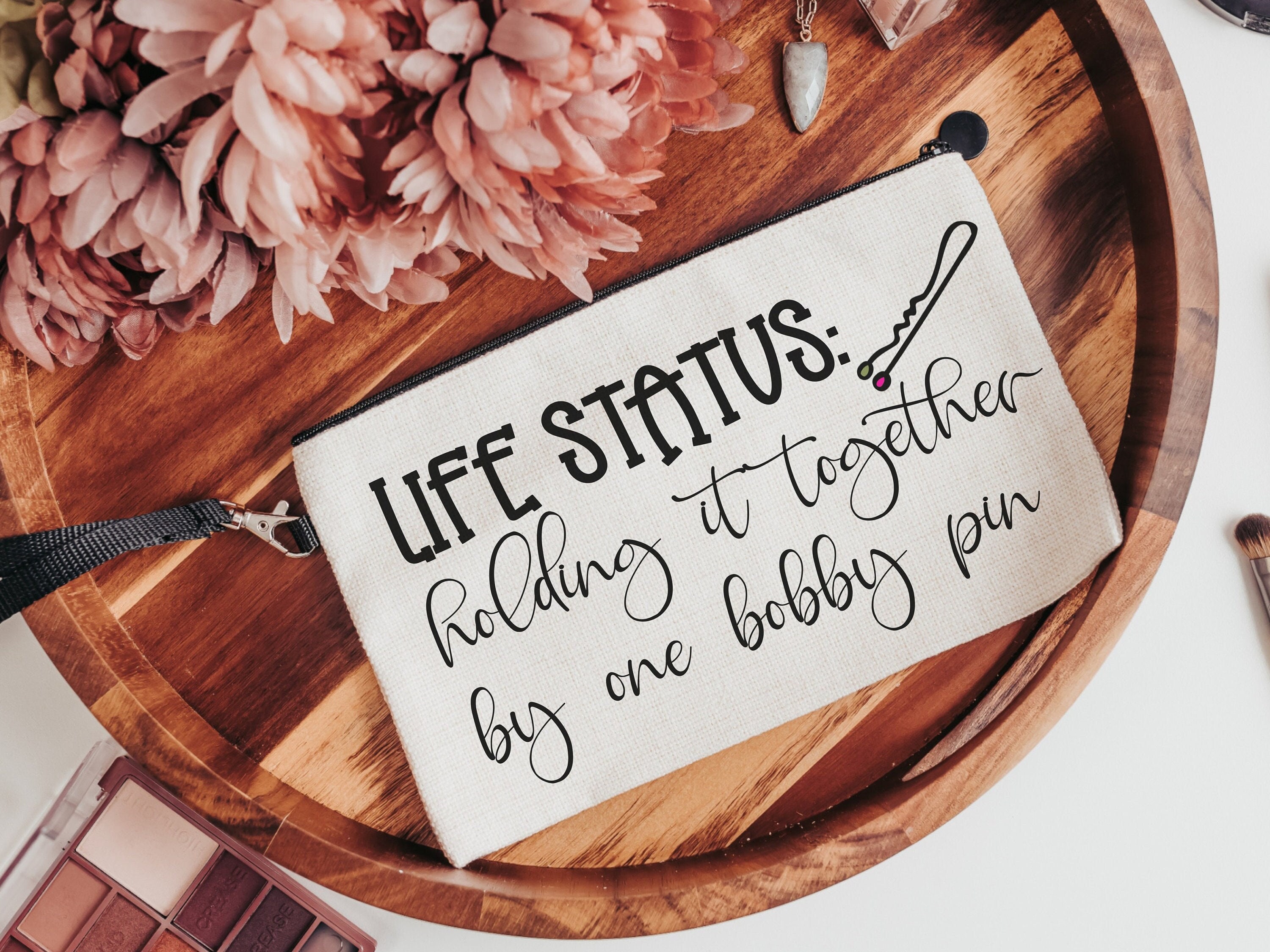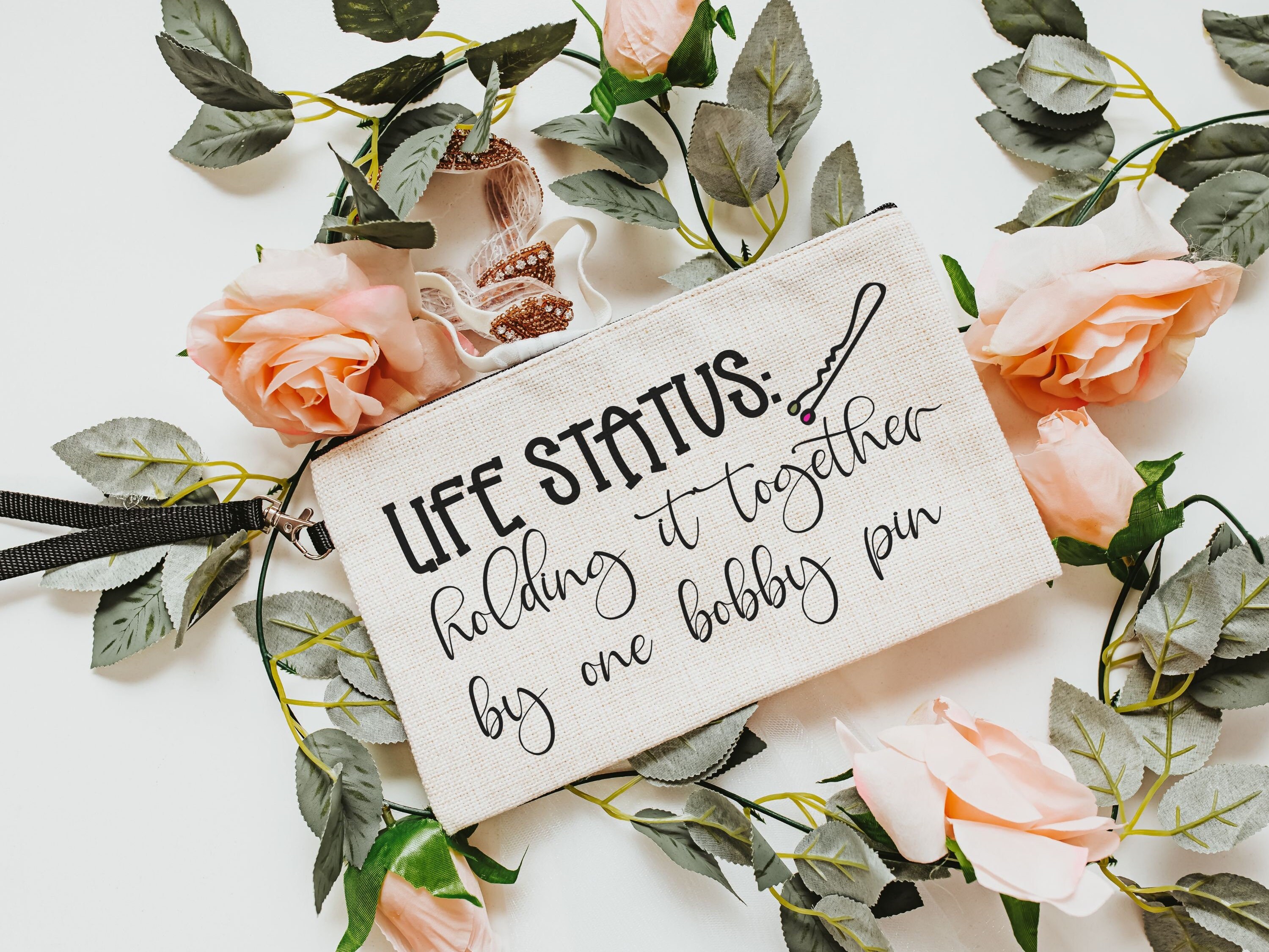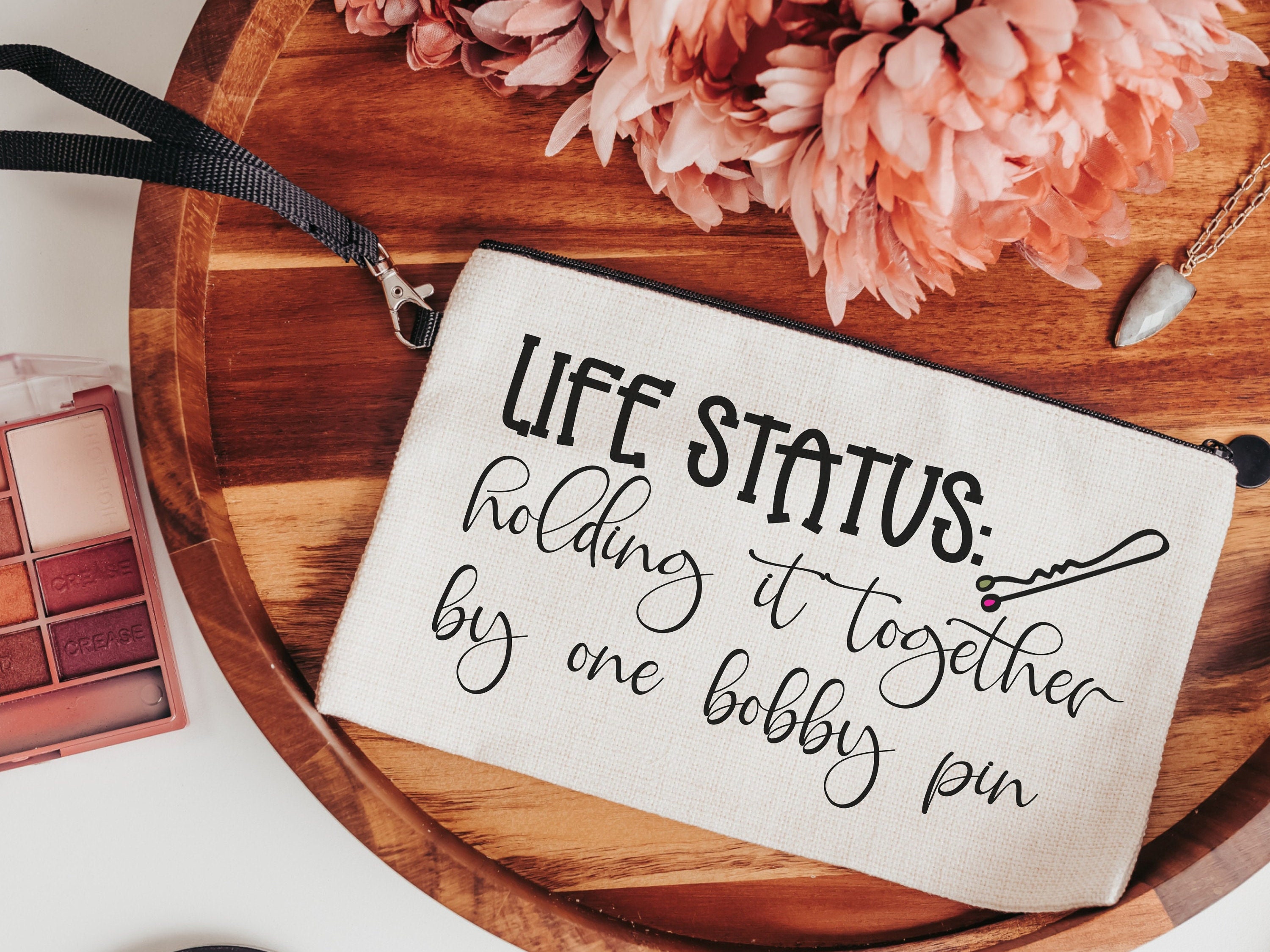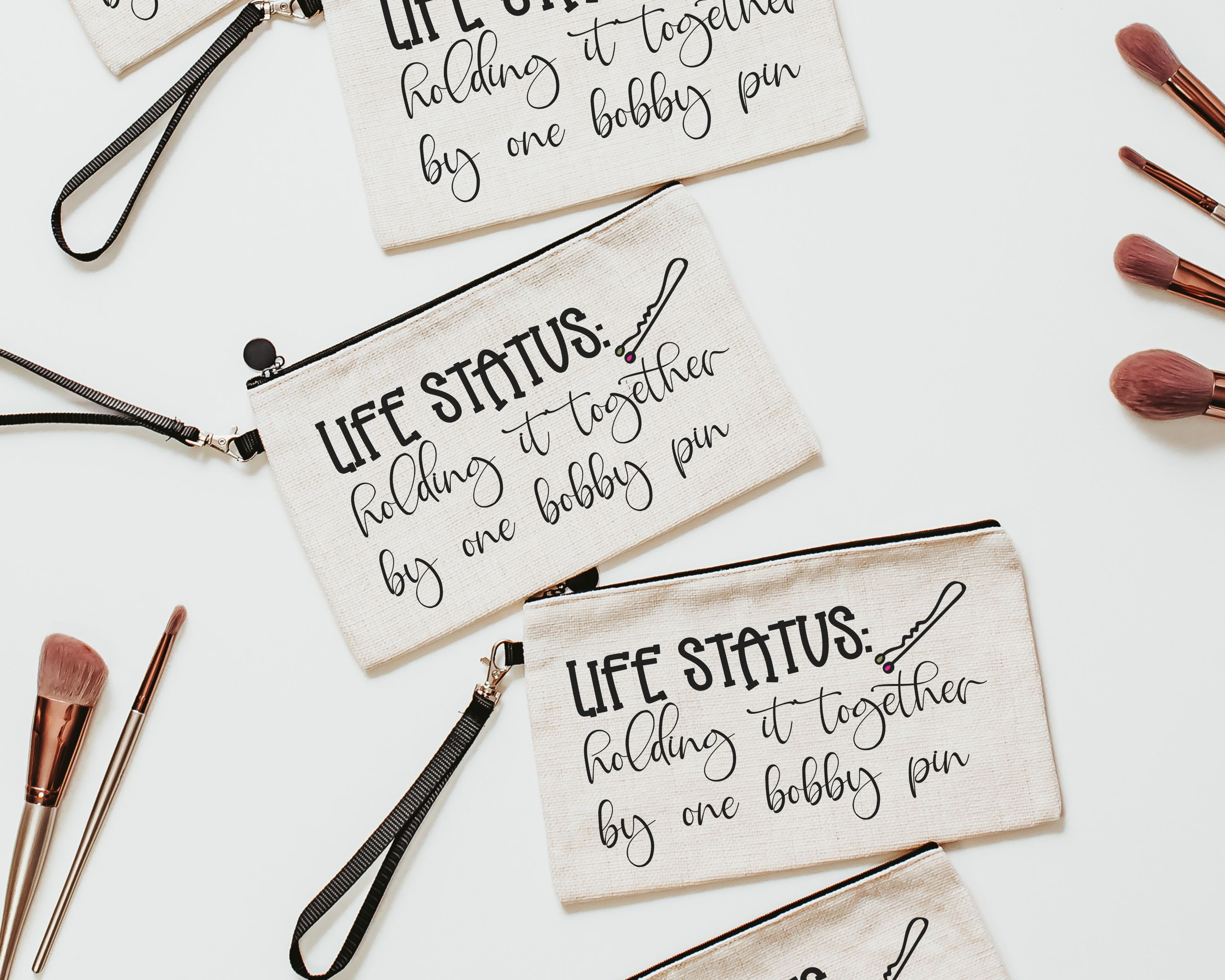 “Just Winging It—Life, Eyeliner, Everything” is the perfect little pick-me-up for your purse or as a thoughtful gift. This funny makeup bag makes a cute wristlet for daily use, a unique bridesmaid or thank-you gift, and a fun surprise for makeup lovers, moms, or anyone just trying to keep it together.