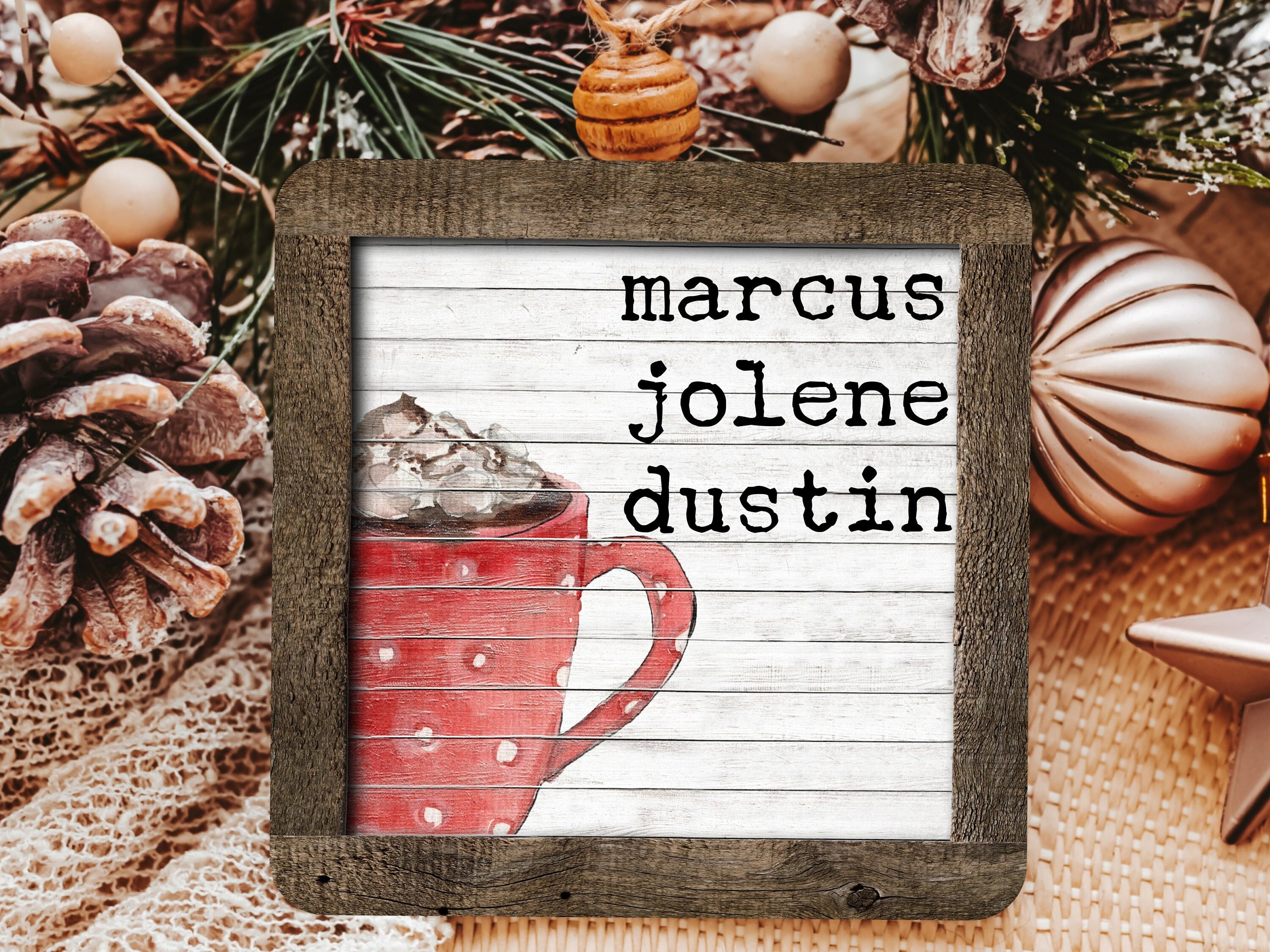 Celebrate the holidays with our Personalized Hot Chocolate Ornament for 2025, perfect for adding a sentimental touch to your tree. This square wood ornament makes a cute family name ornament or hot cocoa stocking tag for kids. Ideal as a sentimental Christmas gift for grandparents or loved ones, it’s a charming addition to your holiday decor and a thoughtful keepsake for years to come!